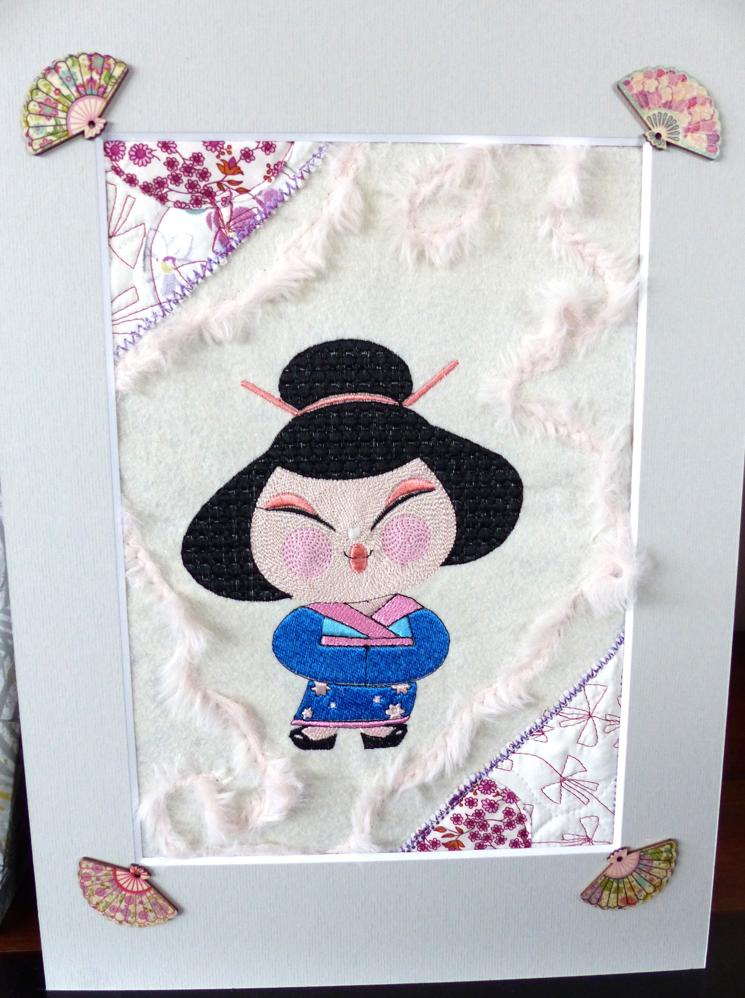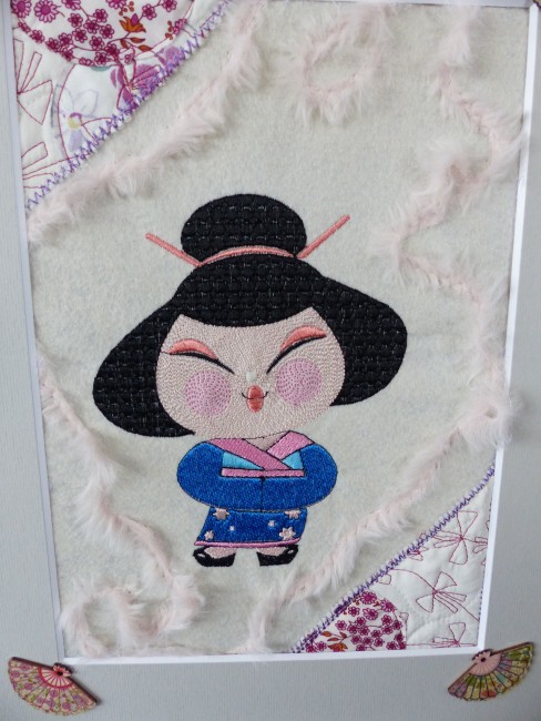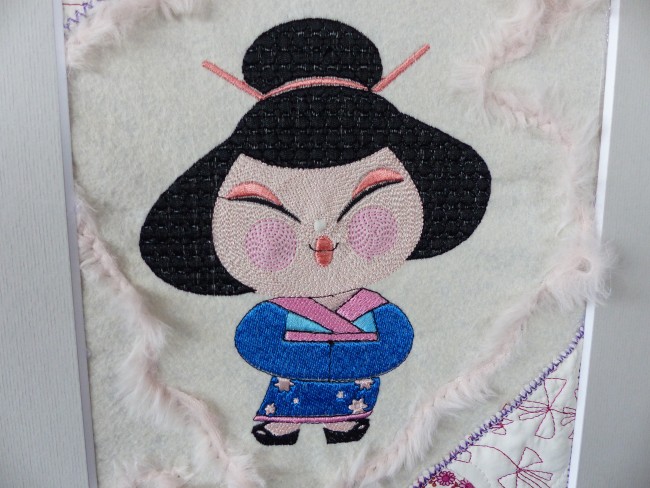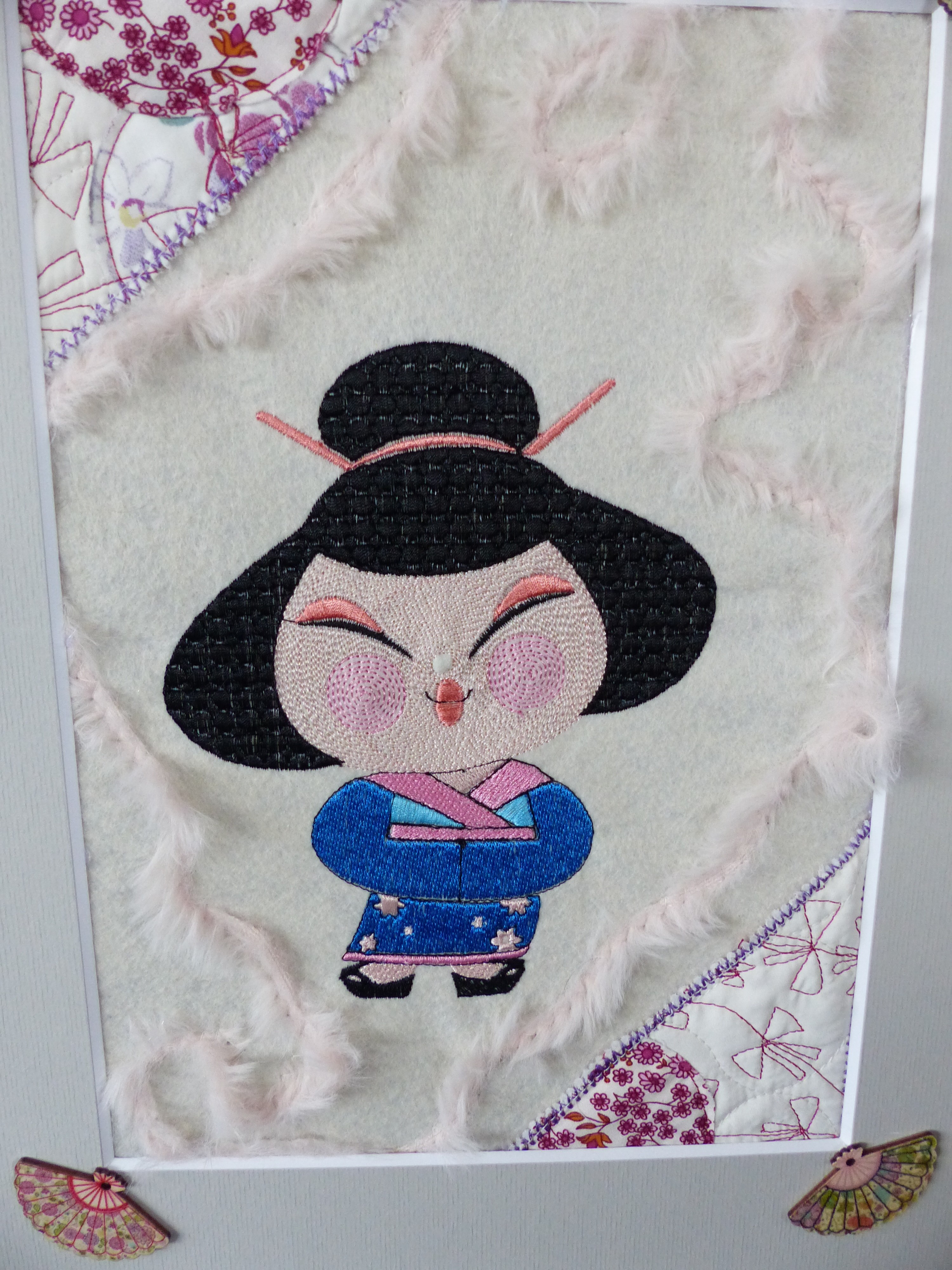 Toile Kokeshi 2 brodée, réalisée en broderie avec motif créé PE DESIGN 11 , avec coins quilting libre pour fantaisie.