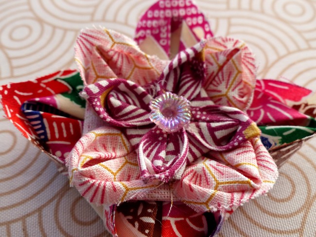 Fleur Kanzashi réalisée main avec des chutes de tissu dans les tons de rose/violet.