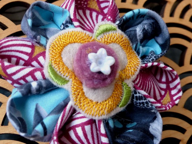 Fleur kanzashi dans les tons de bordeaux-bleu, avec le coeur de la fleur brodé pour plus de raffinement.