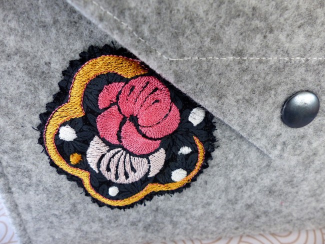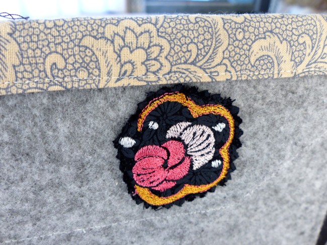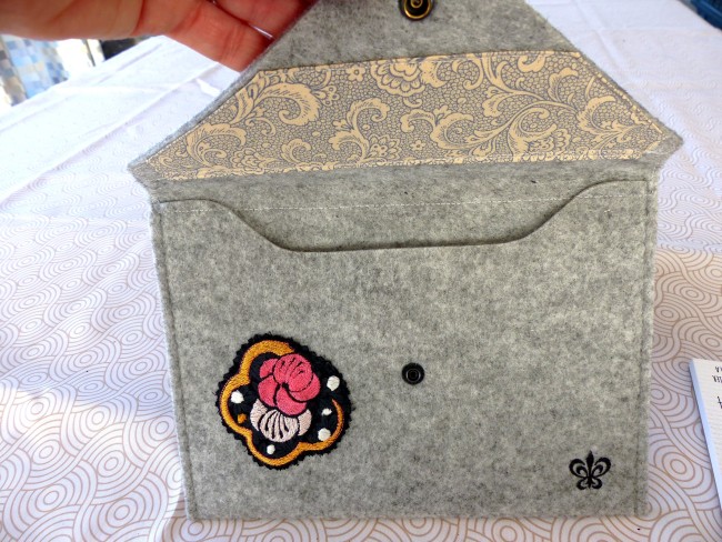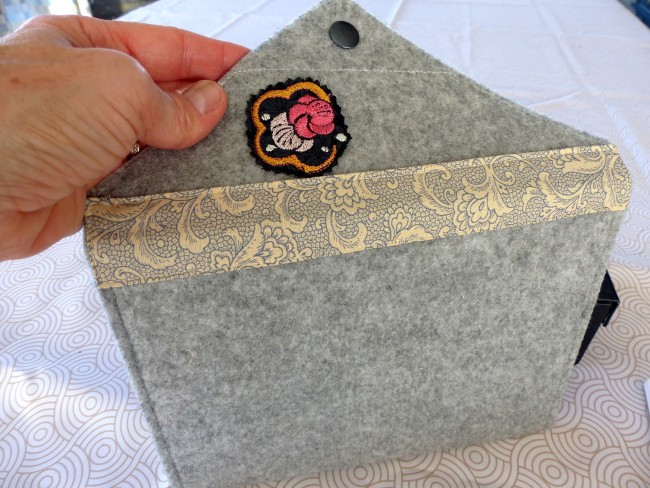 Pochette feutrine réalisée main avec ses deux appliqués brodés en rajout "Emblème japonaises"sur le devant ainsi qu'un petit bandeau en tissu style ancien.