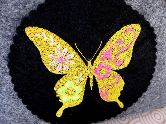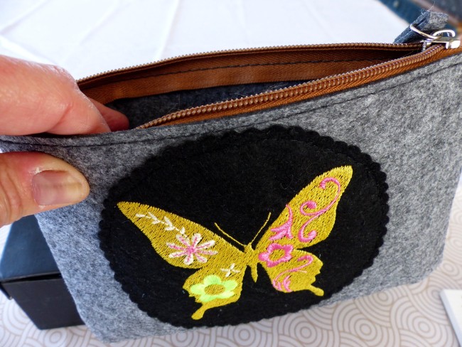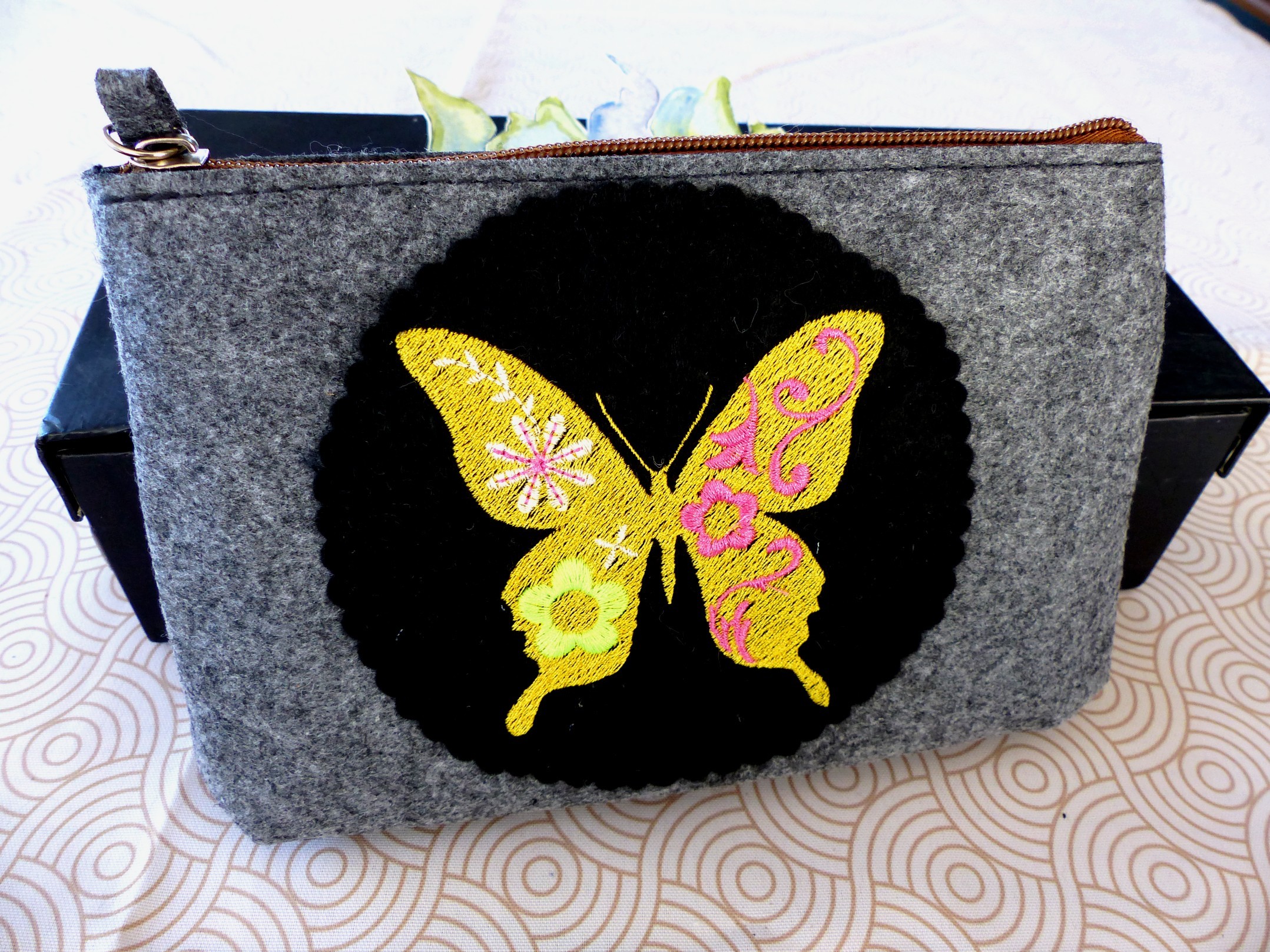 Trousse feutrine grise clair sur lequel vient s'apposer un rond feutrine noir et papillon brodé en fil jaune doré, rose et vert fluo pour embellissement. Rangement de petites affaires de maquillage ou autre ...