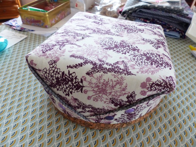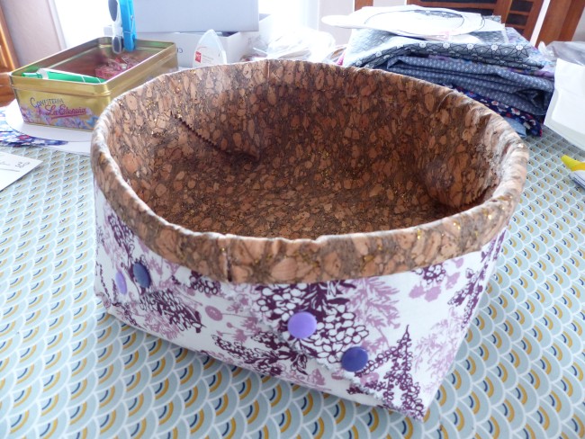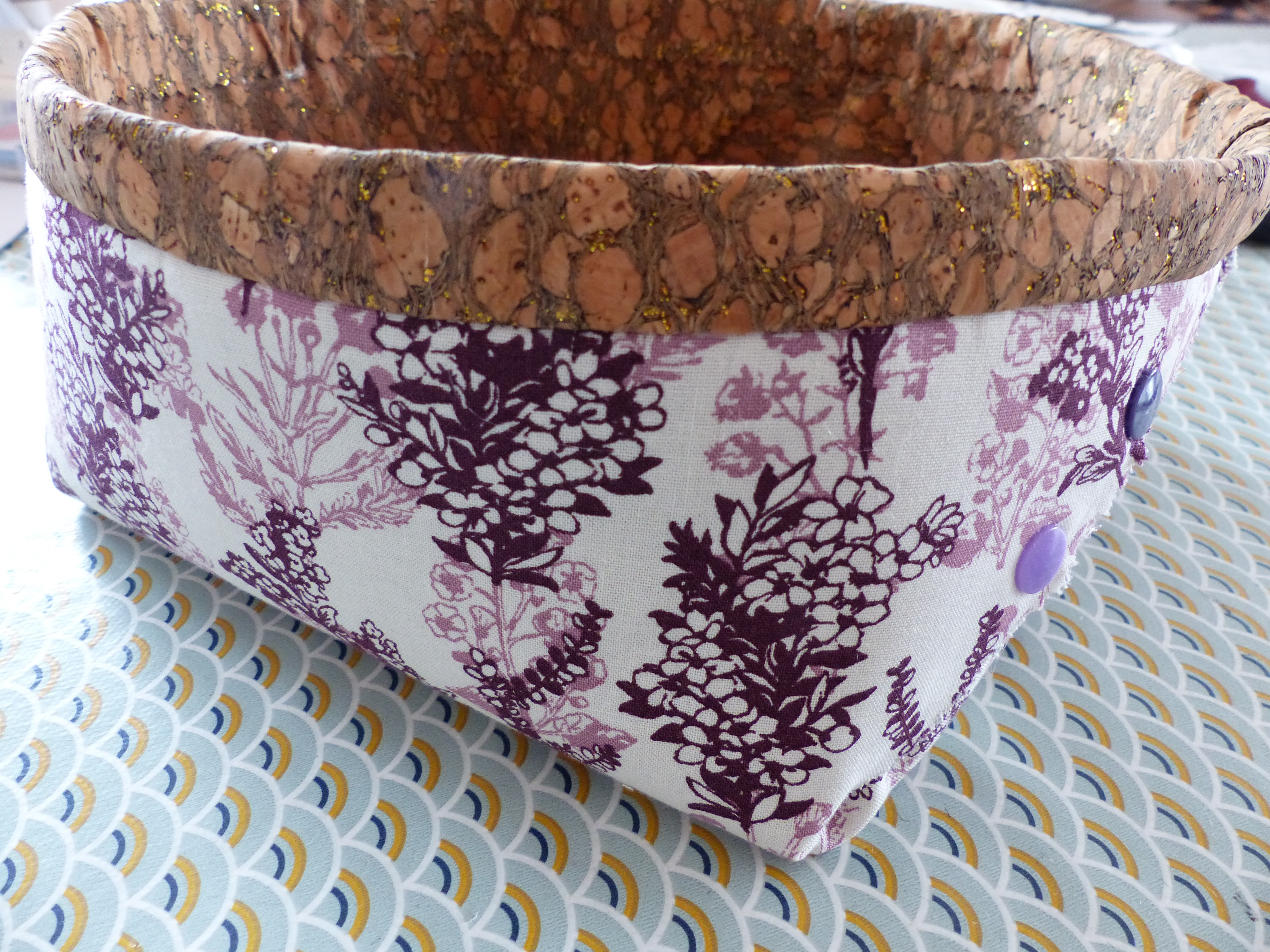 Panière en tissu liège pour l'intérieur et tissu coton aux dessins fins violet et blanc cassé feuillage fin aux extérieures.