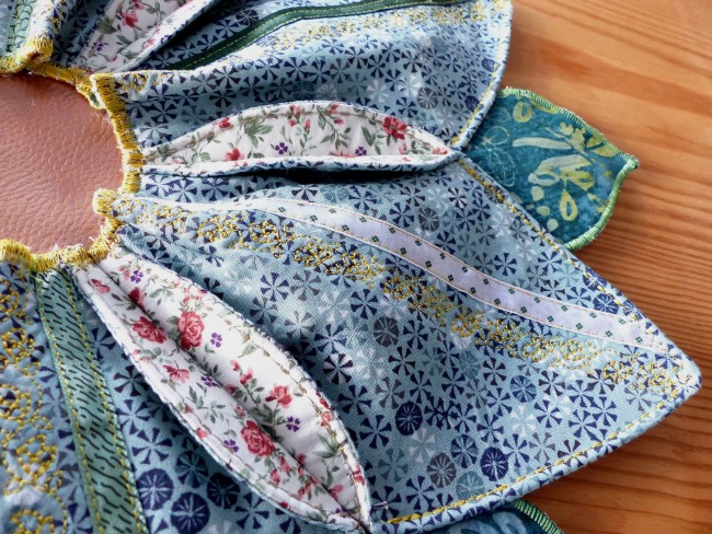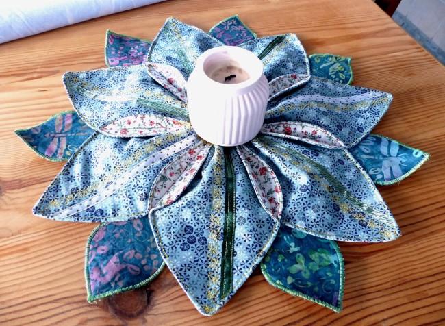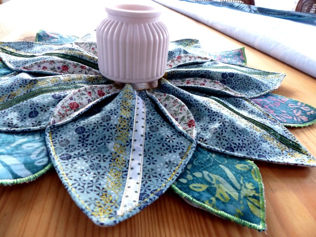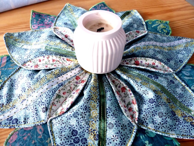 Napperon de table "grande fleur" réalisé avec des coutures et de l'assemblage de ronds pour donner un ravissant résultat de deux tissus ornés de broderies en supplément pour apporter de la fantaisie à l'article.