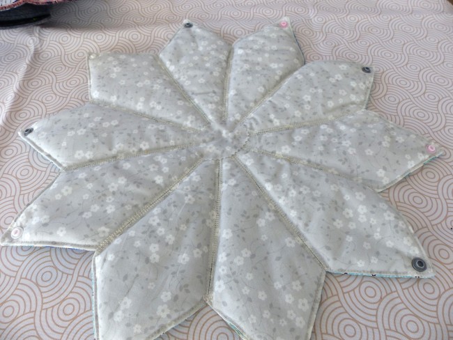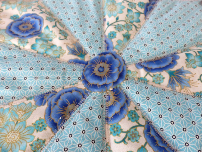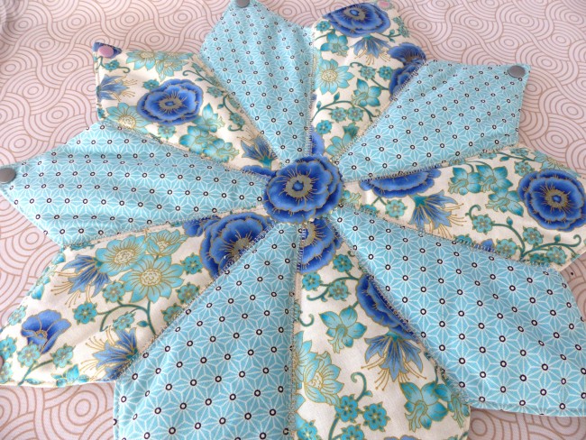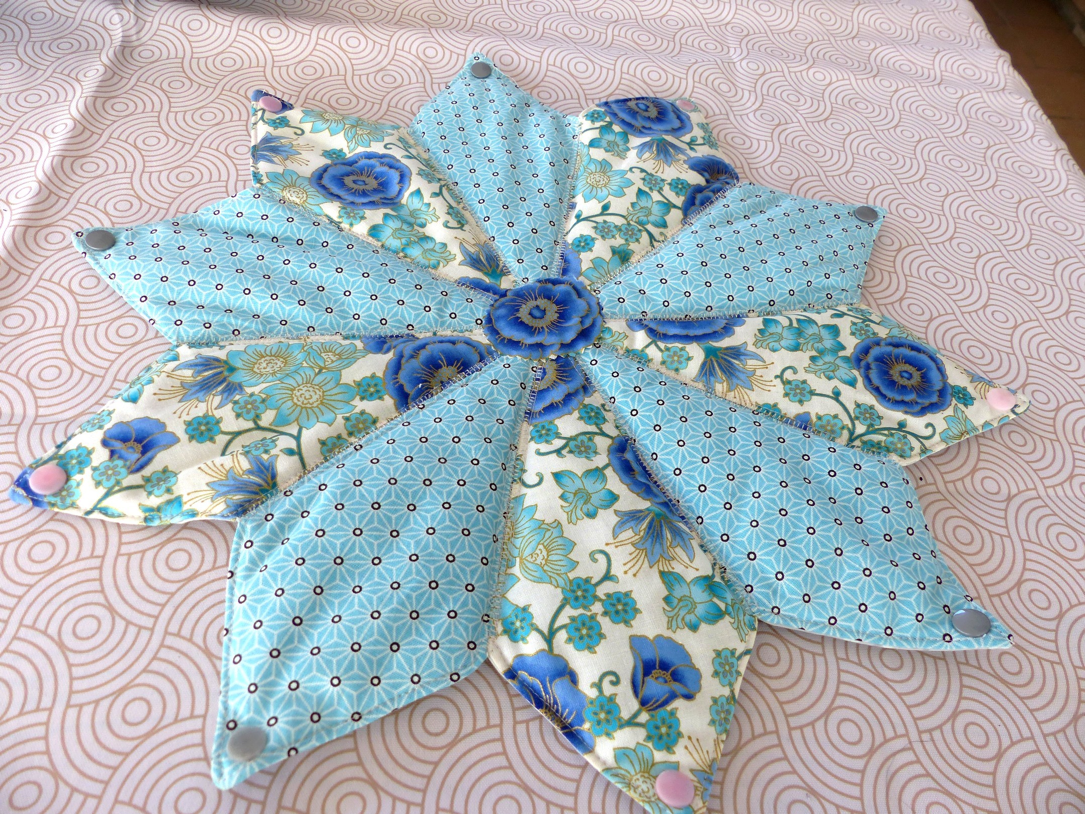 Napperon réalisé avec de beaux tissus dans les tons de bleu aux 10 branches étoilées et broderies en rajout pour embellissement.