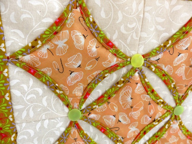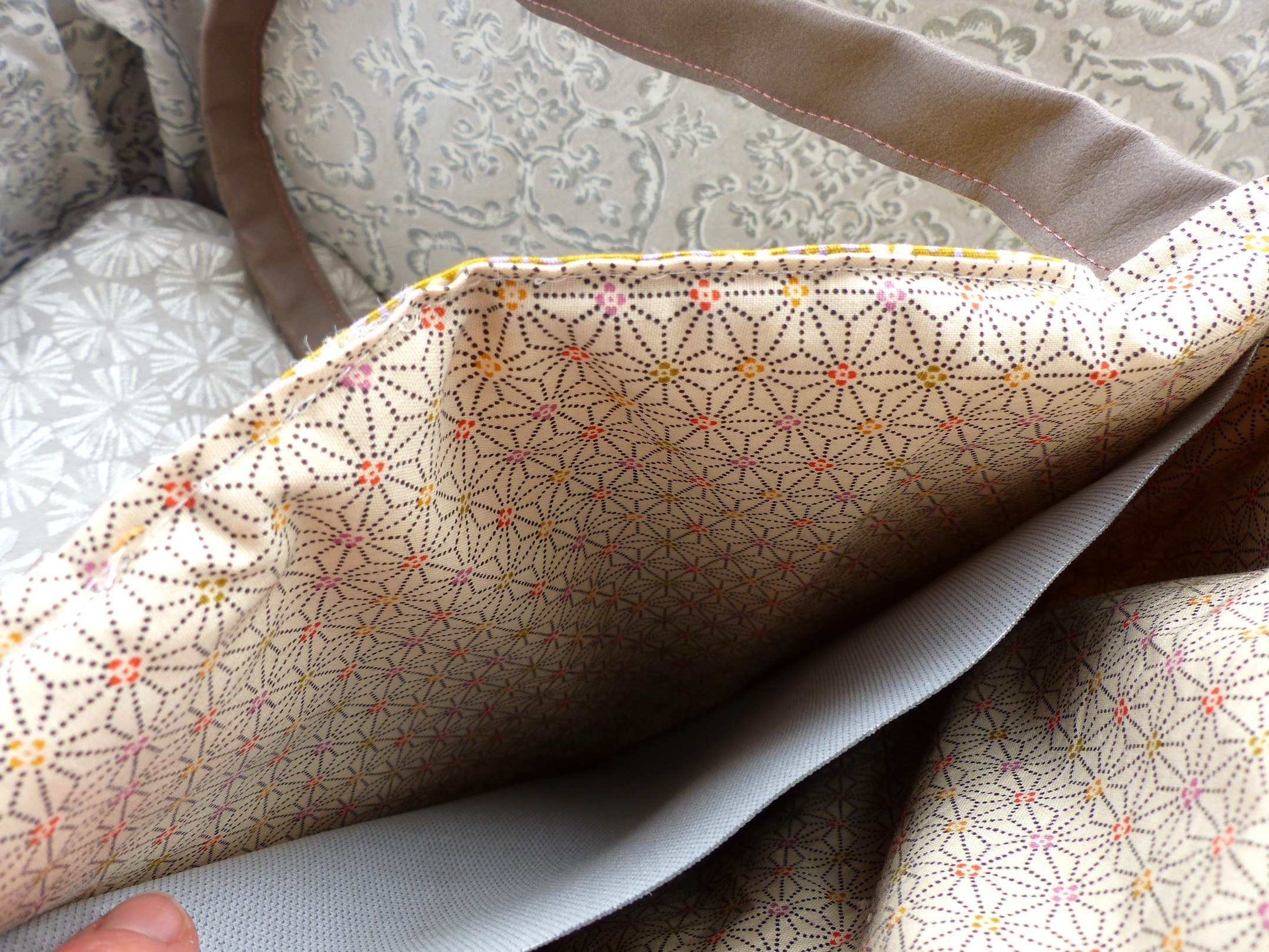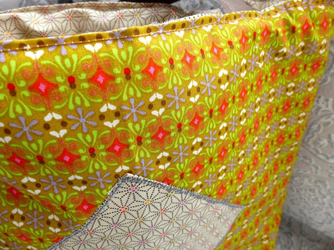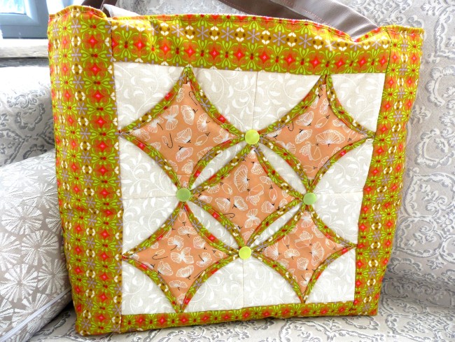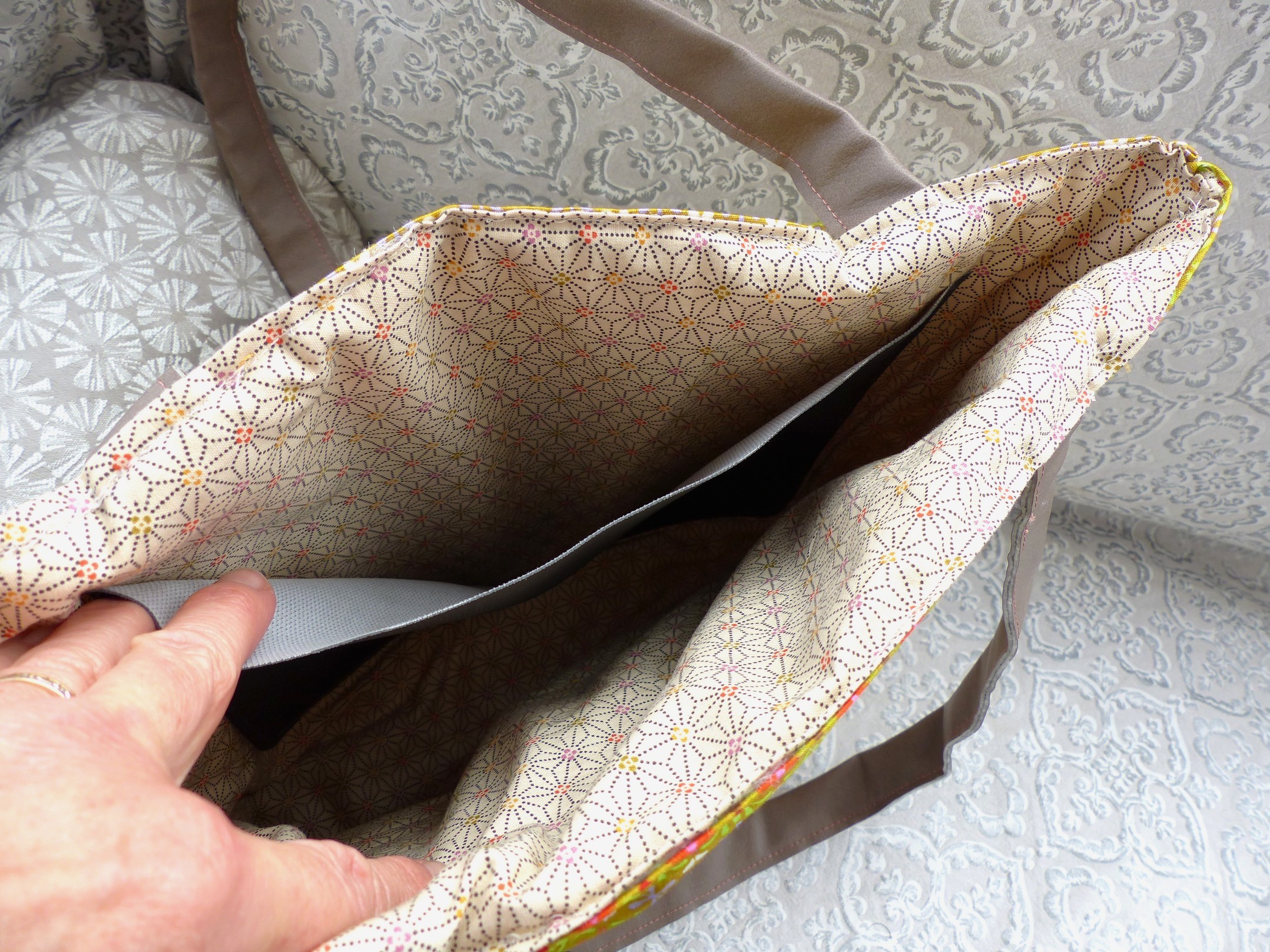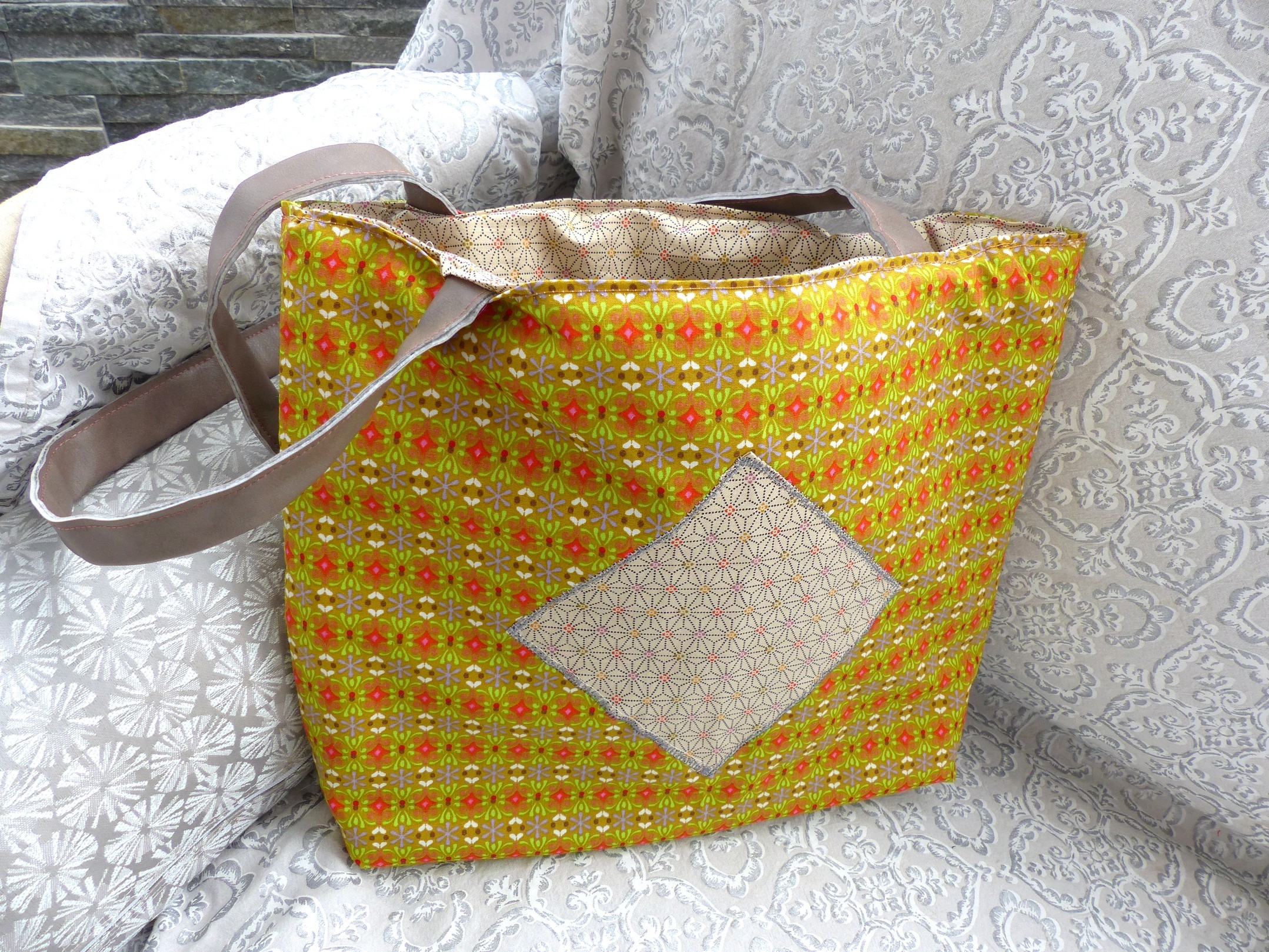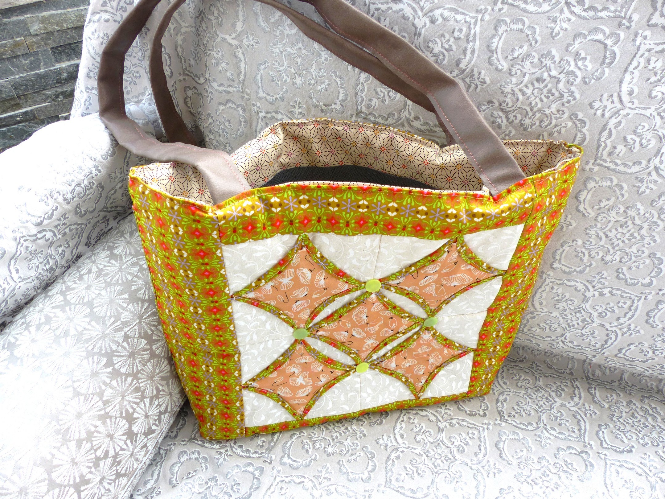 Sac Cabas "effet cathédrale" réalisé main avec ce bel effet de couture dans les tons de vert et orange. Une pochette intérieure principale avec une autre séparation sobre pour séparation.