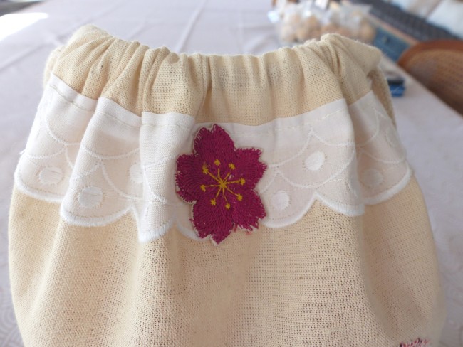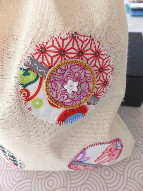 Sac pochon réalisé sur une matière lin-coton avec 3 ronds fleuris "dalhia" dans les tons de bleu-mauve avec une petite broderie fleurette au centre en rajout.