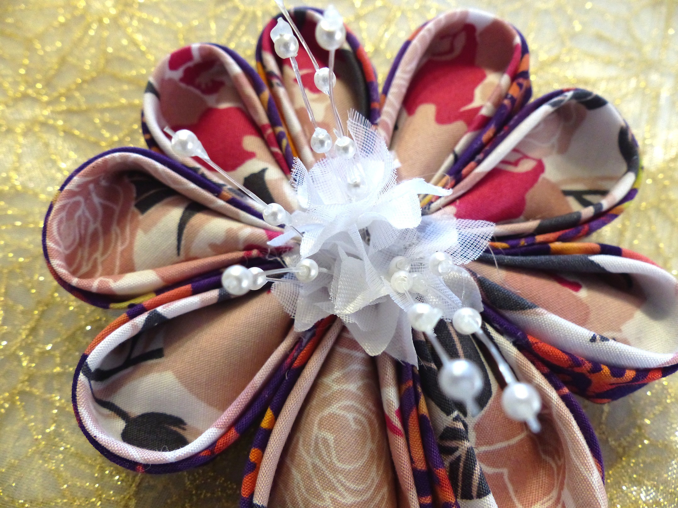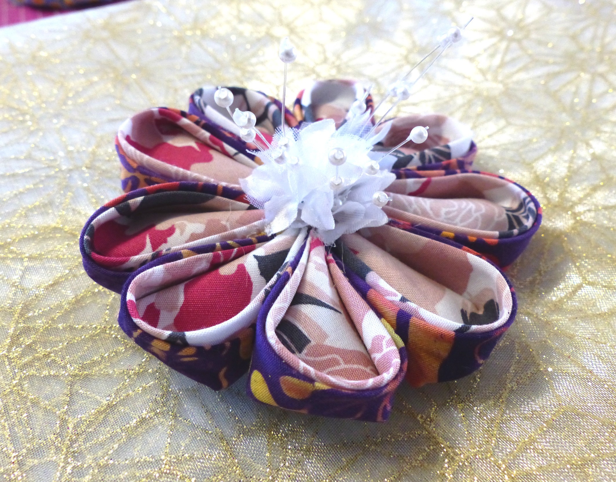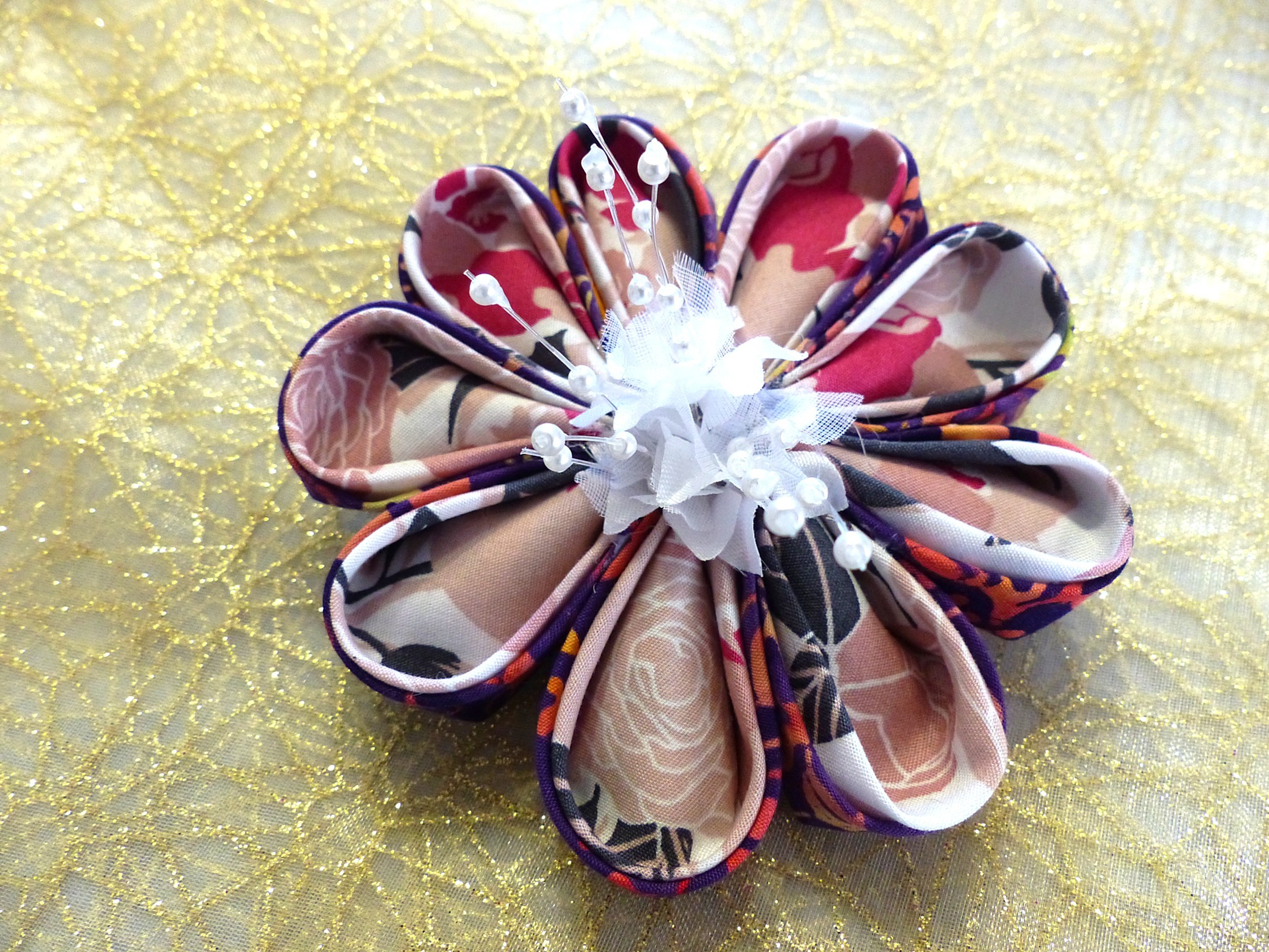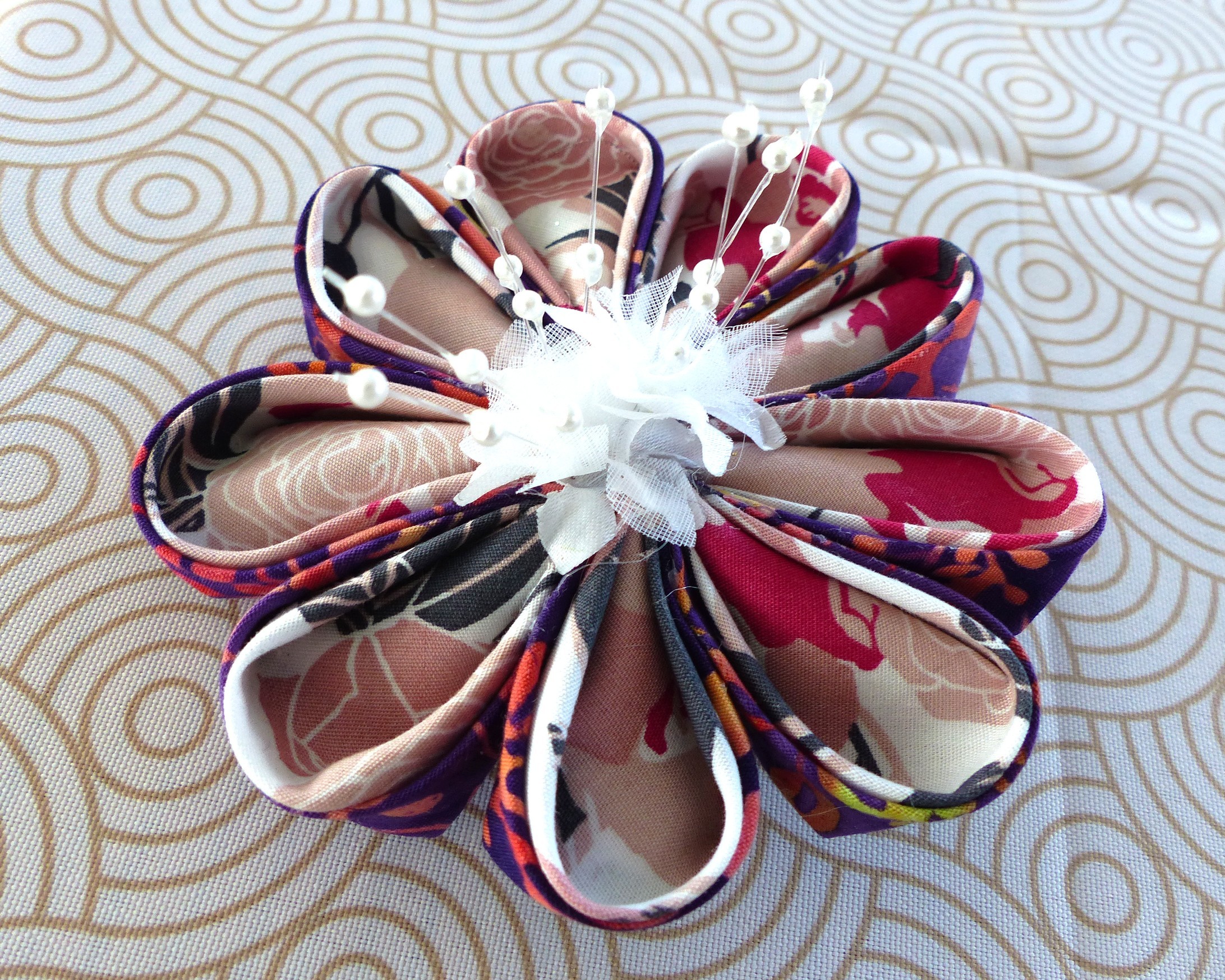 Grande Fleur Kanzashi réalisée main avec ses 9 pétales doubles pour un esthétique coordonné. Au coeur petite fleur blanche et pistils pour réalisme et raffinement.