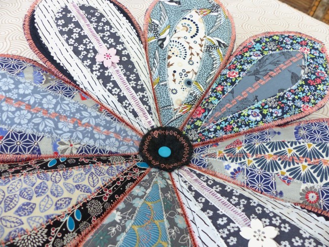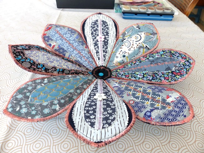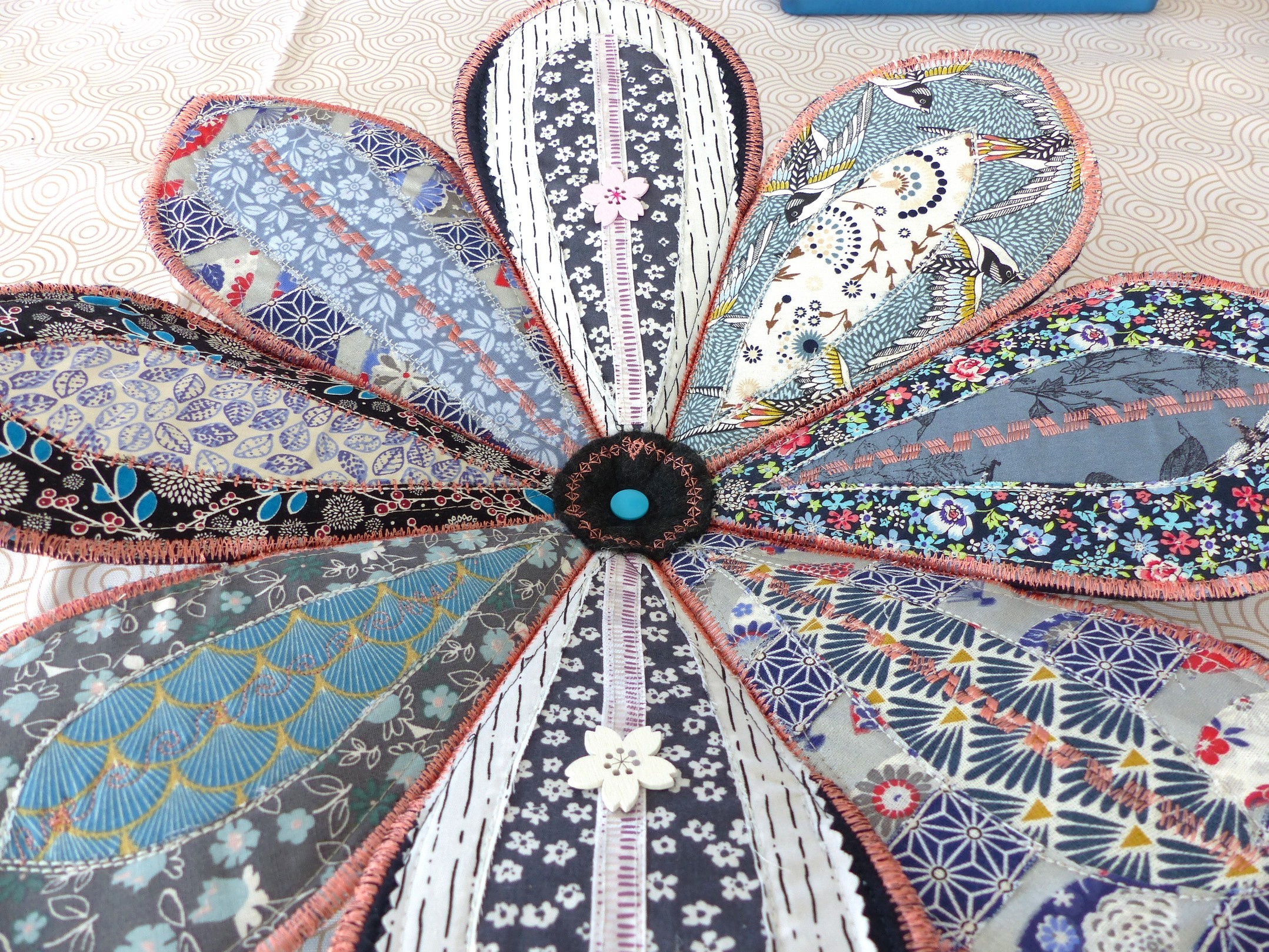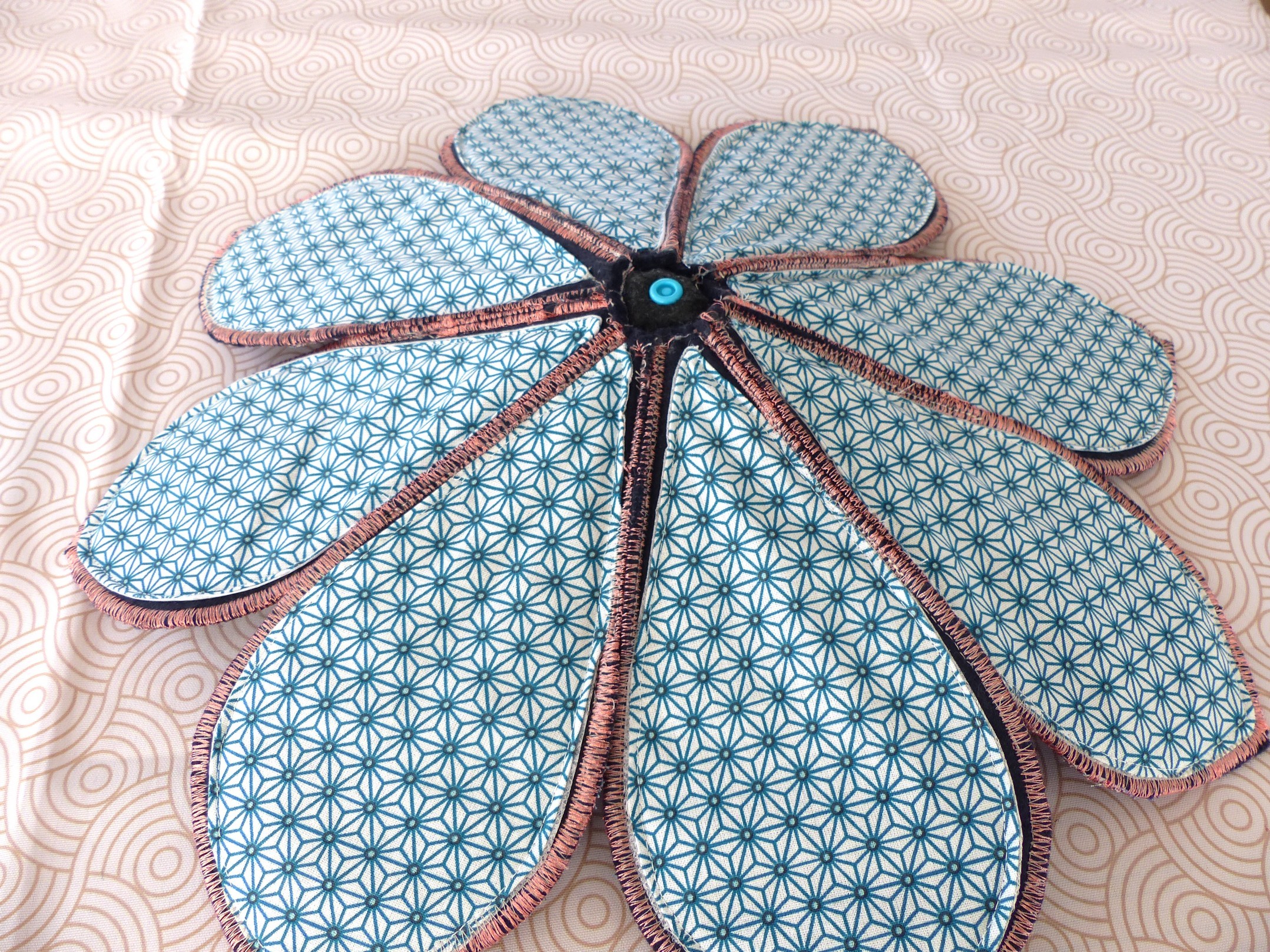 Grande fleur décorative en feutrine,composée de 8 grande pétales en tissu brodé dans les tons de bleu/gris pouvant vous servir de coupelle de table. Support de maintient livré avec pour une bonne tenue, également en feutrine.