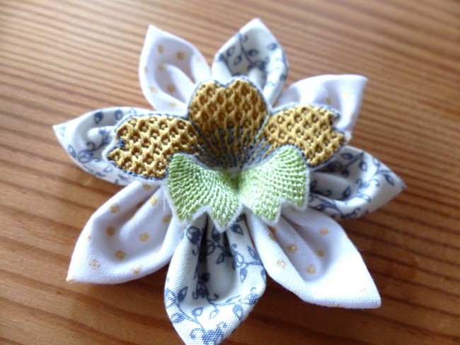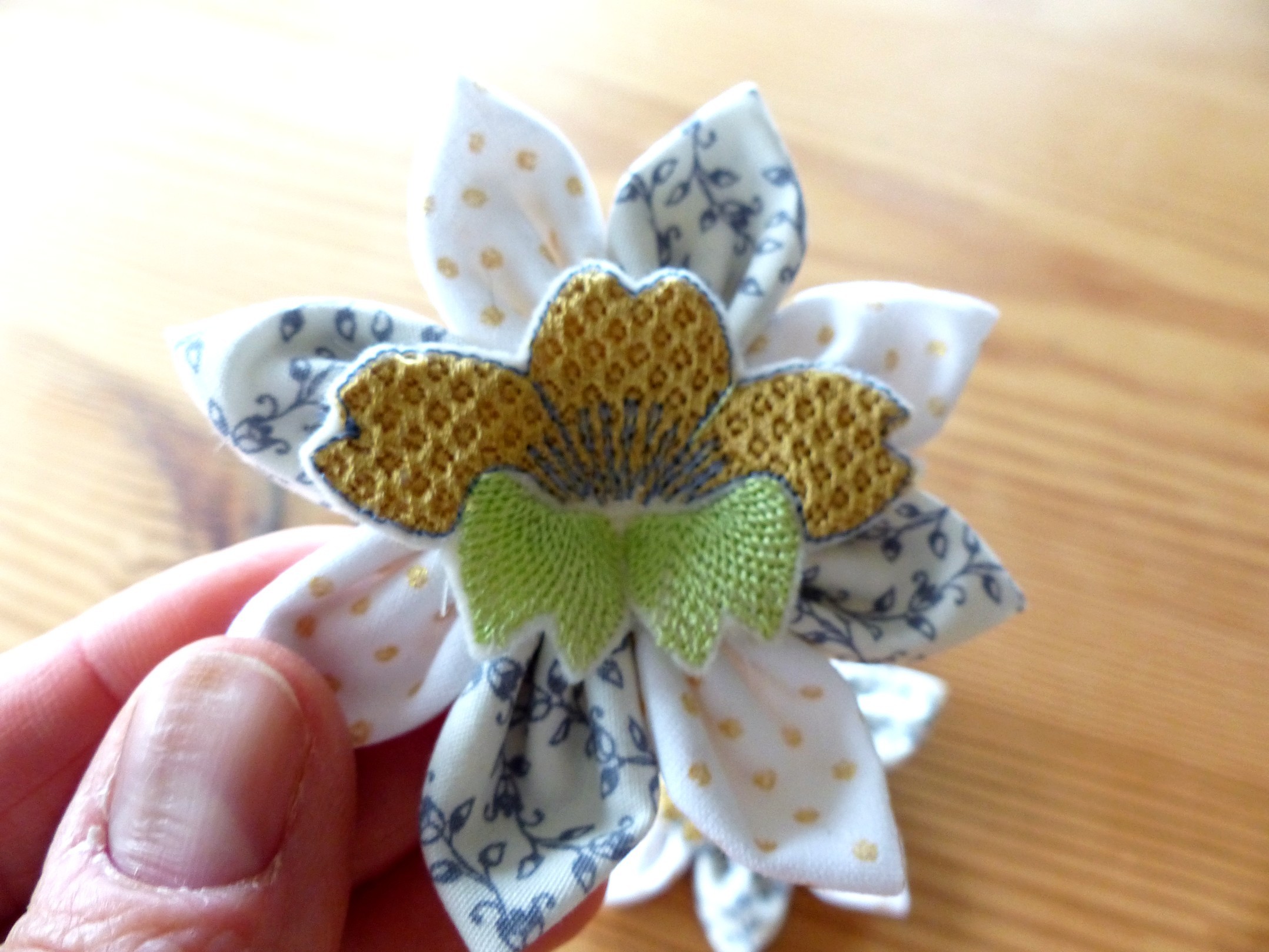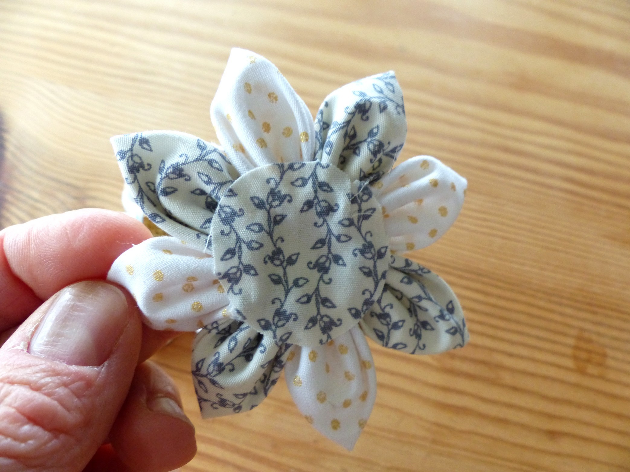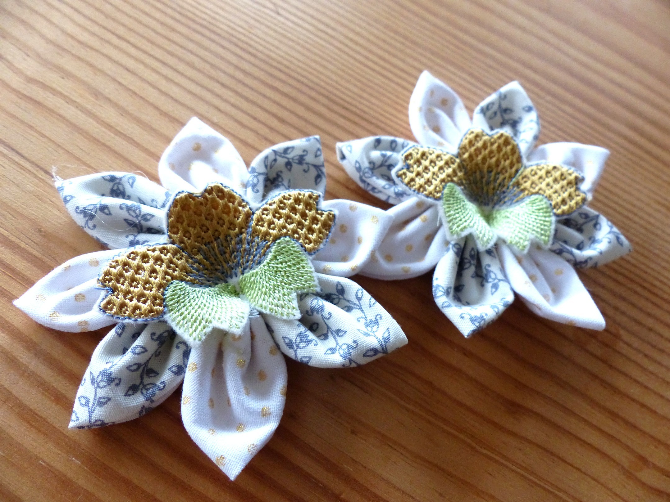 Lot de 2 fleurs Kanzashi avec pétales dans les tons clair doré et gris, nénupars brodé au centre.