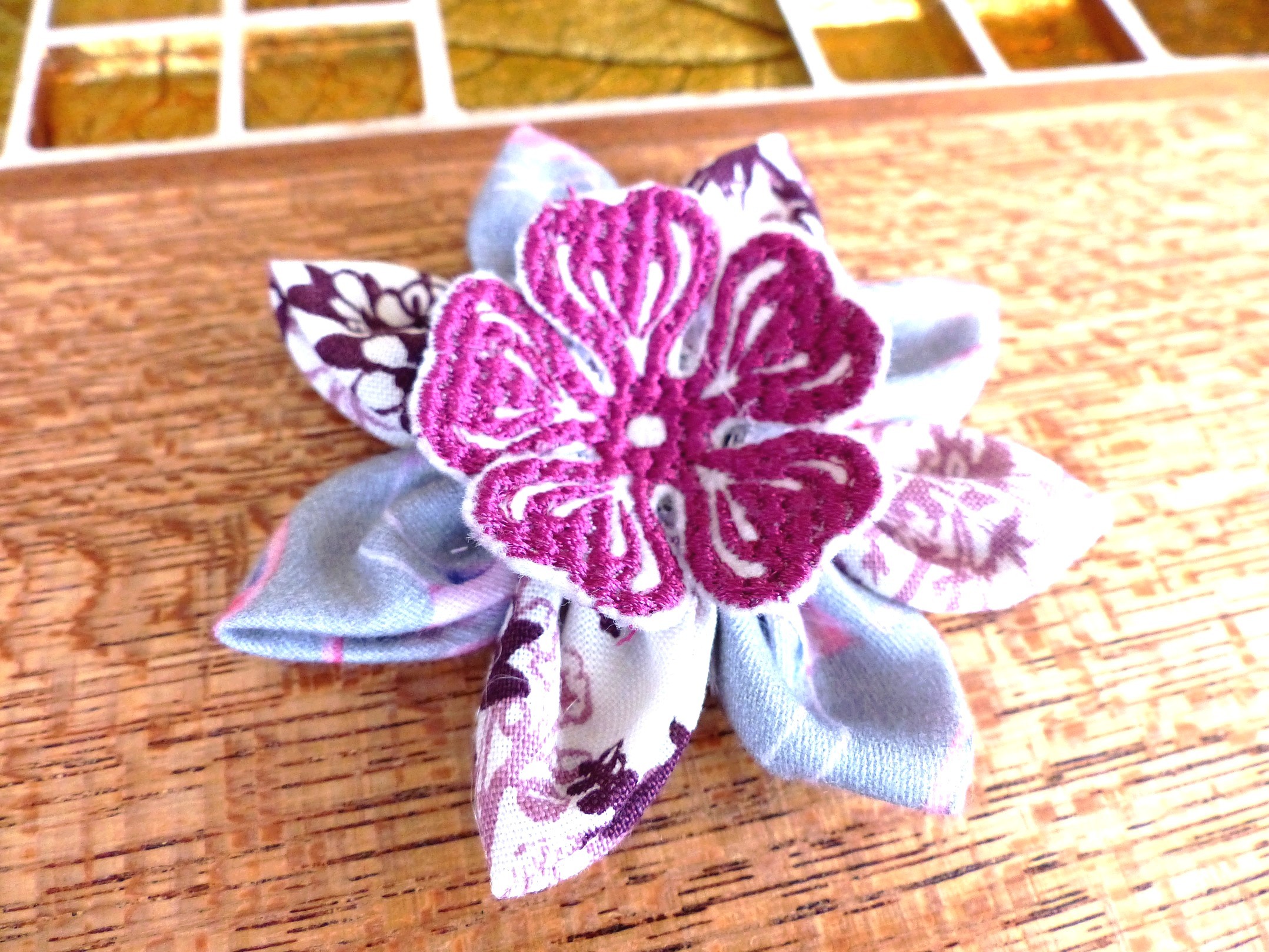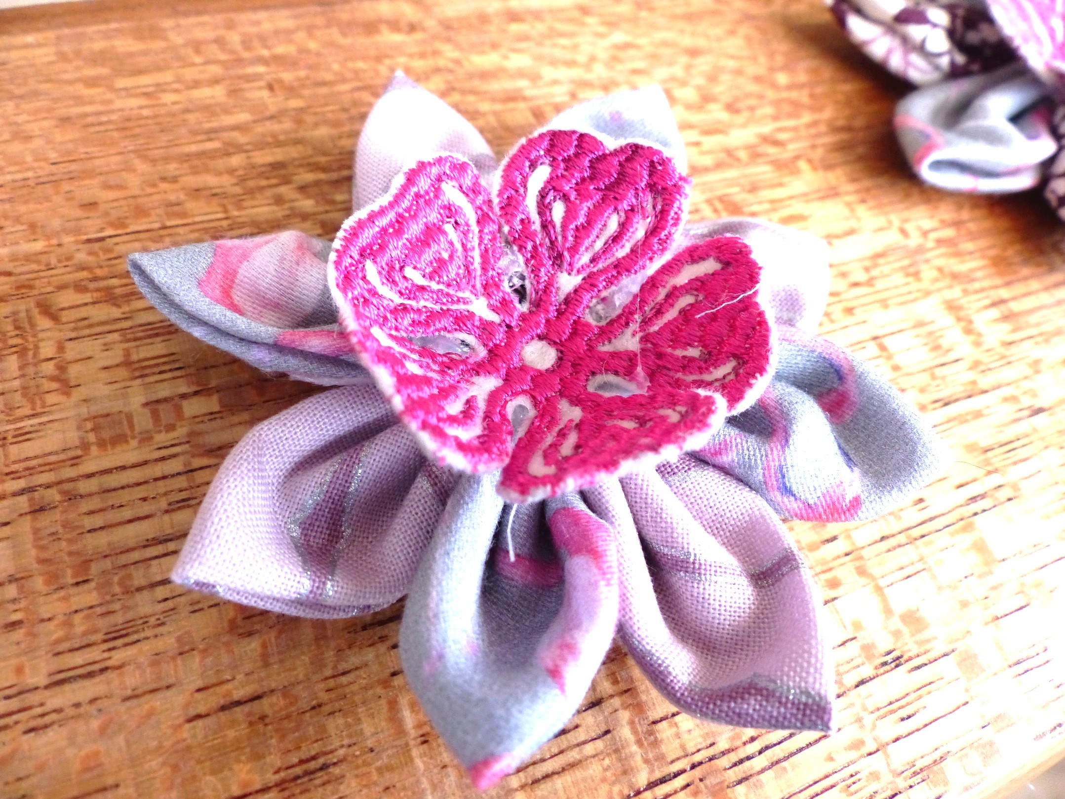 Lot de 2 fleurs Kanzashi dans les tons de rose, au coeur brodé finement pour raffinement suplémentaire.