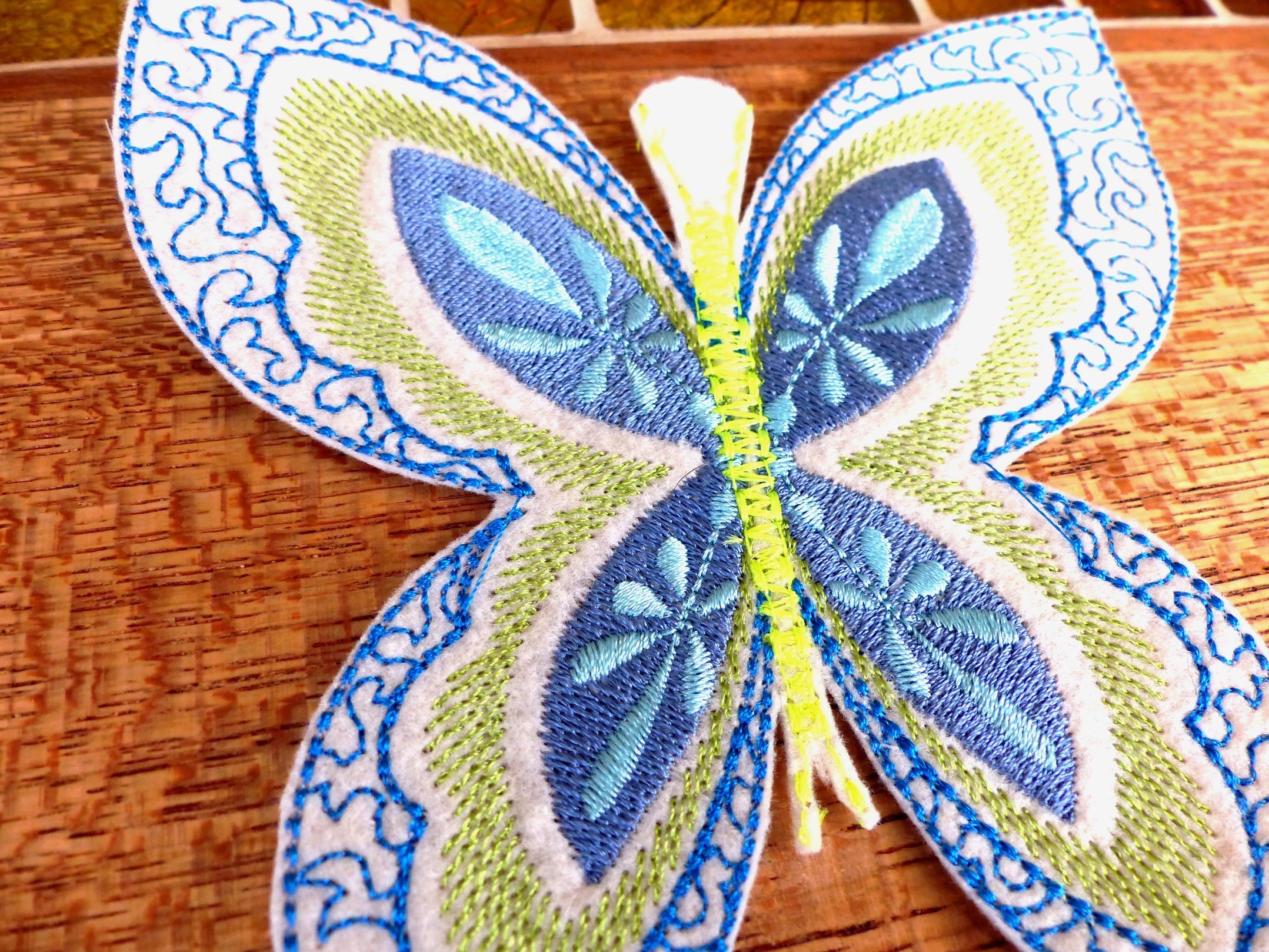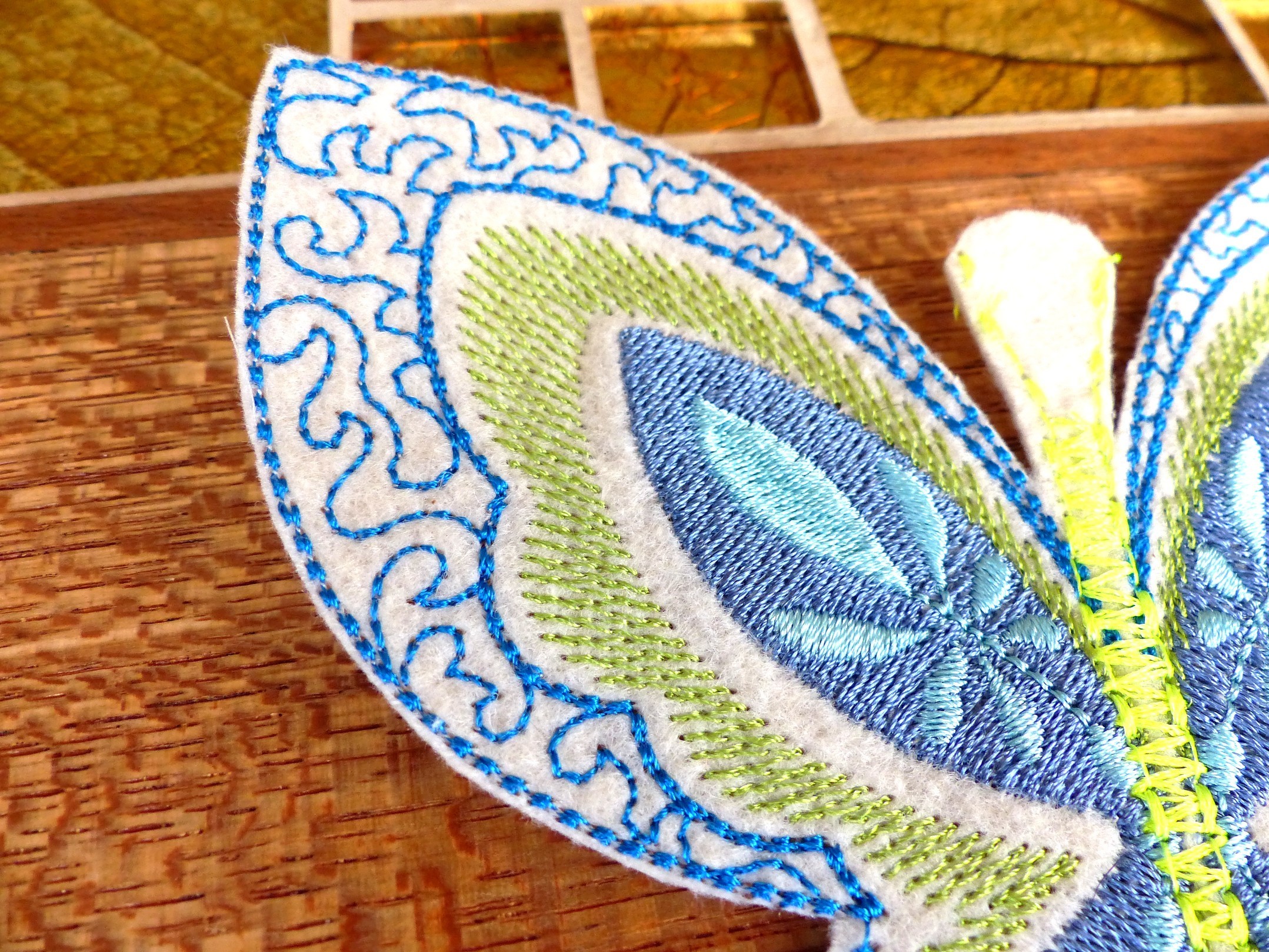 Grand papillon brodé réalisé en appliqué à coudre dans les tons de bleu - vert.