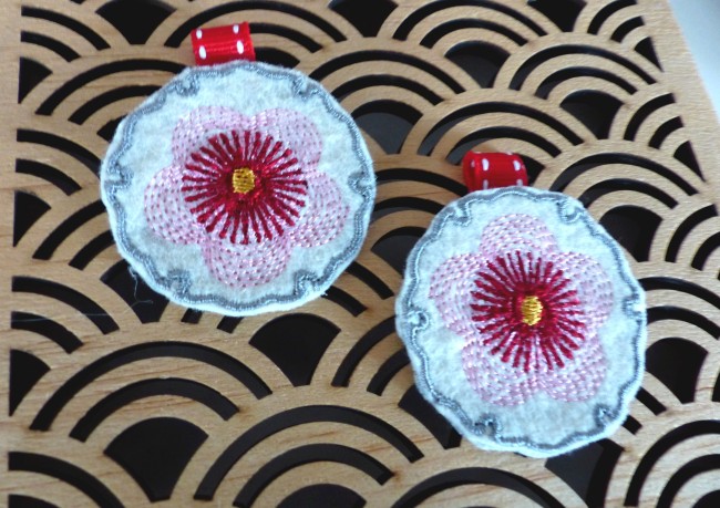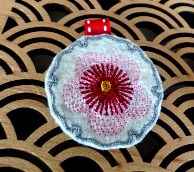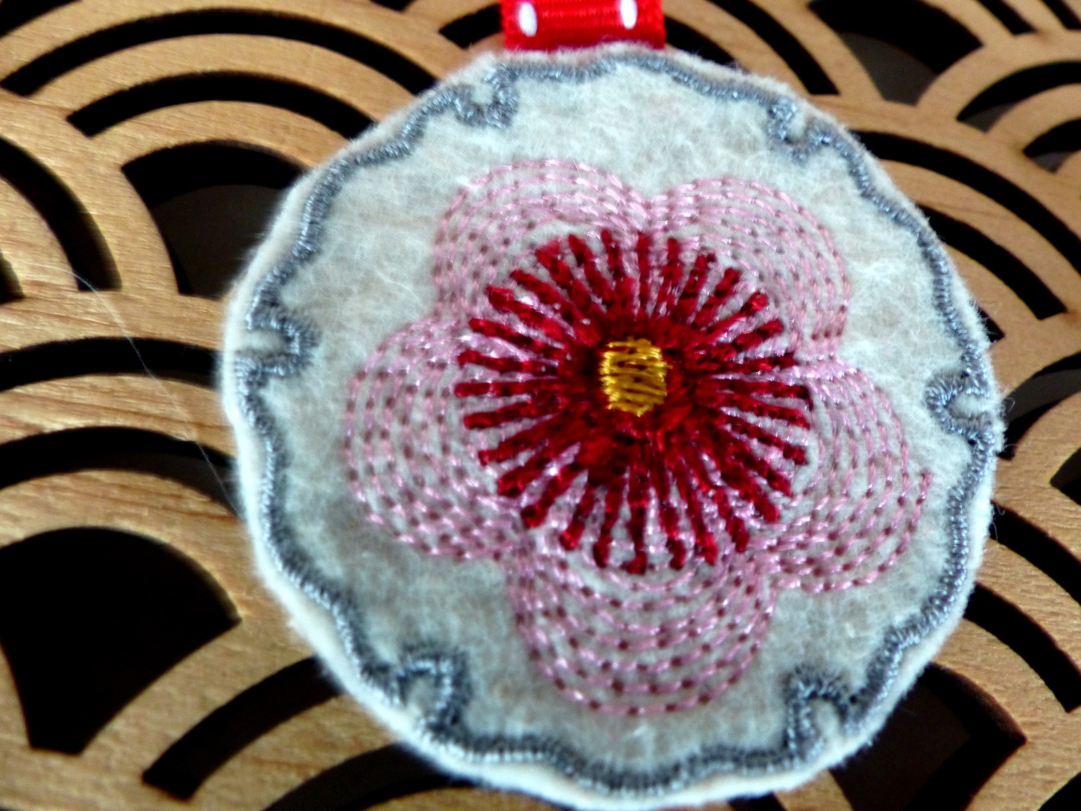 Pendentif rond brodé 1 "fleur Sakura" rose et coeur rouge