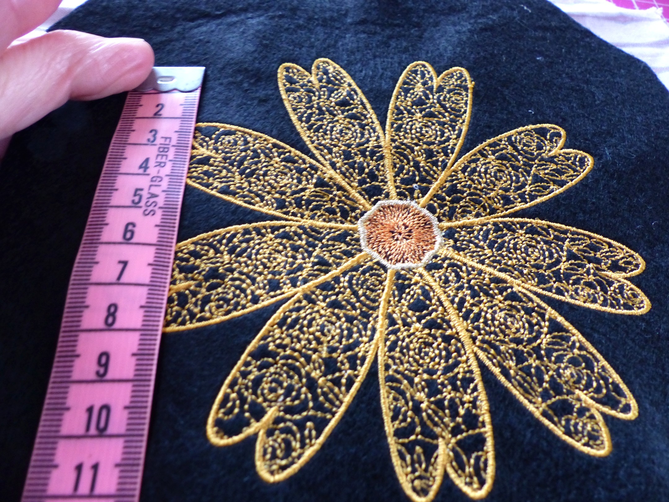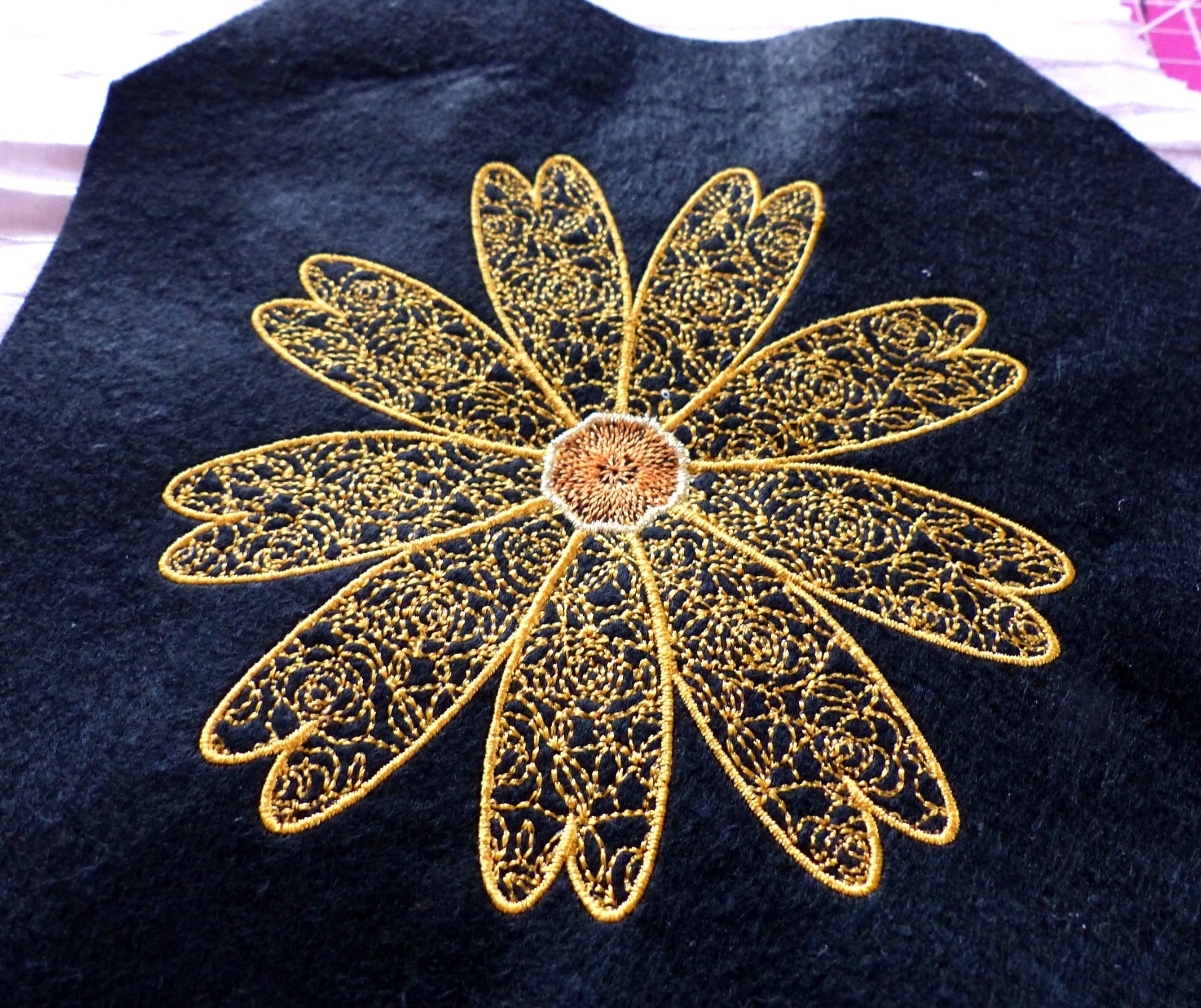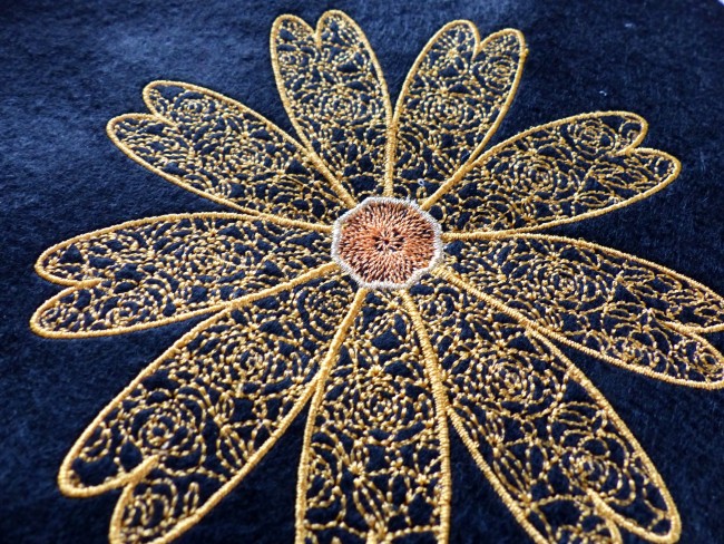 Appliqué "grande fleur" brodée de couleur jaune doré au coeur orange et notes de dorures.  fond feutrine noire pour faire ressortir le motif.