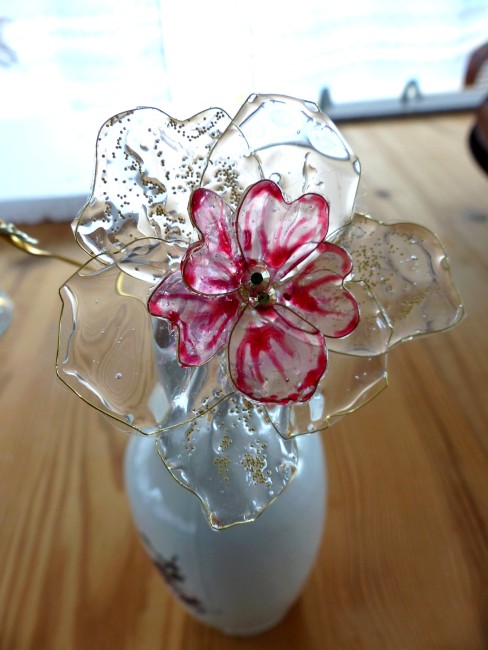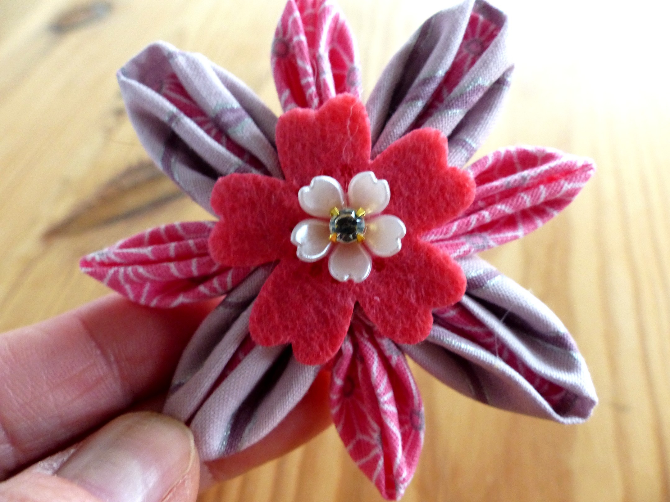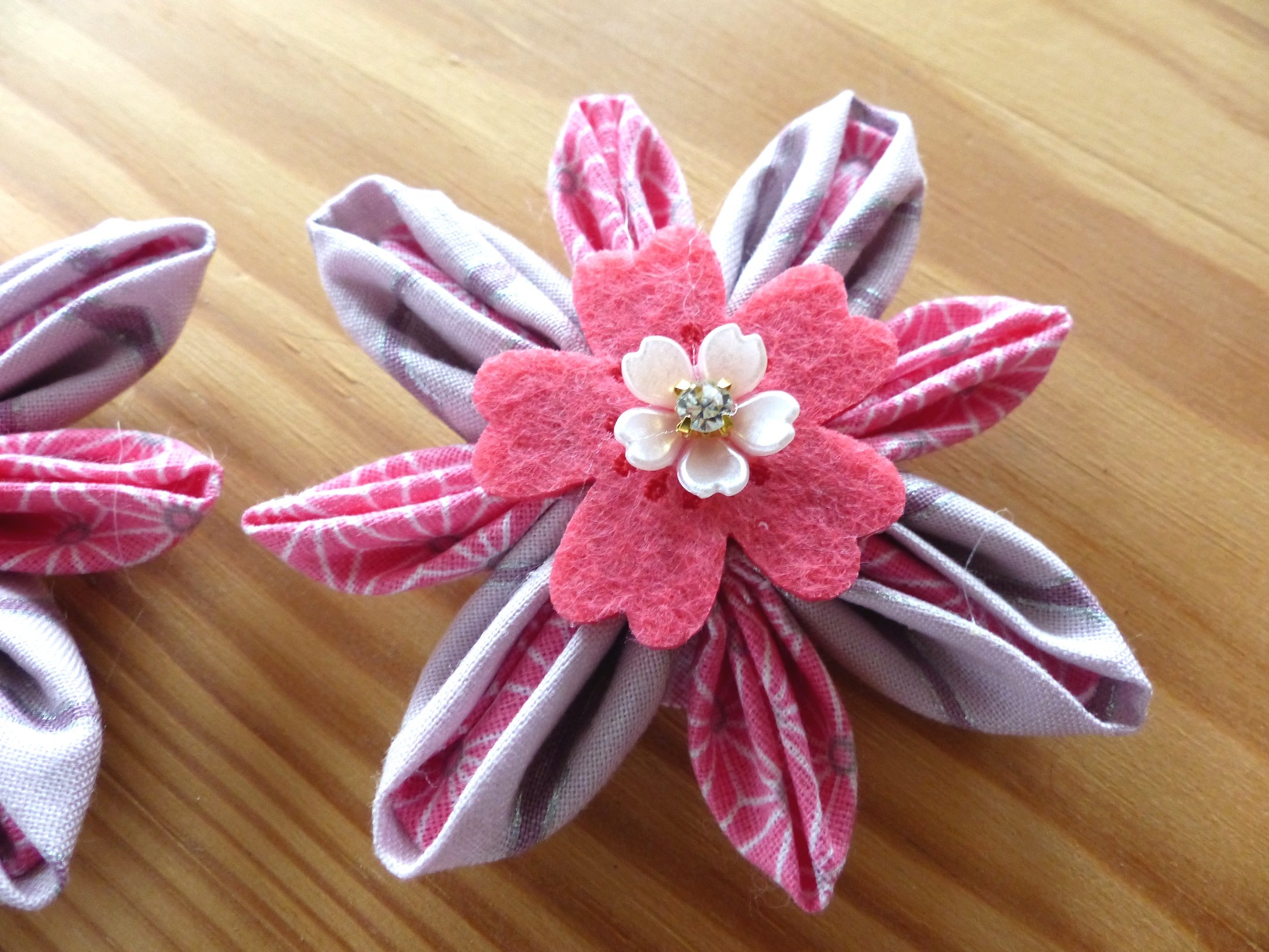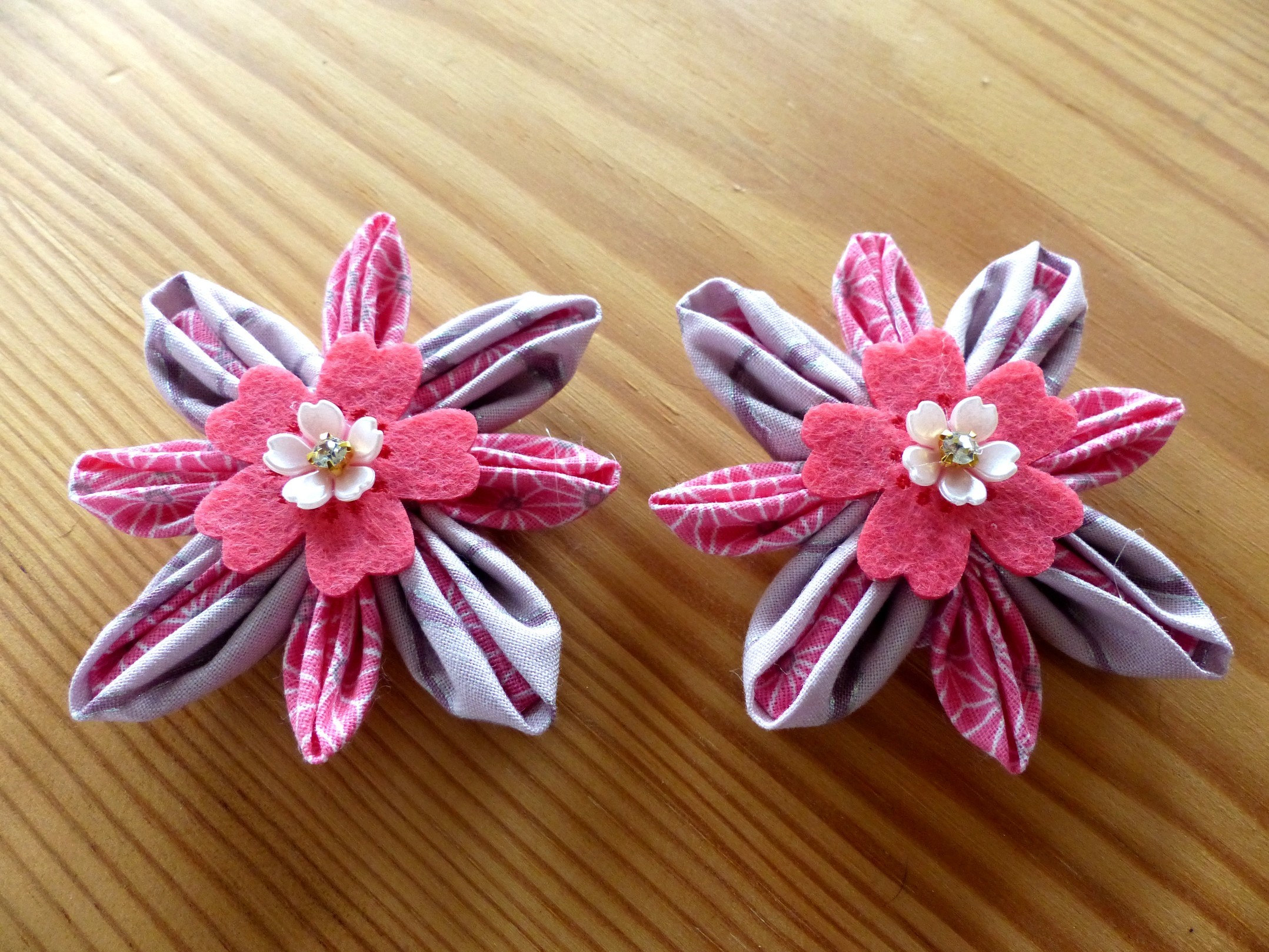 Lot de 2 fleurs Kanzashi dans les tons de rose, costituée de 8 pétales alternées de 2 tissus roses différents, au centre fleur sakura en feutrine et petite fleurs centrale plastifiée pour embellissement suplémentaire.