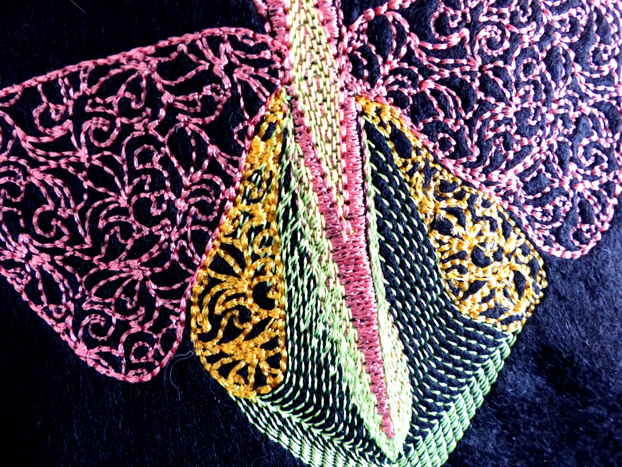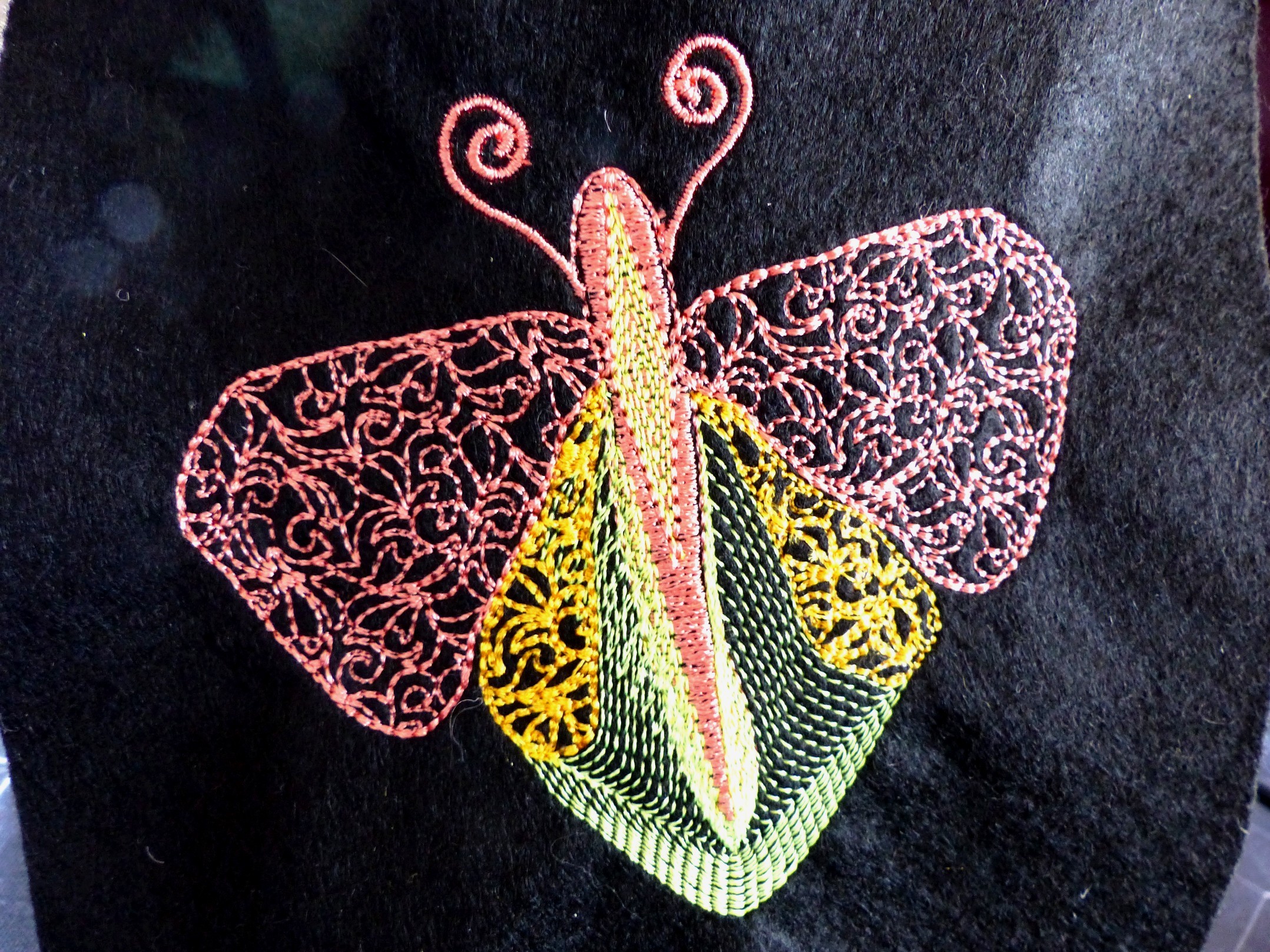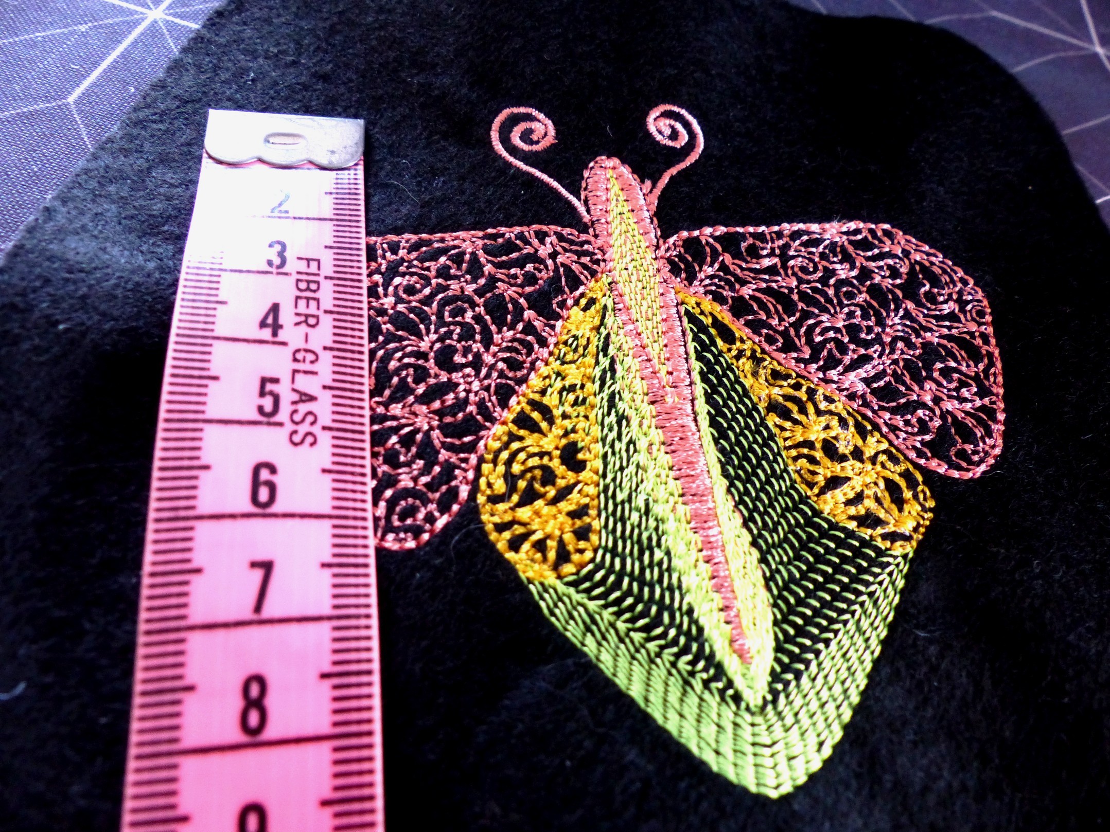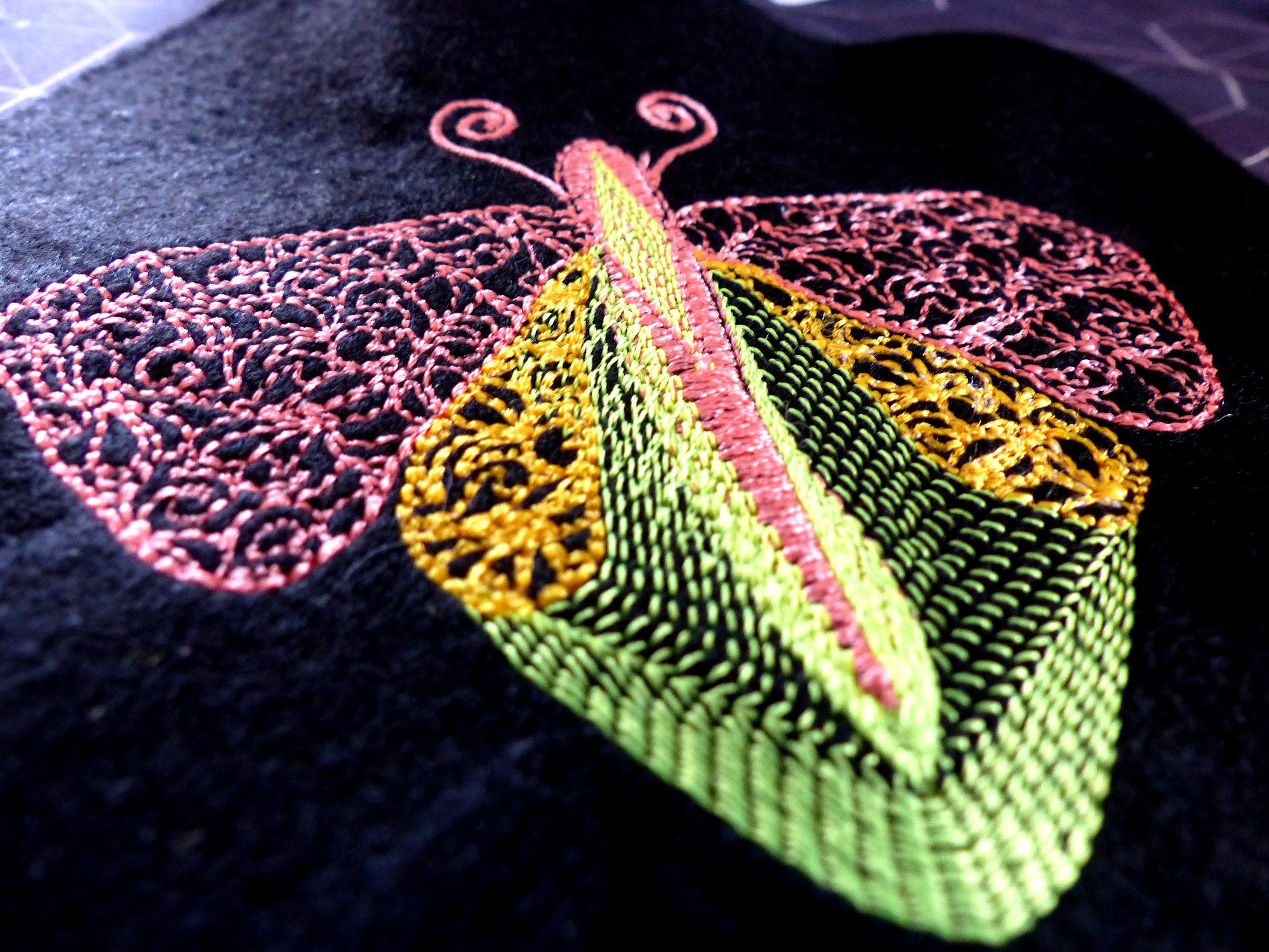Appliqué "papillon de nuit" brodé dansles tons de cuivré, vert fluo et jaune doré sur fond de feutrine noire fine pour un bon maintient de la broderie.