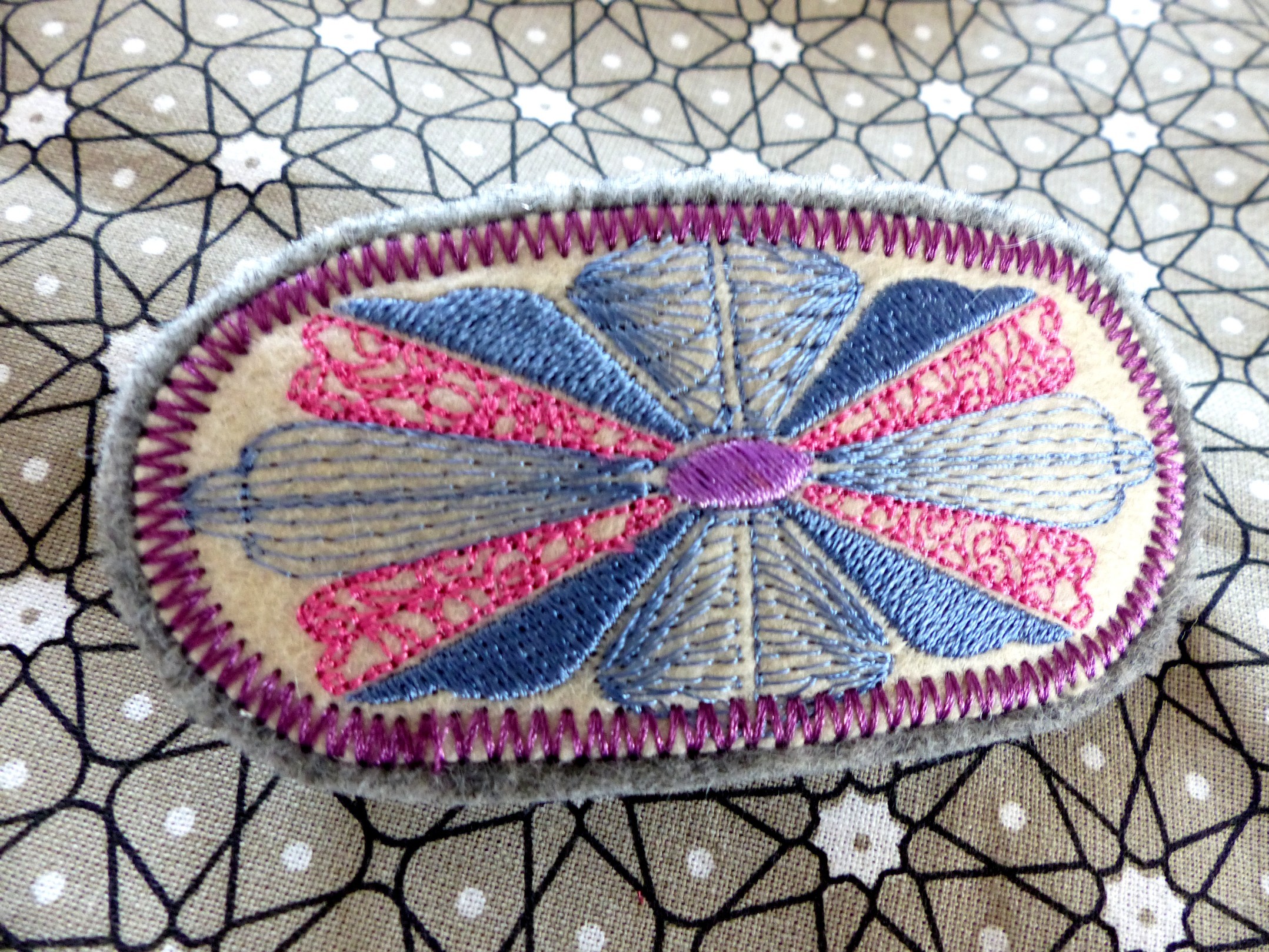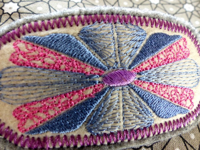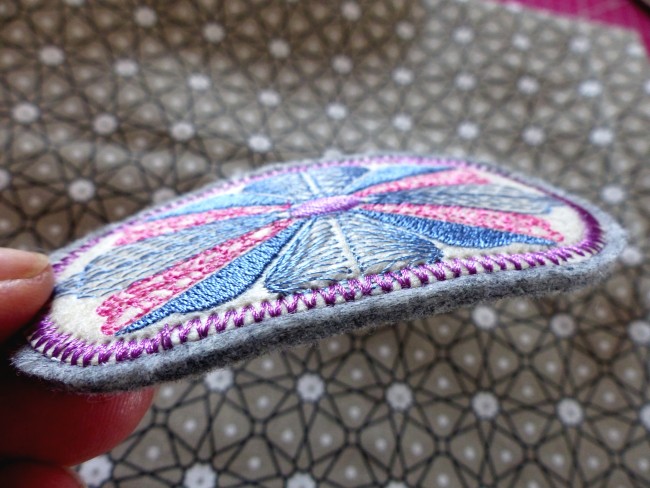 Barrette brodée "fleur moderne" tons rose-bleu-mauve