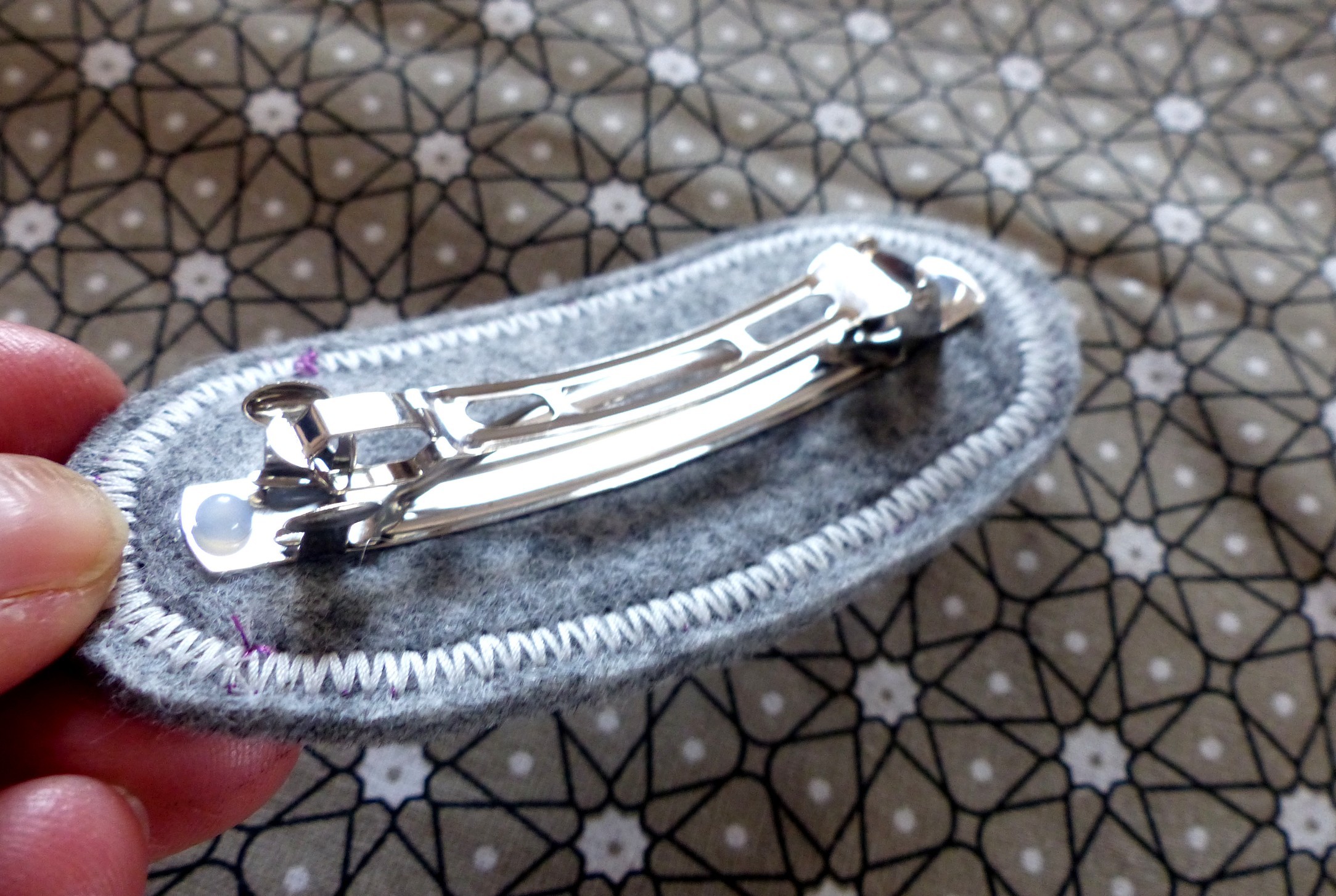Barrette brodée "fleur moderne" sur fond écru, support suplémentaire en feutrine épaisse de couleur grise pour la souplesse et solidité.  Fil de broderie dans les tons de rose-bleu et mauve.