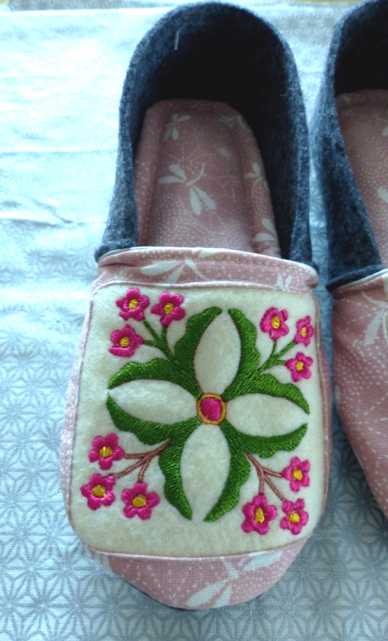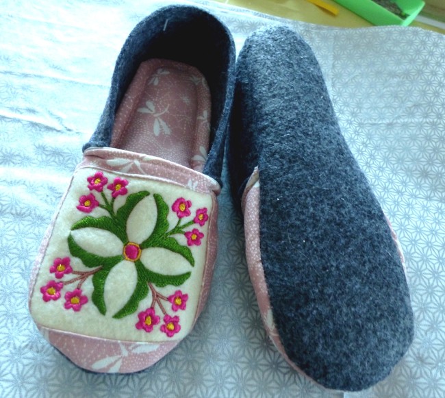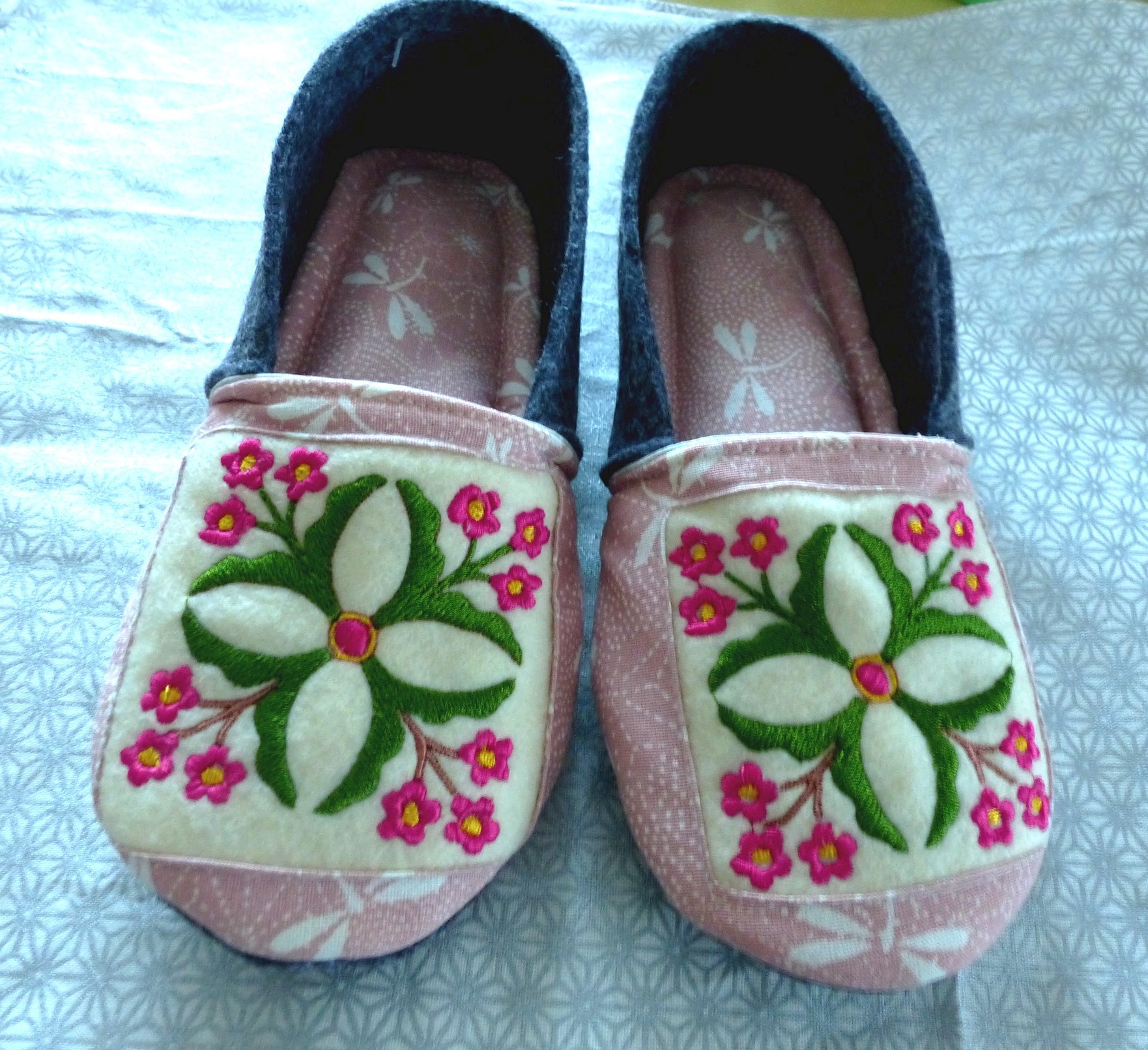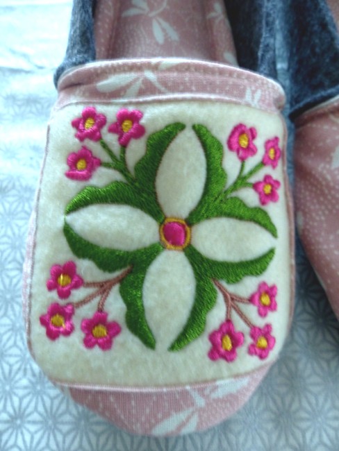 Chaussons femme feutrine épaisse grise et tissu rose clair motifs libellule, empiècement fleuri brodé sur le dessus de pied.