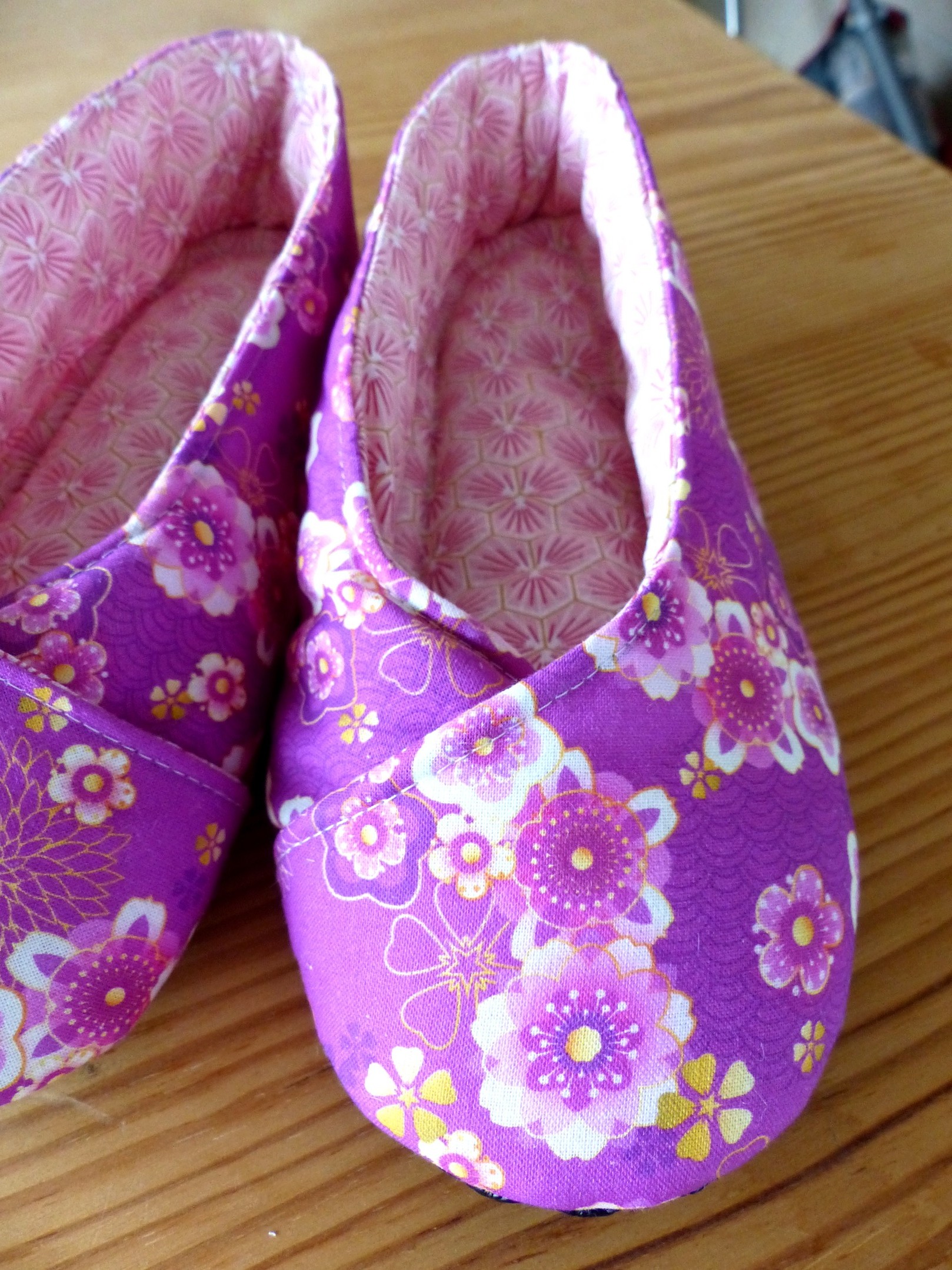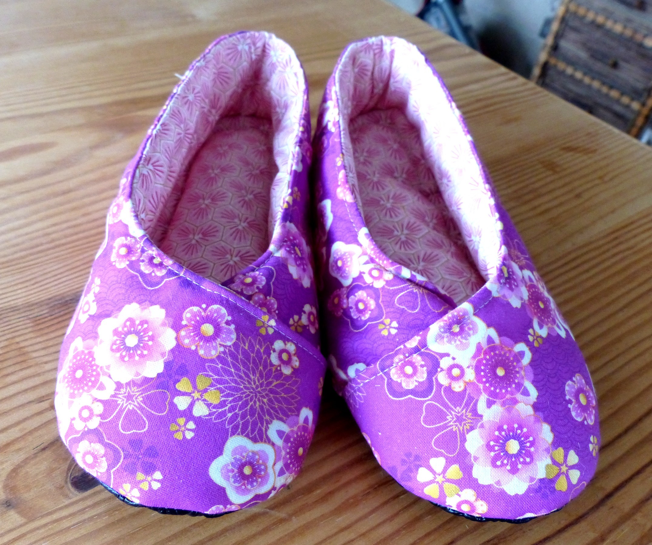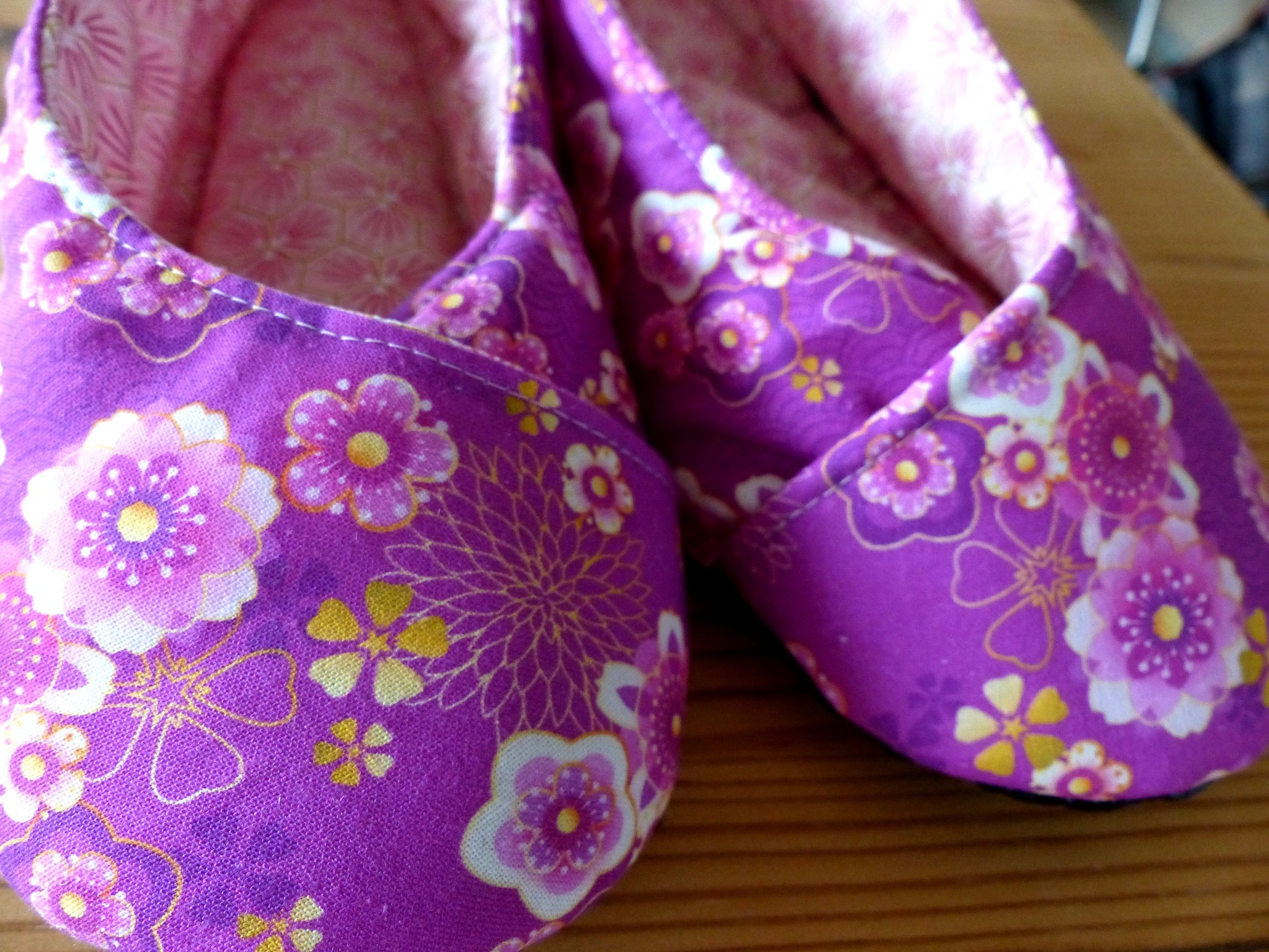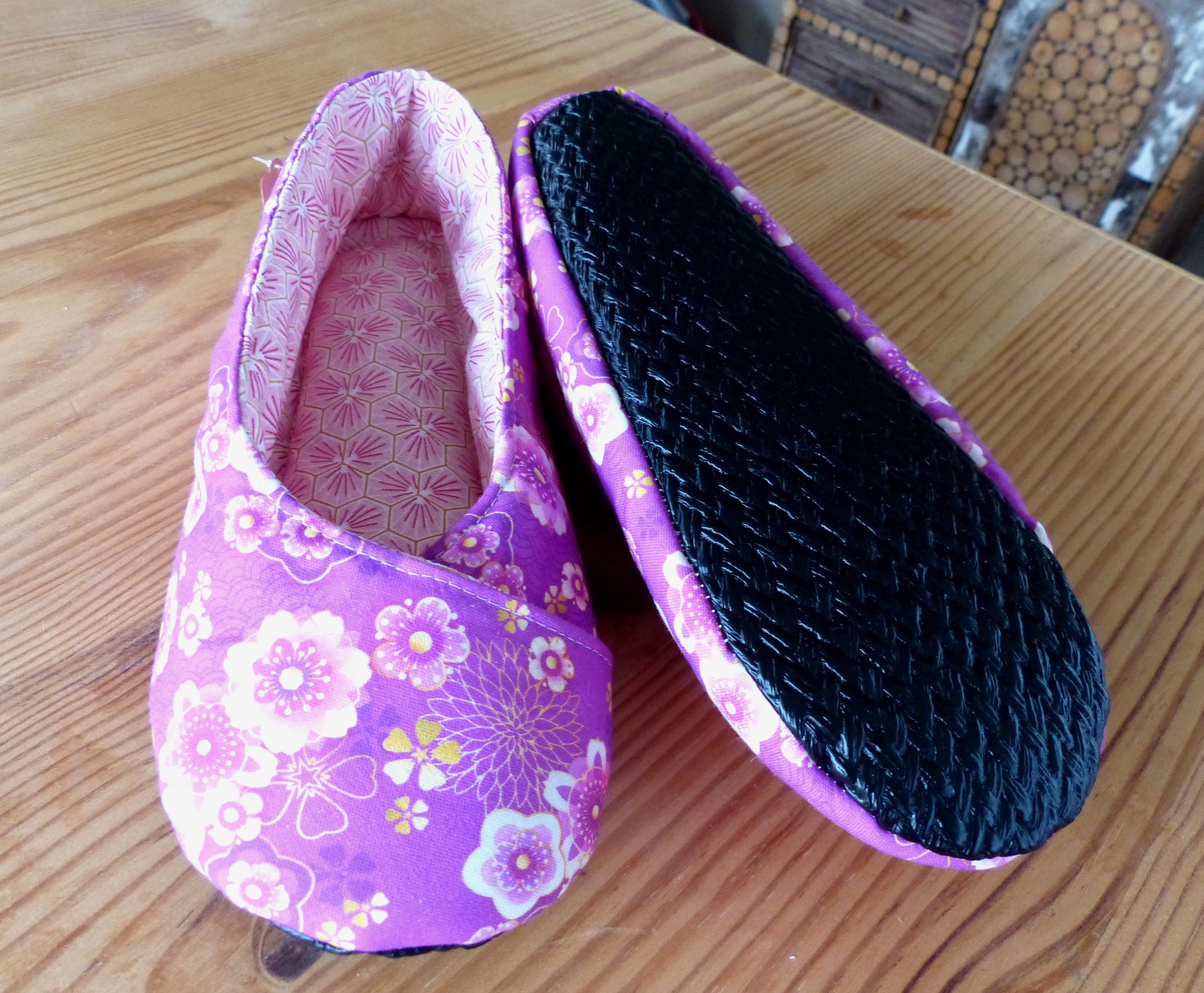 Chaussons femme tissu japonais "fleuri" rose-mauve, croisés sur le dessus pour plus de féminité.