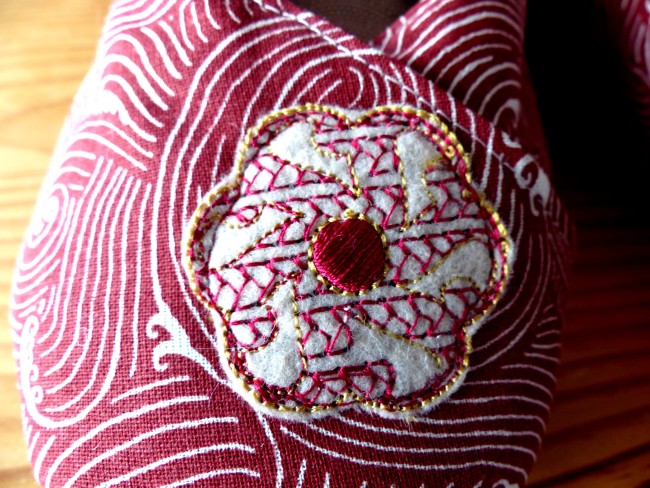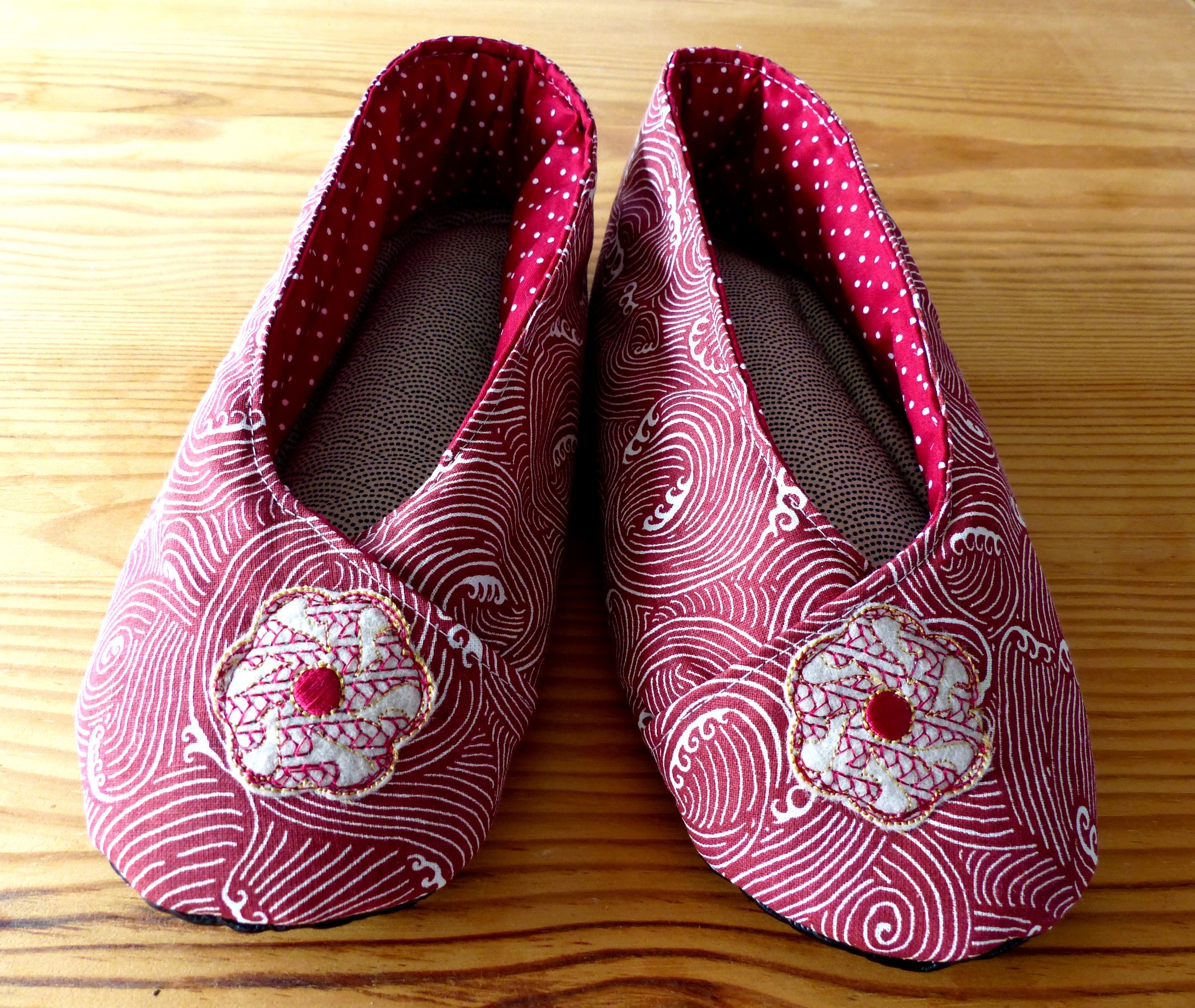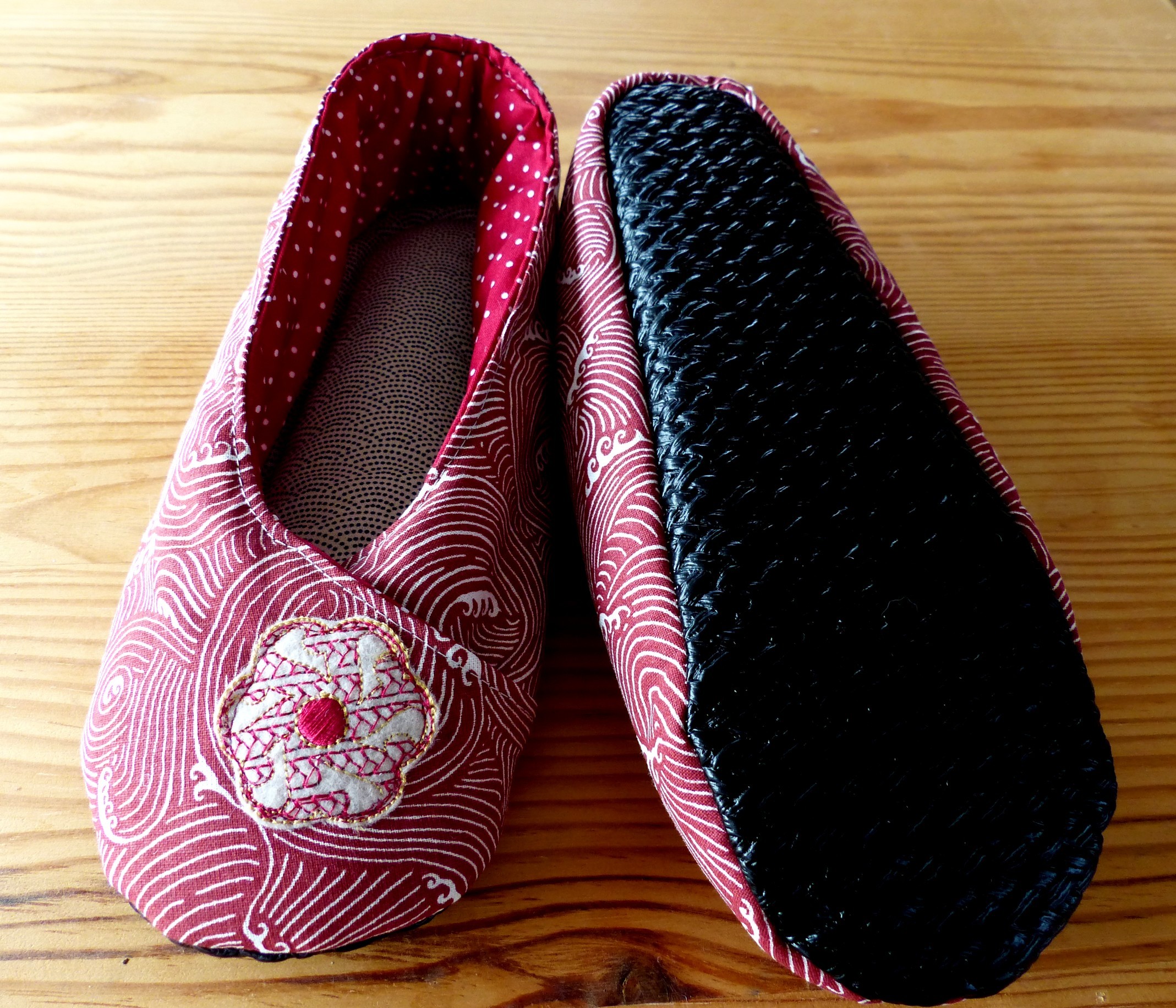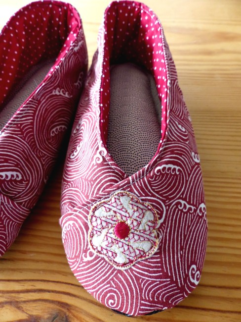 Chaussons femme kimono "vagues japonaises" rouge, croisés sur le dessus pour plus de féminité.