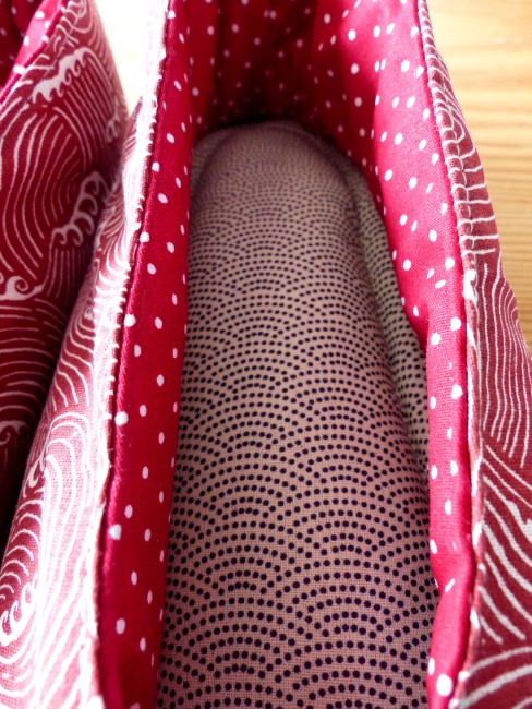 Semelle intérieure en feutrine épaisse recouverte de ouate épaisse et d'un très joli tissu noir et blanc sashiko éventails. Semelle extérieure en simili cuir de couleur noir pour une meilleure isolation et confort au sol.