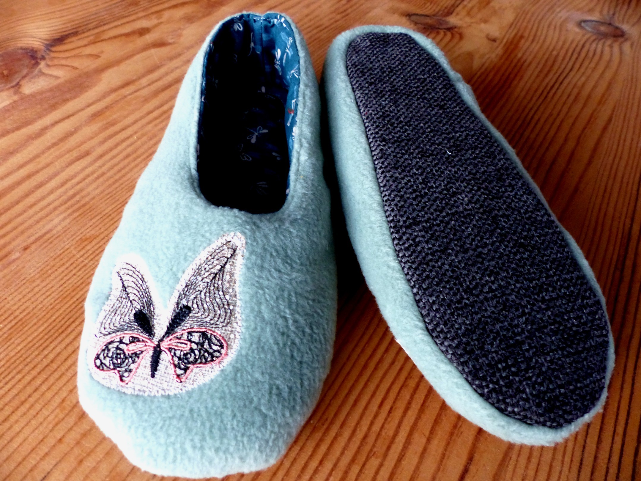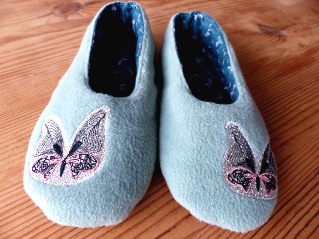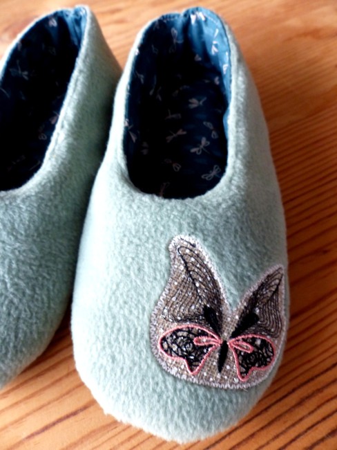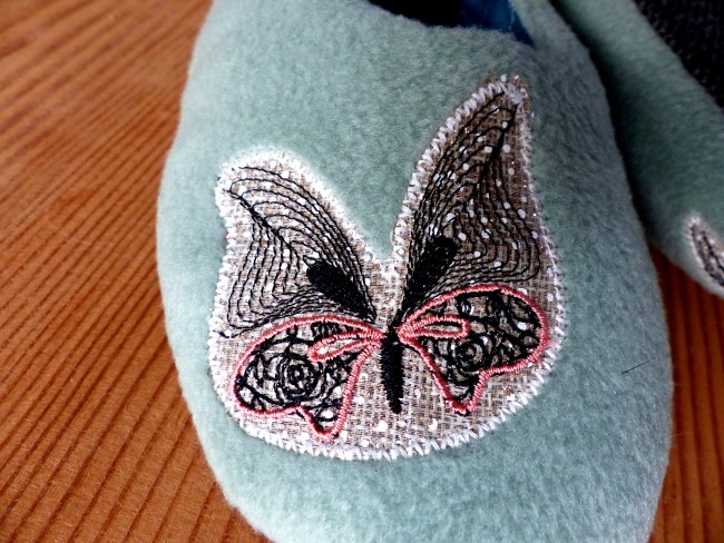 Chaussons femme polaire vert doux et papillon brodé sur le dessus de pied.