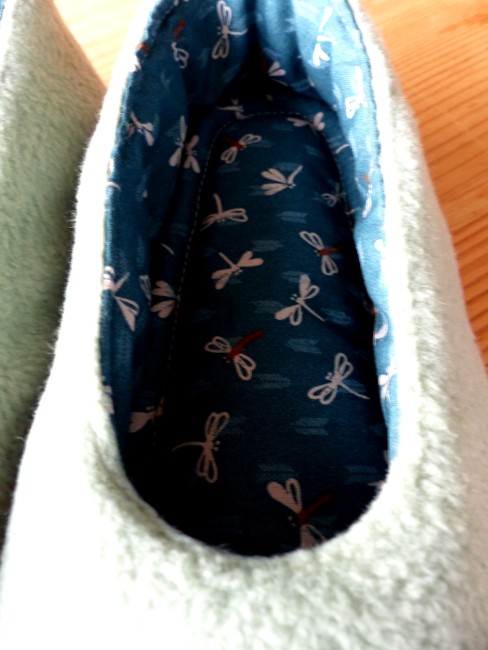 Intérieur en tissu vert foncé, motifs petites libellules, semelle intérieure en feutrine épaisse recouverte de ouate épaisse et de tissu.