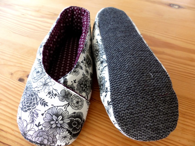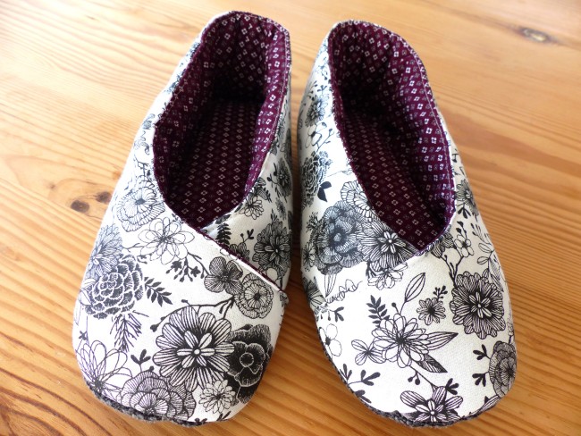 Chaussons femme kimono, croisés sur le dessus pour plus de féminité.Dessins fleuris noir au fond blanc. Intérieur avec un tissu bordeaux petits motifs discrets.