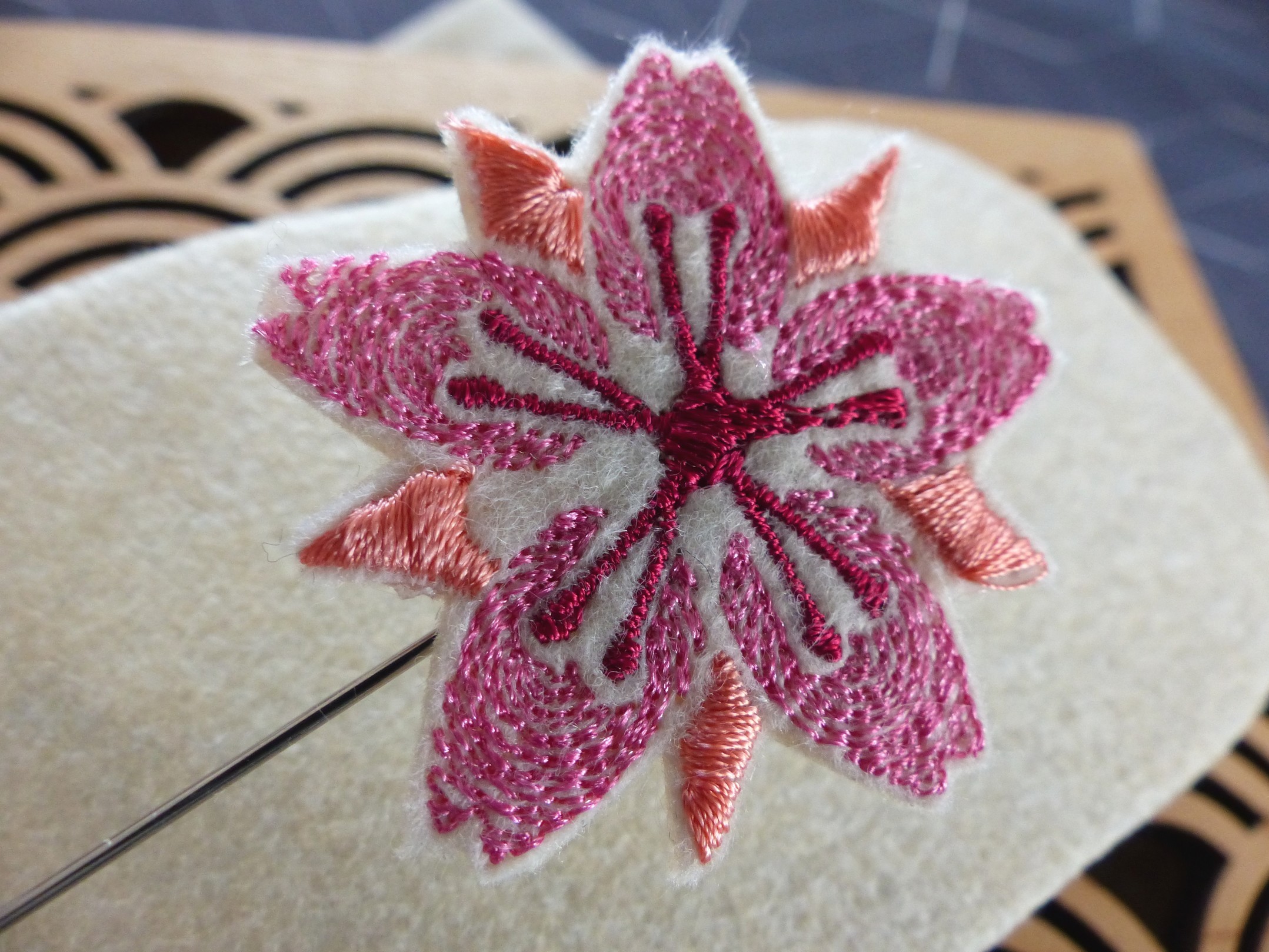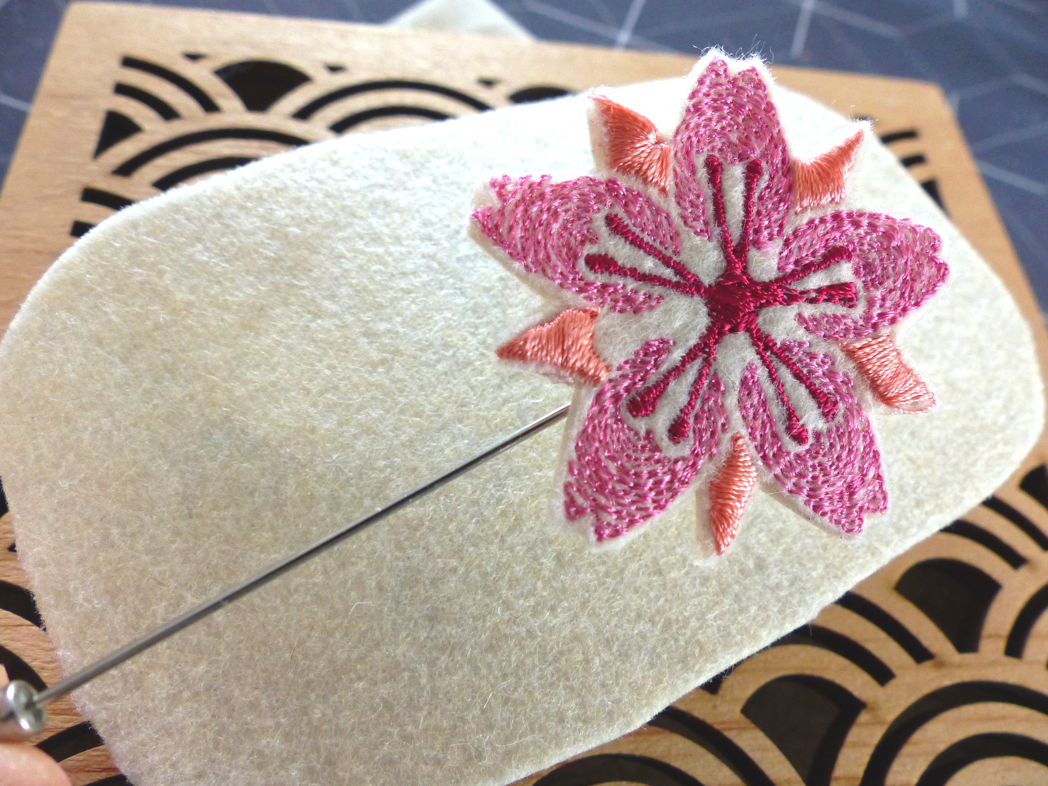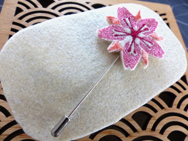 Pique broche "fleur brodée rose" sur feutrine fine écrue