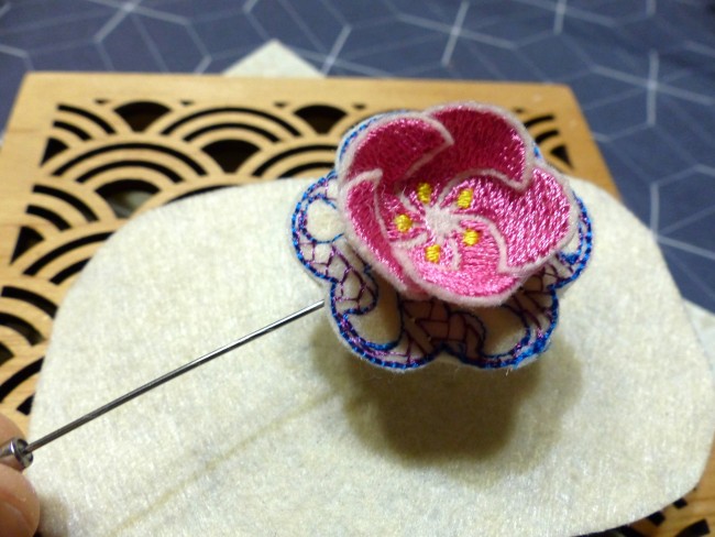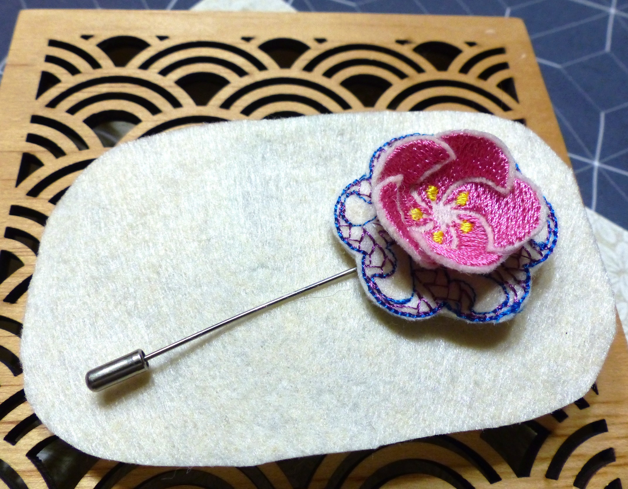 Pique "fleur rose en relief" brodée rose et bleu sur feutrine écrue