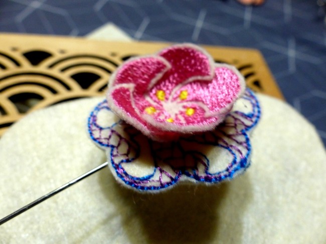Pique broche "fleur en relief", cette jolie composition d'une petite fleur rose brodée sur un socle rond également brodé aéré avec un fil bleu.