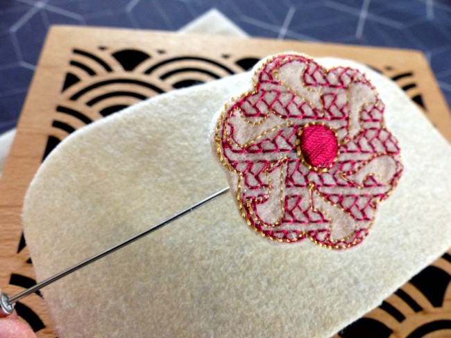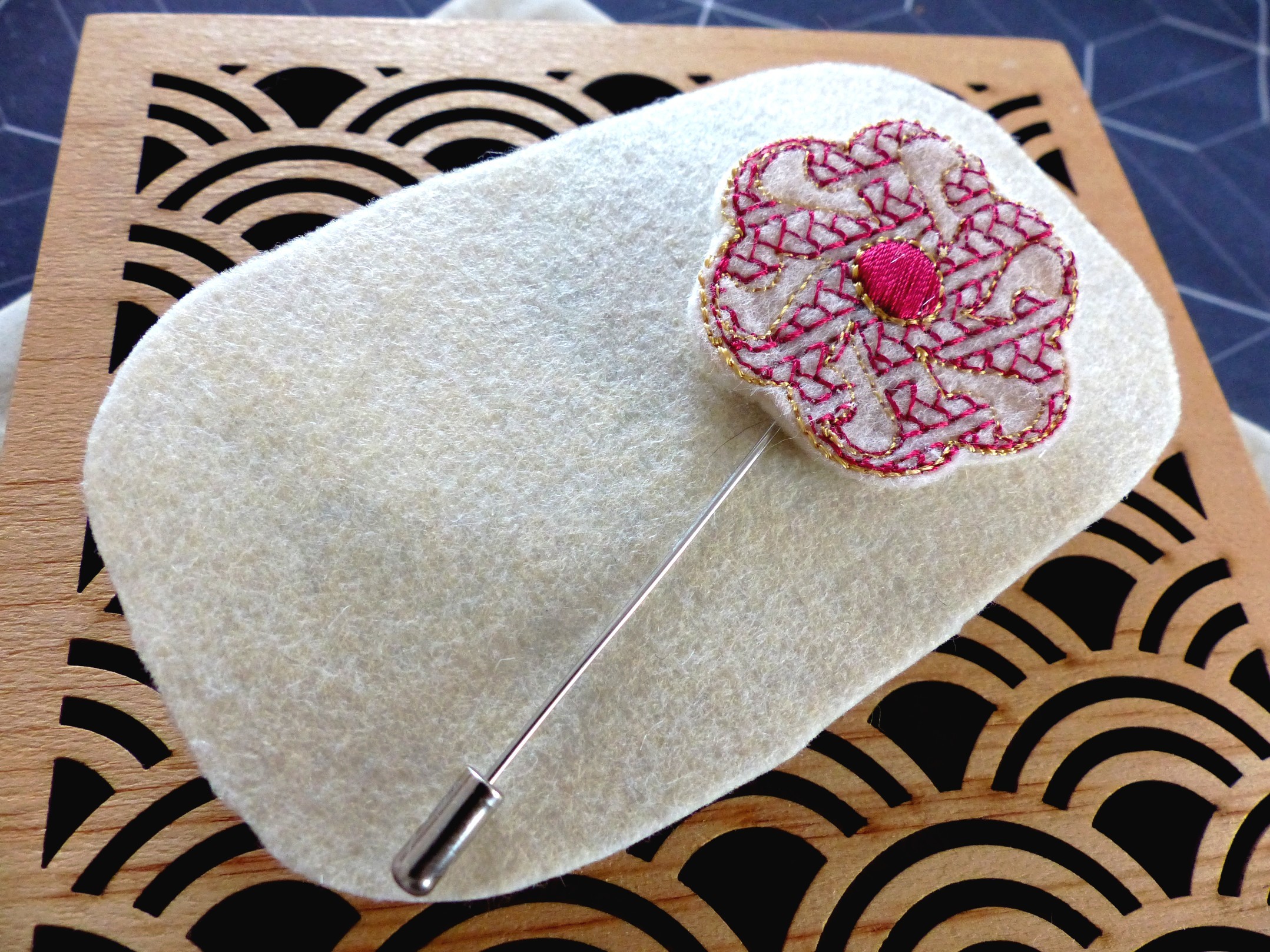 Pique broche "rosace brodée 2" rouge au fond feutrine fine écru et bords marqué points fil doré.