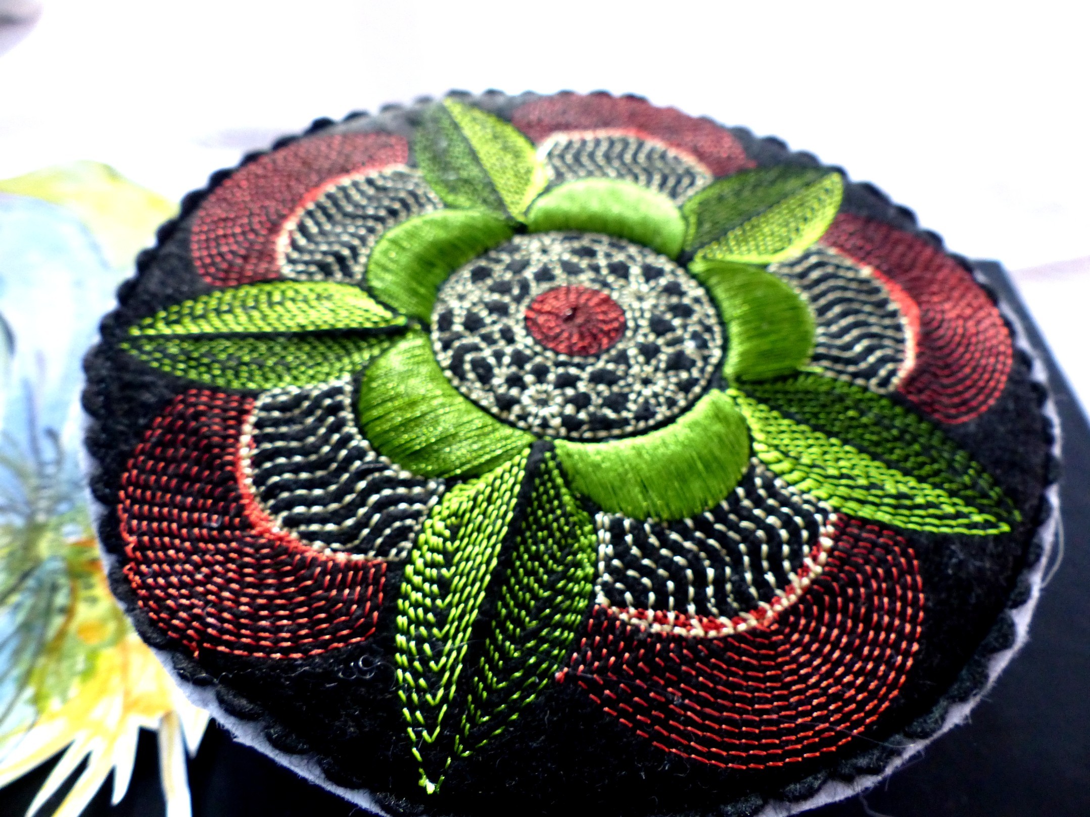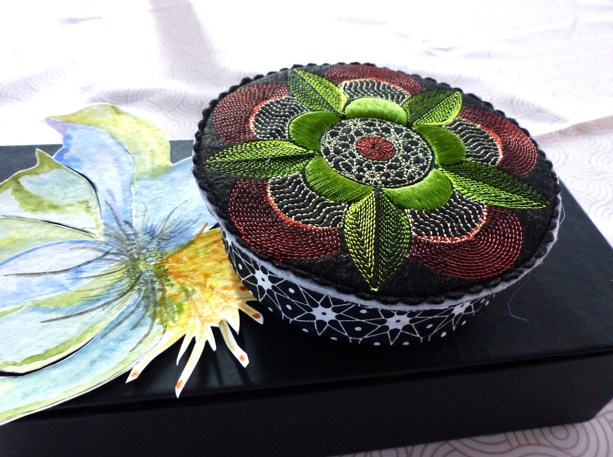 BOITE décorative feutrine épaisse "grande fleur brodée" fond noir