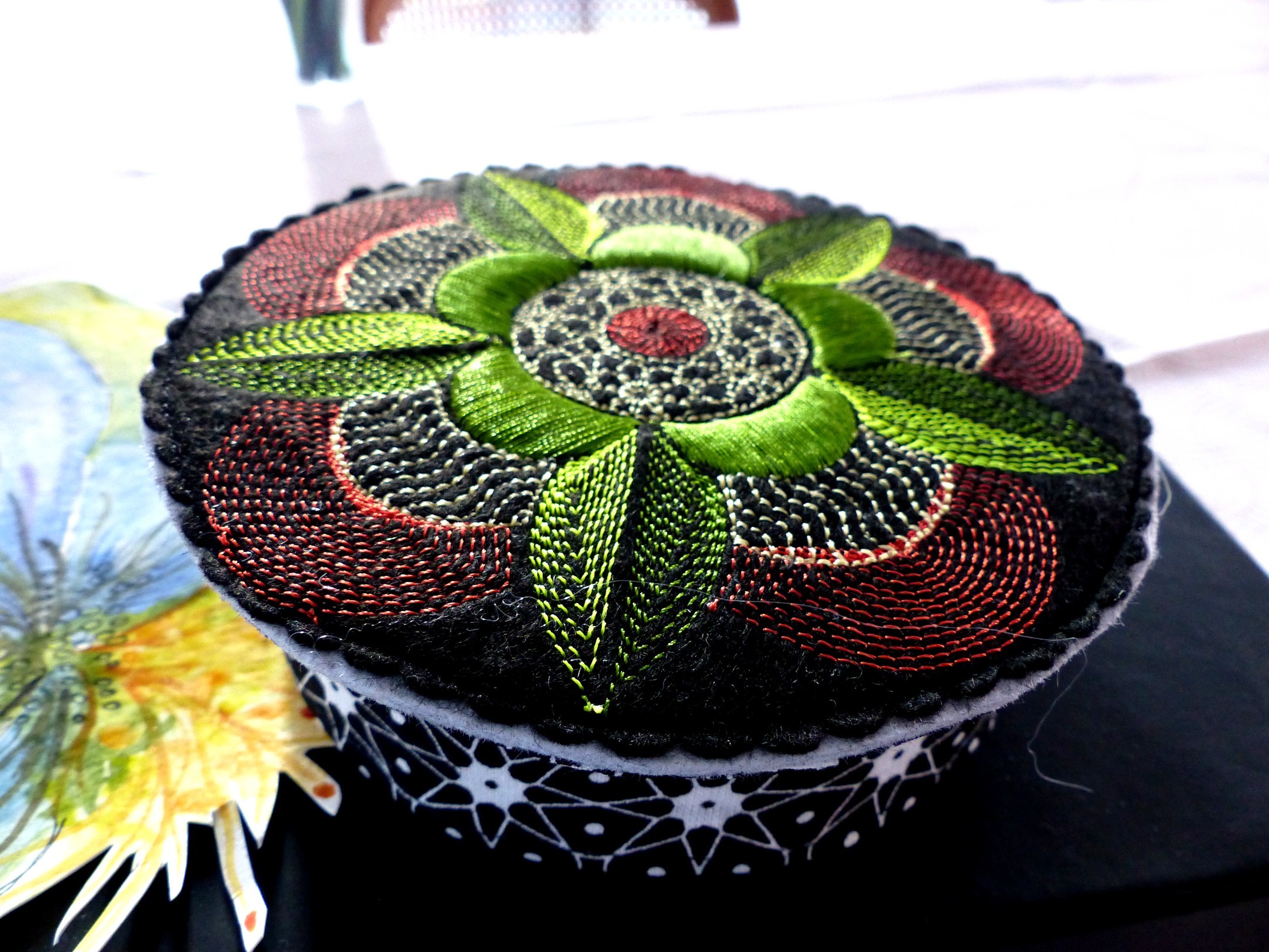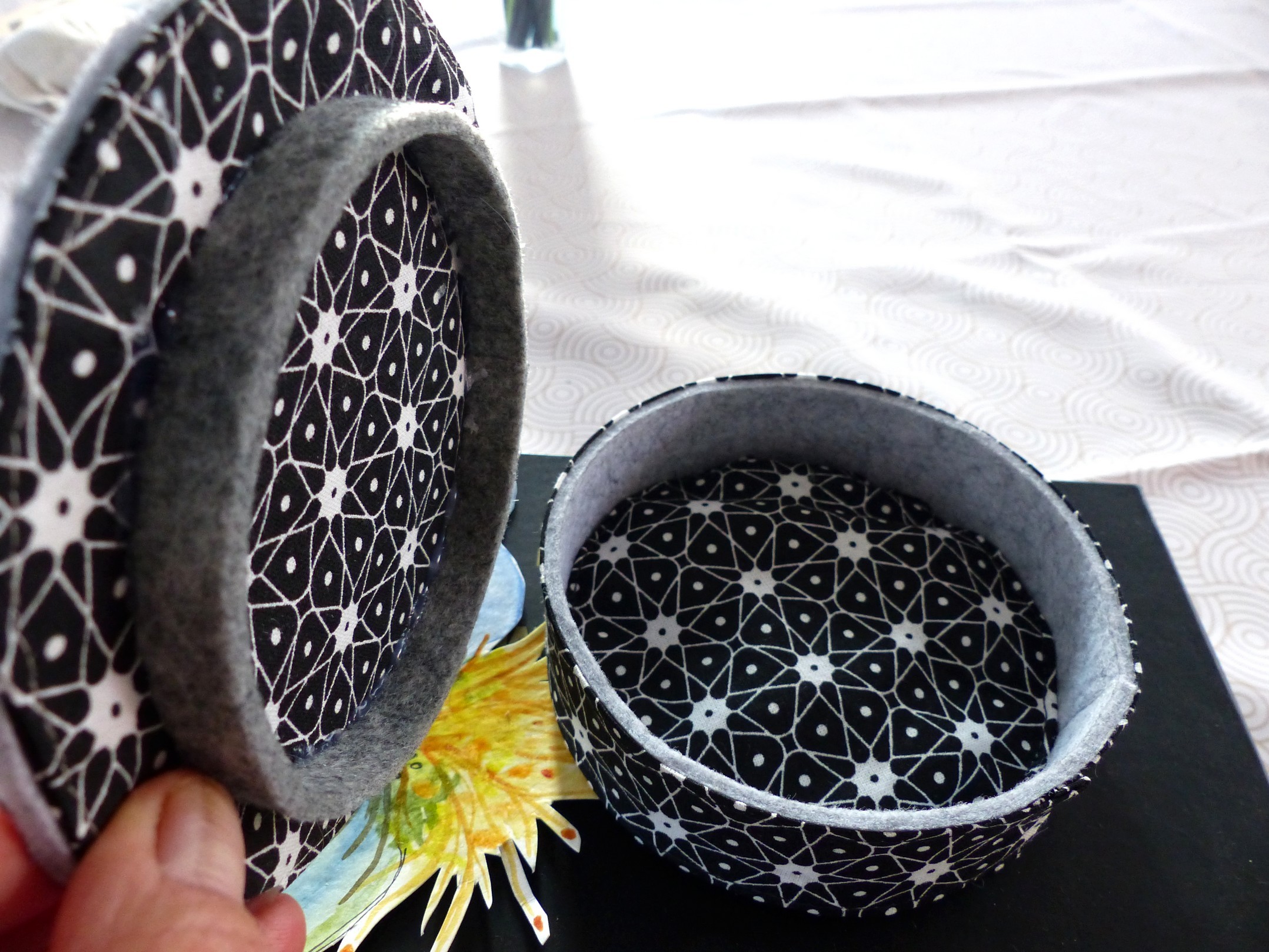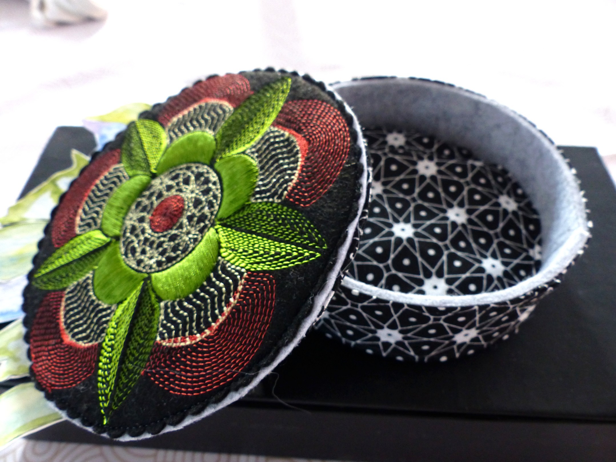 Boite à bijoux en feutrine épaisse, habillée d'un joli tissu japonais noir et blanc étoilé, couvercle décoré avec cette belle broderie grande fleur dans les tons de vert-orange pour raffinement.