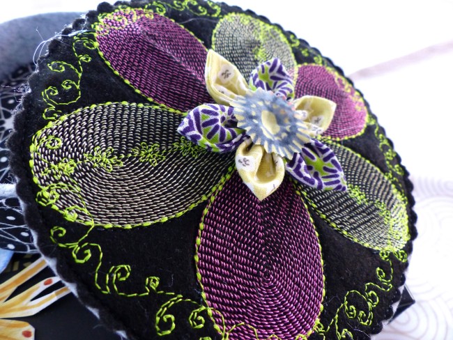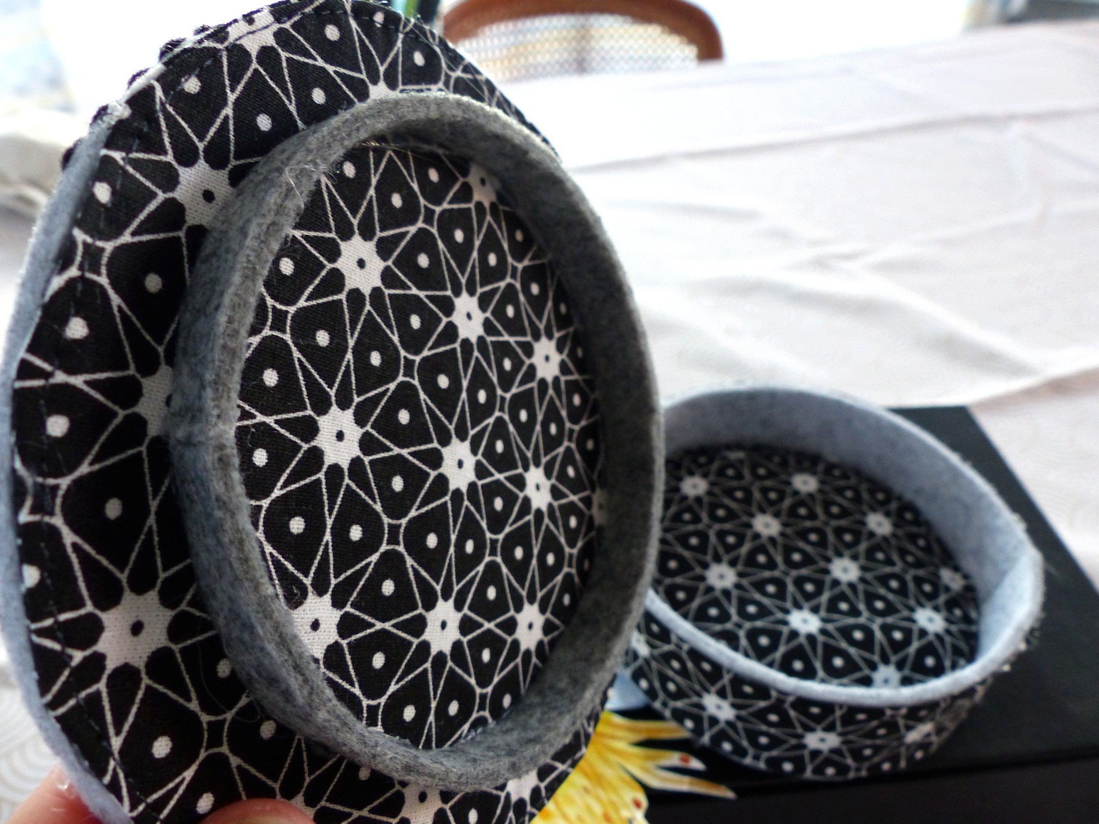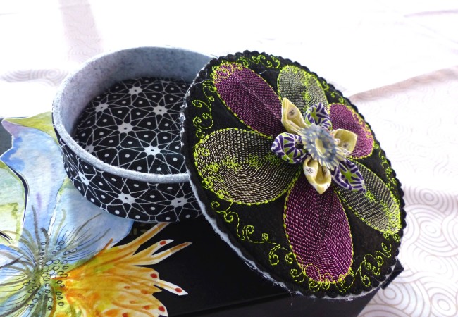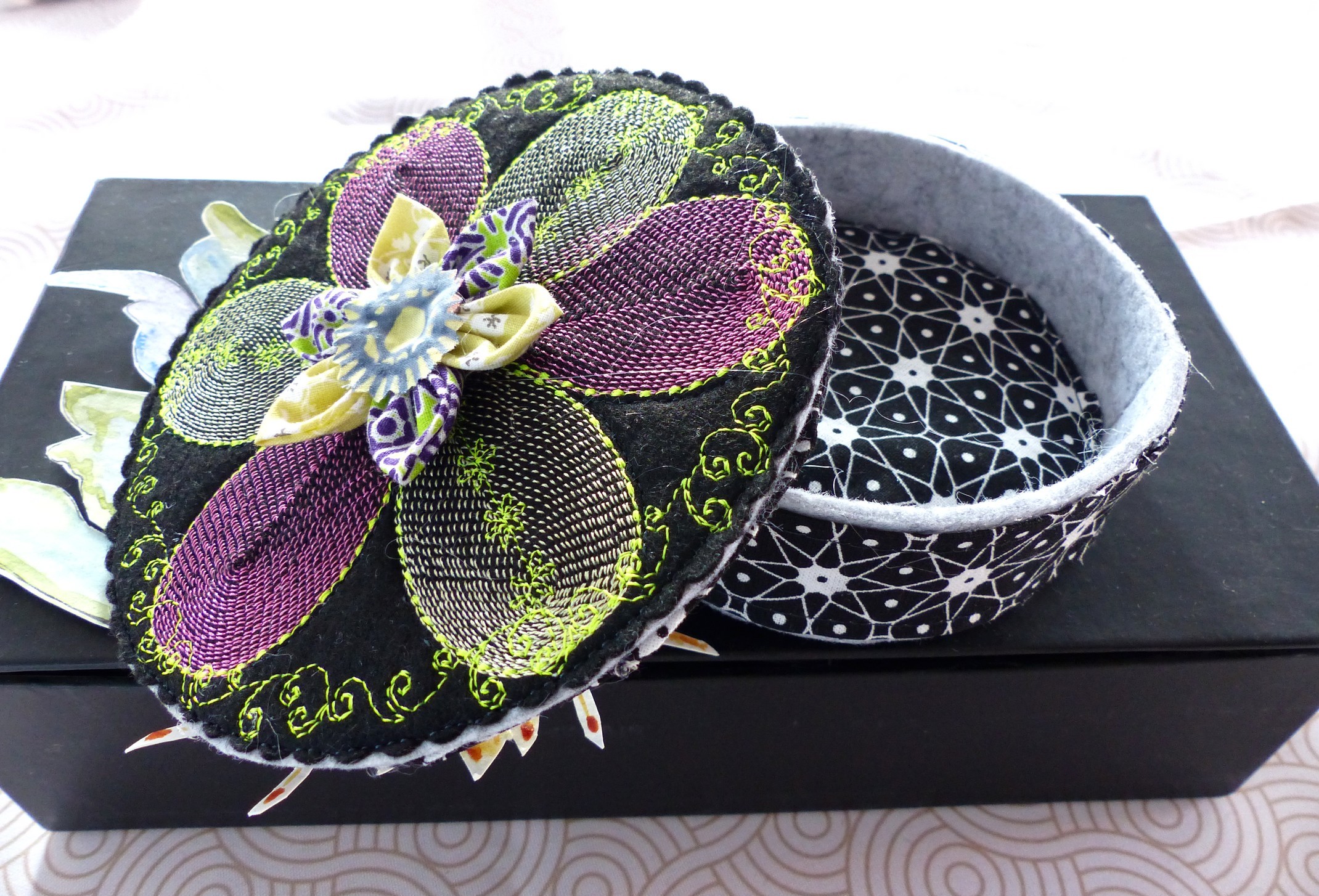 Boite Bijoux en feutrine épaisse recouverte d'un joli tissu japonais à motifs noir et blanc, couvercle décoré d'une jolie broderie fleur raffinée de couleur mauve et vert fluo pour décoet origonalité de la Boite.