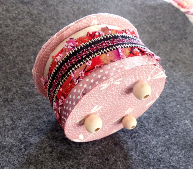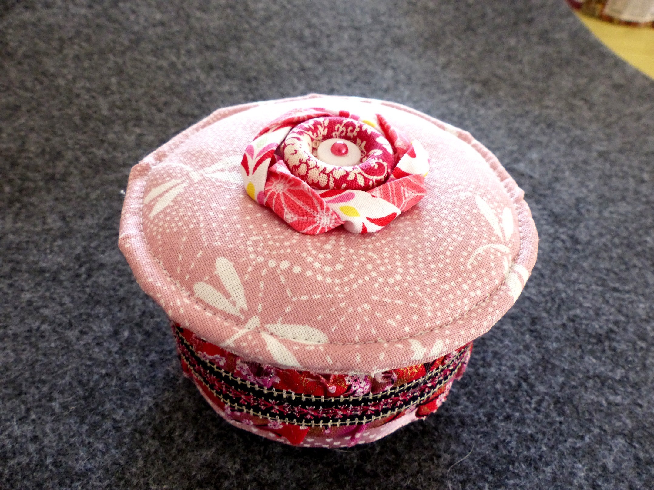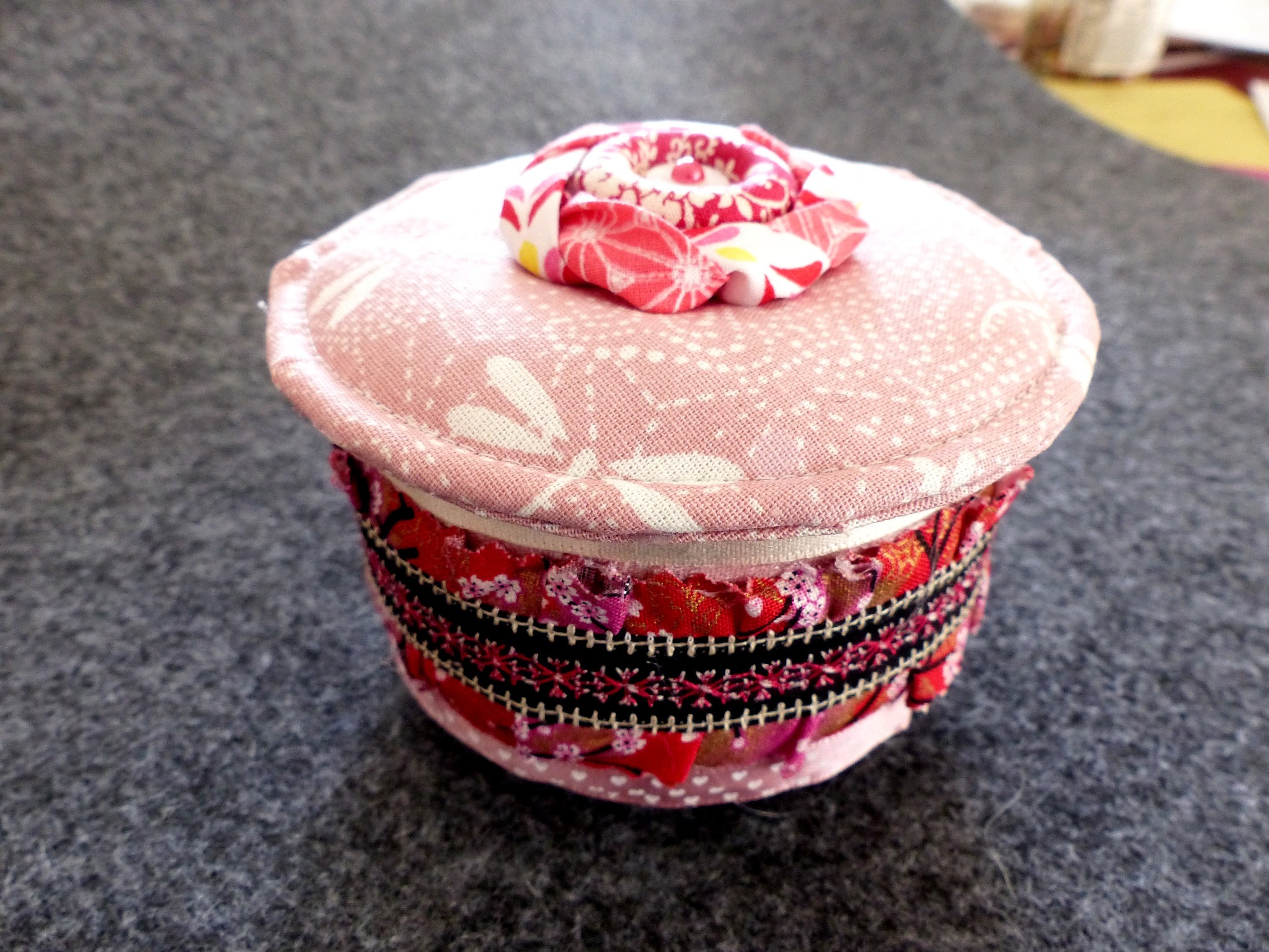 l'entourage de la boite avec un galon brodé sur du tissu japonais fleuri rouge pour une fantaisie sur tout le contour. Dessus avec un couvercle ouaté et recouverte de tissu, et pour embellir une jolie fleur kanzashi.