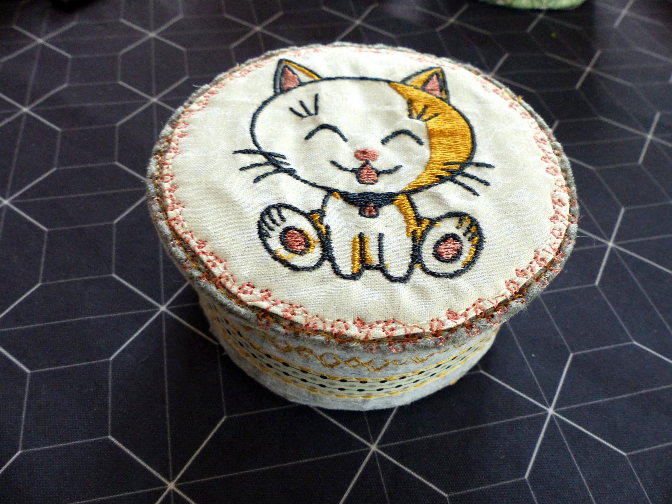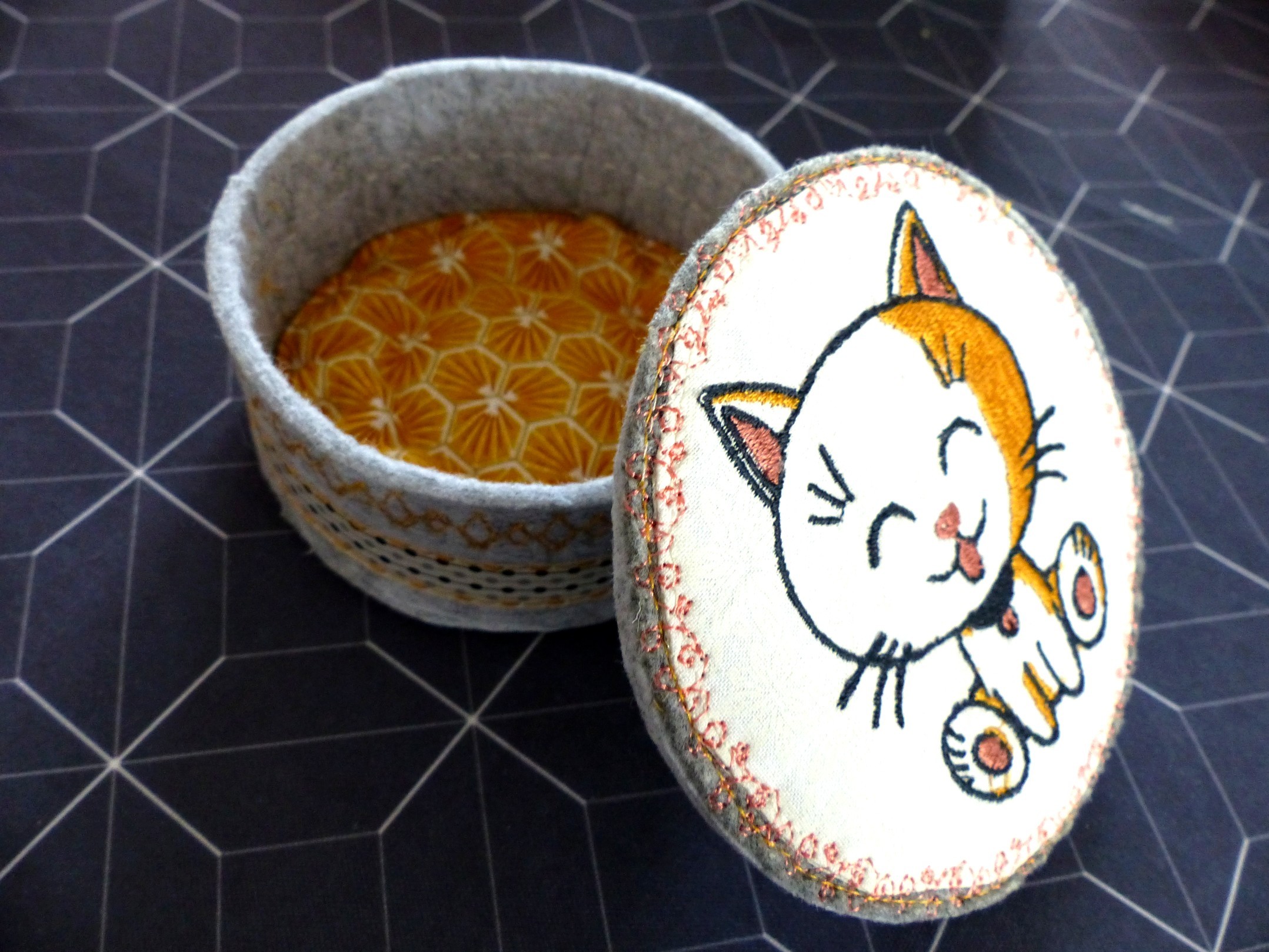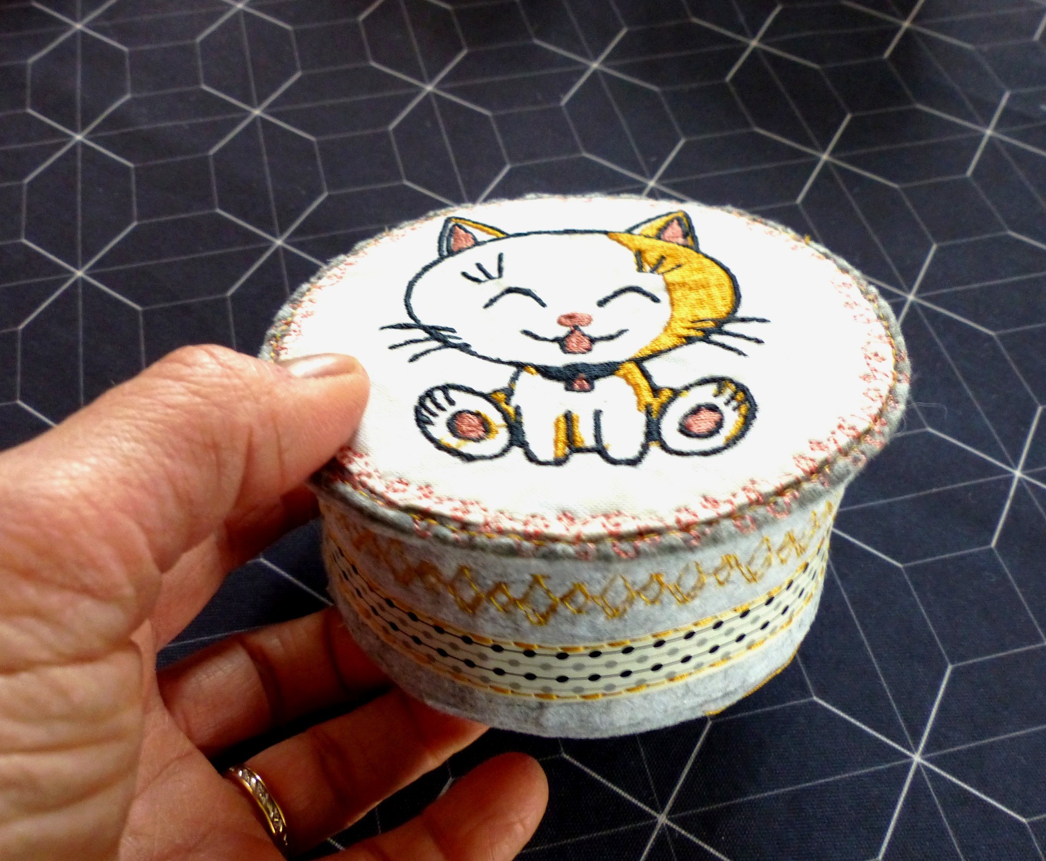 Boite Bijoux en feutrine épaisse grise avec son joli couvercle, broderie "chat japonais porte bonheur" dans les tons de noir jaune doré sur fond blanc.