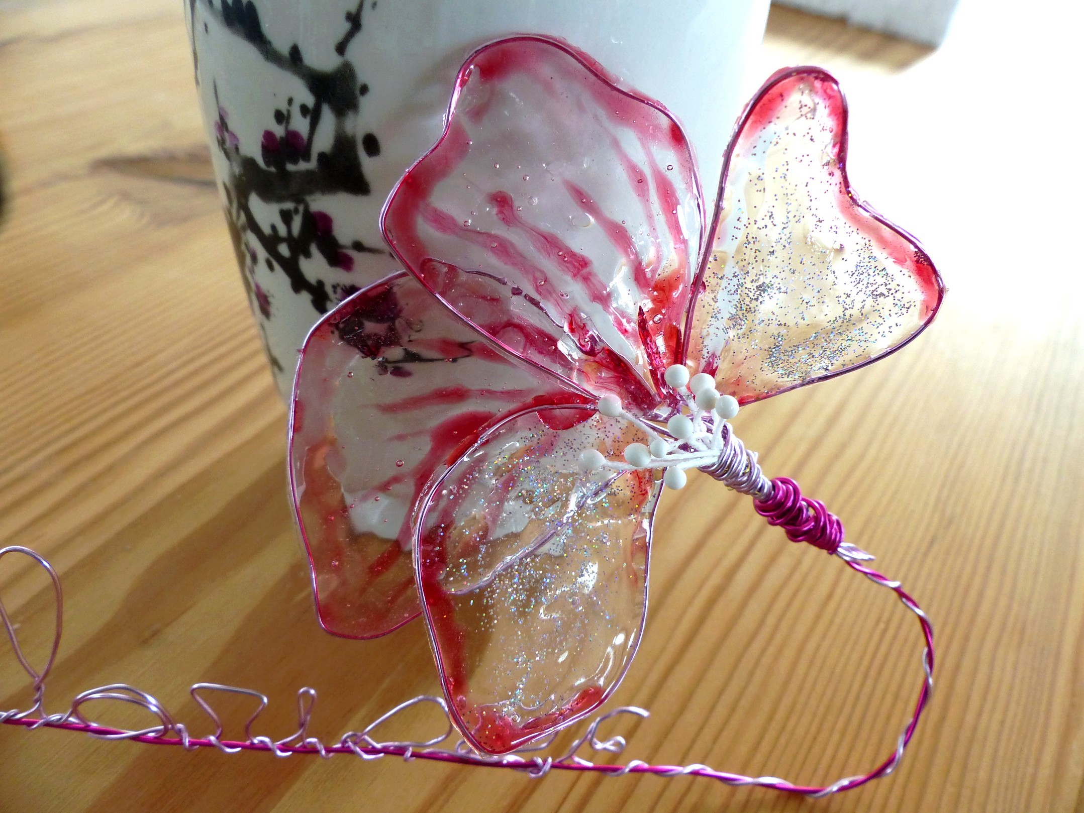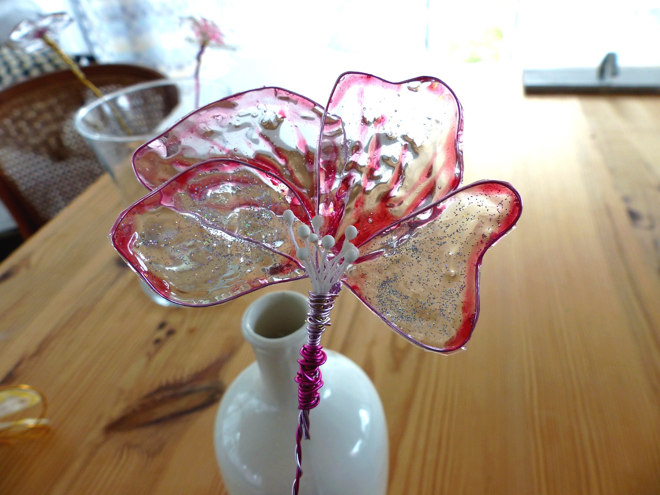 Fleur en résine composée de 4 pétales translucides, fil de métal rose doux et pistils au centre pour réalisme.