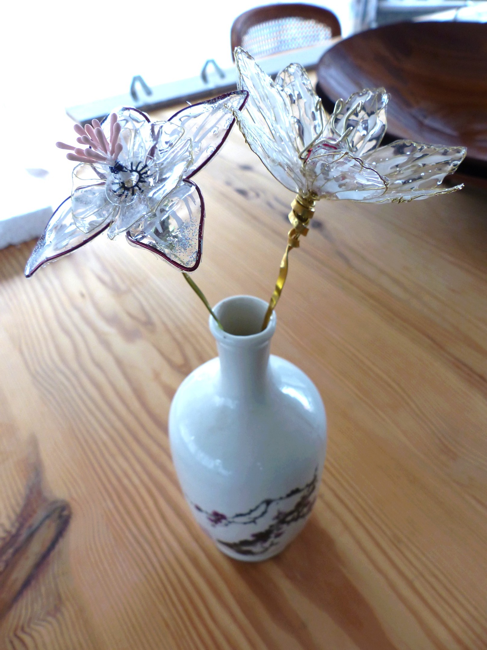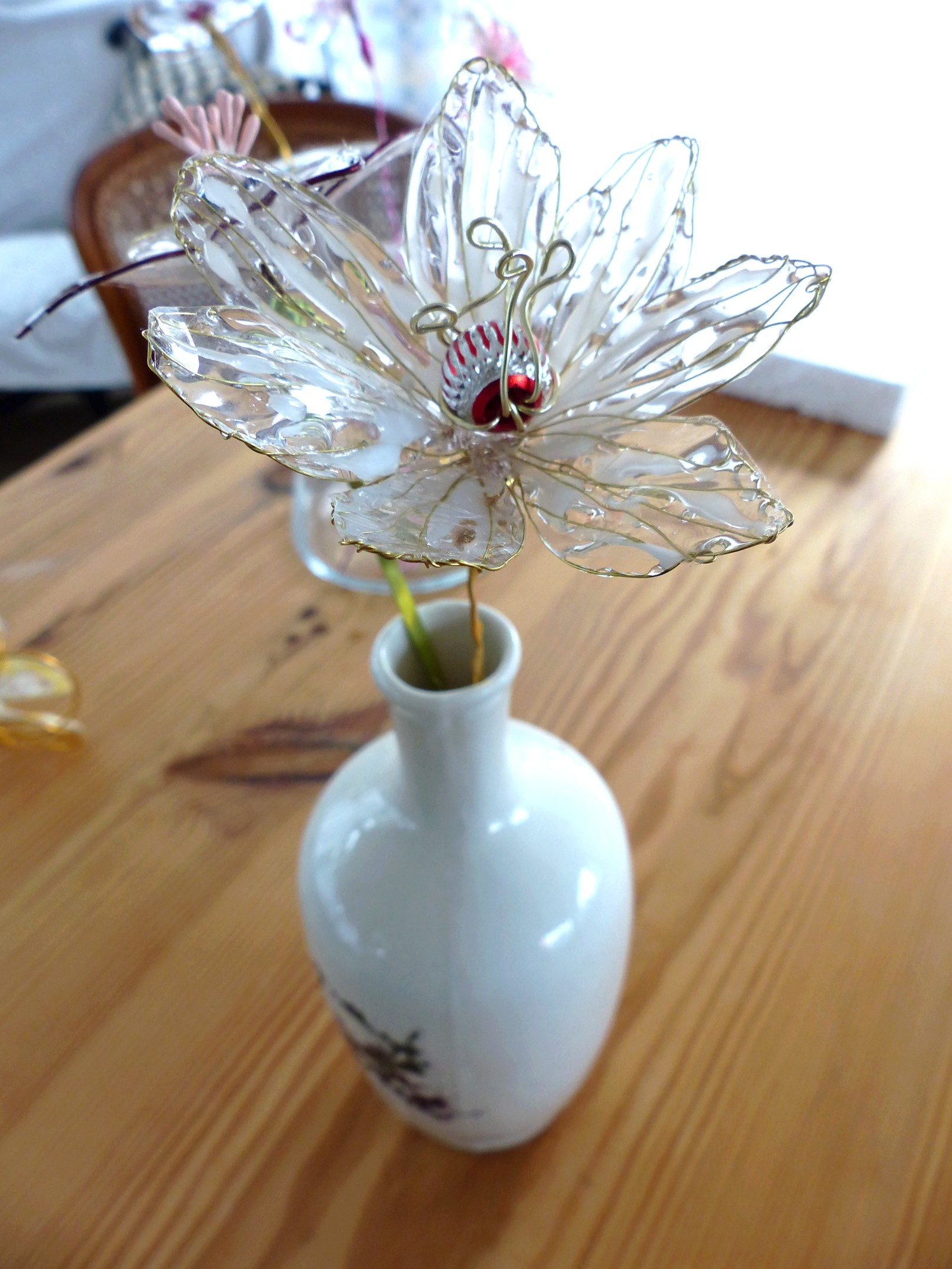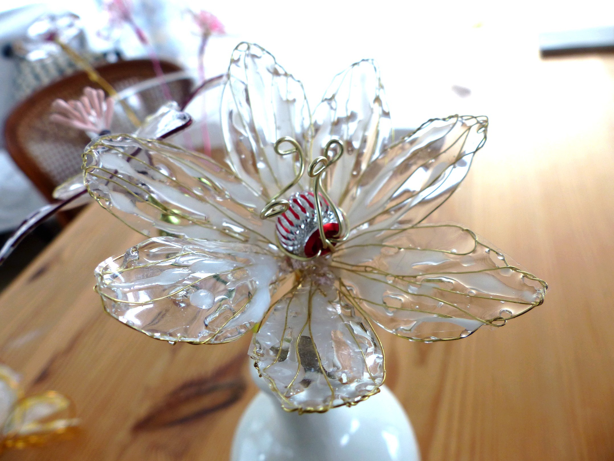 Fleur résine aux pétales translucides et touches de blanc, formées en fil alu doré très fin.