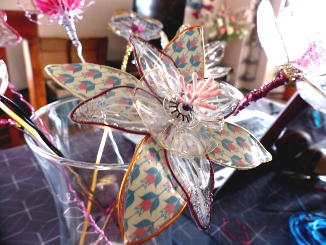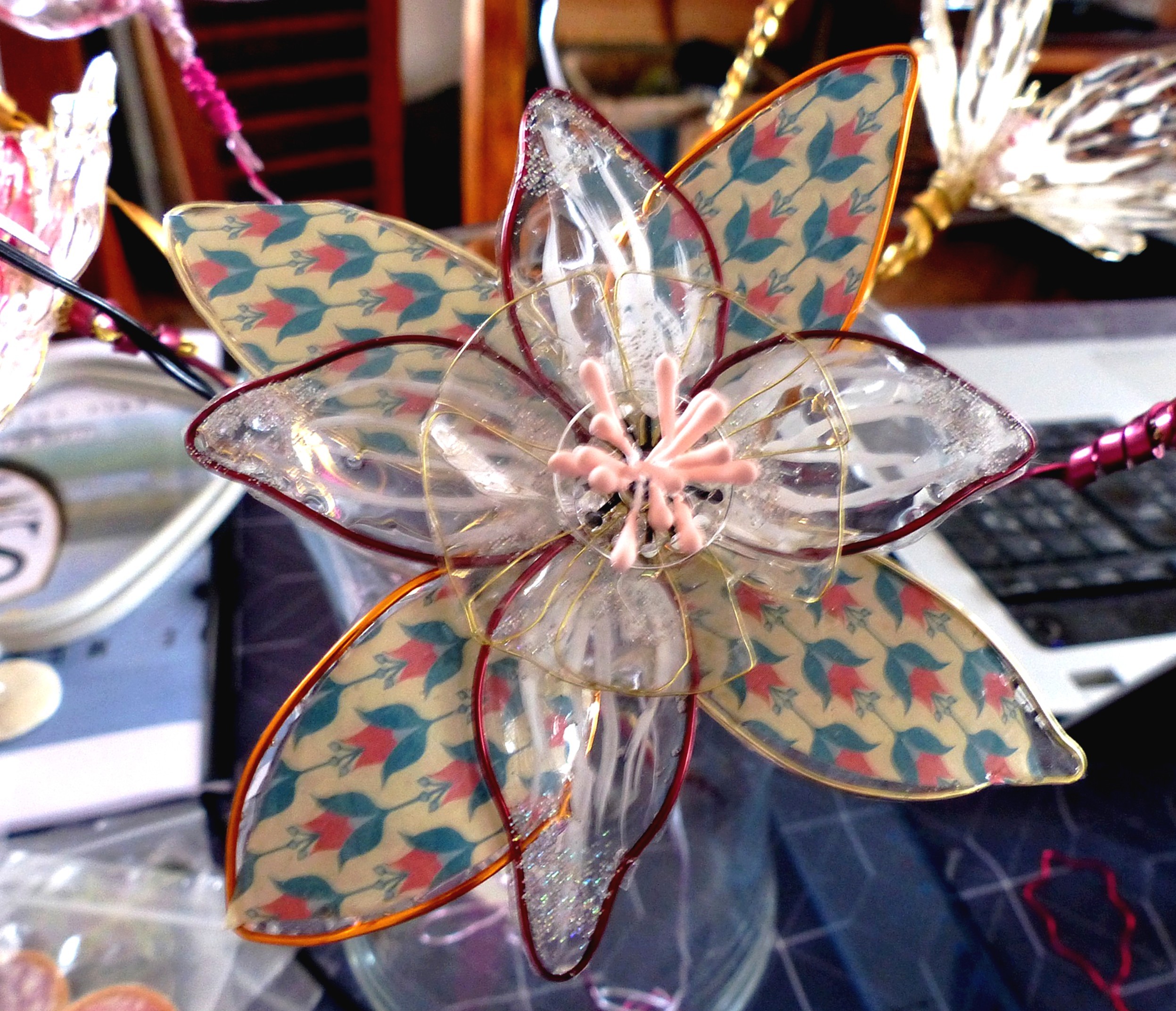 Belle fleur en résine, tons translucide et effet patchwork papier origami forment les pétales ainsi que des pistils de couleur rose clair pour raffinement.