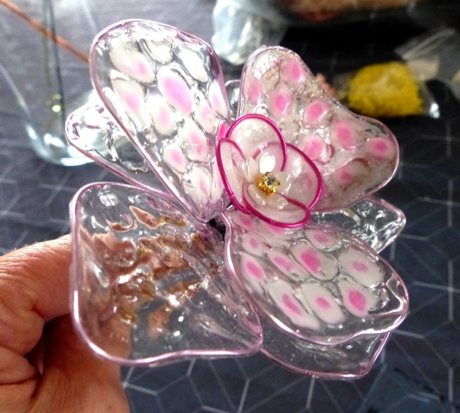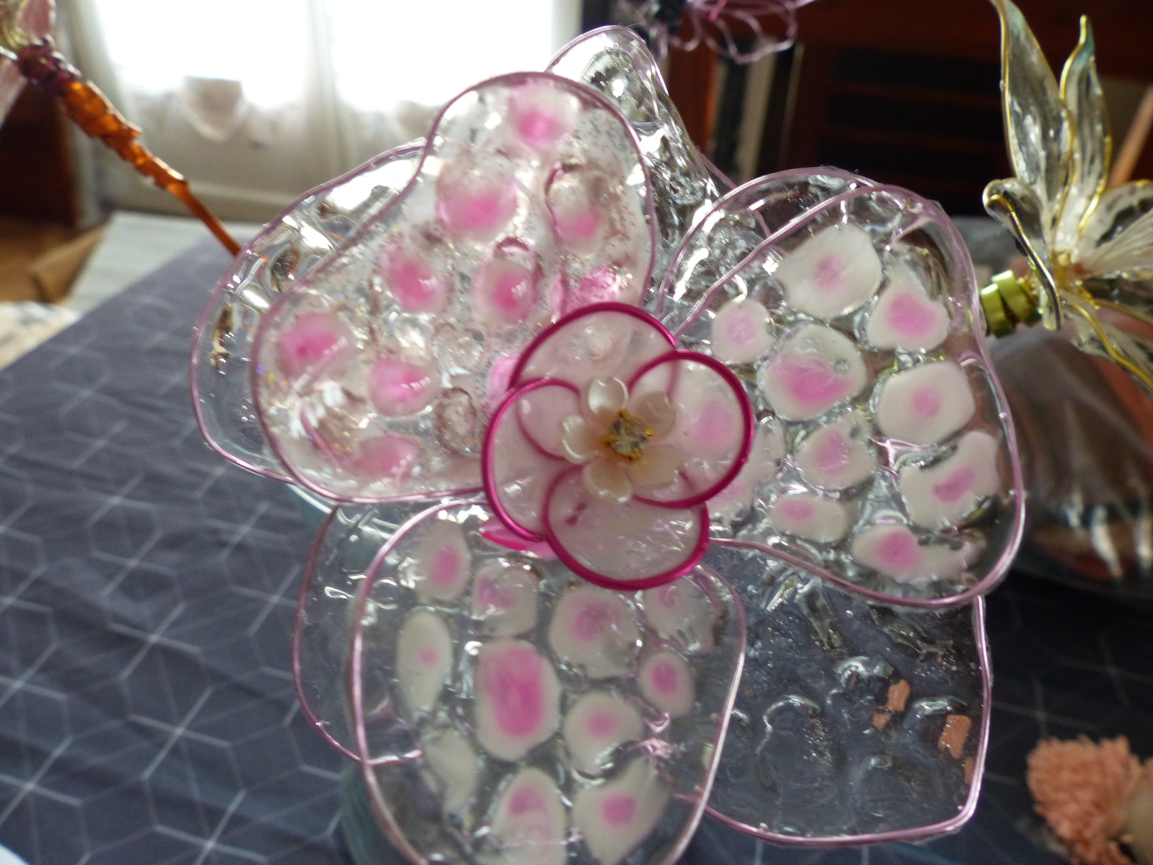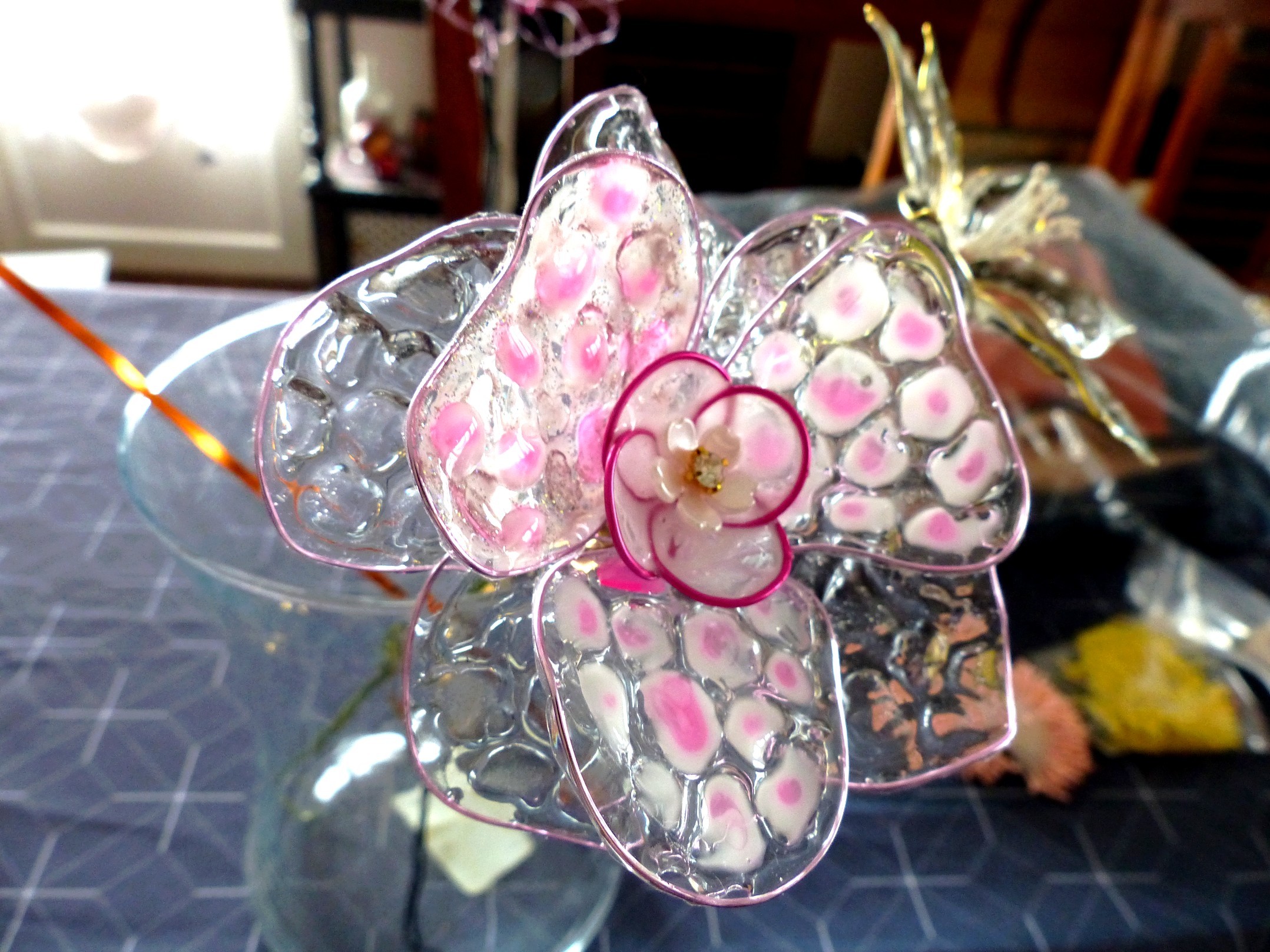 Grande fleur résine avec pétales alvéolées et tons tacheté blanc et rose pour fantaisie ainsi qu'une petite fleur rose vive au centre pour le cœur de la fleur.