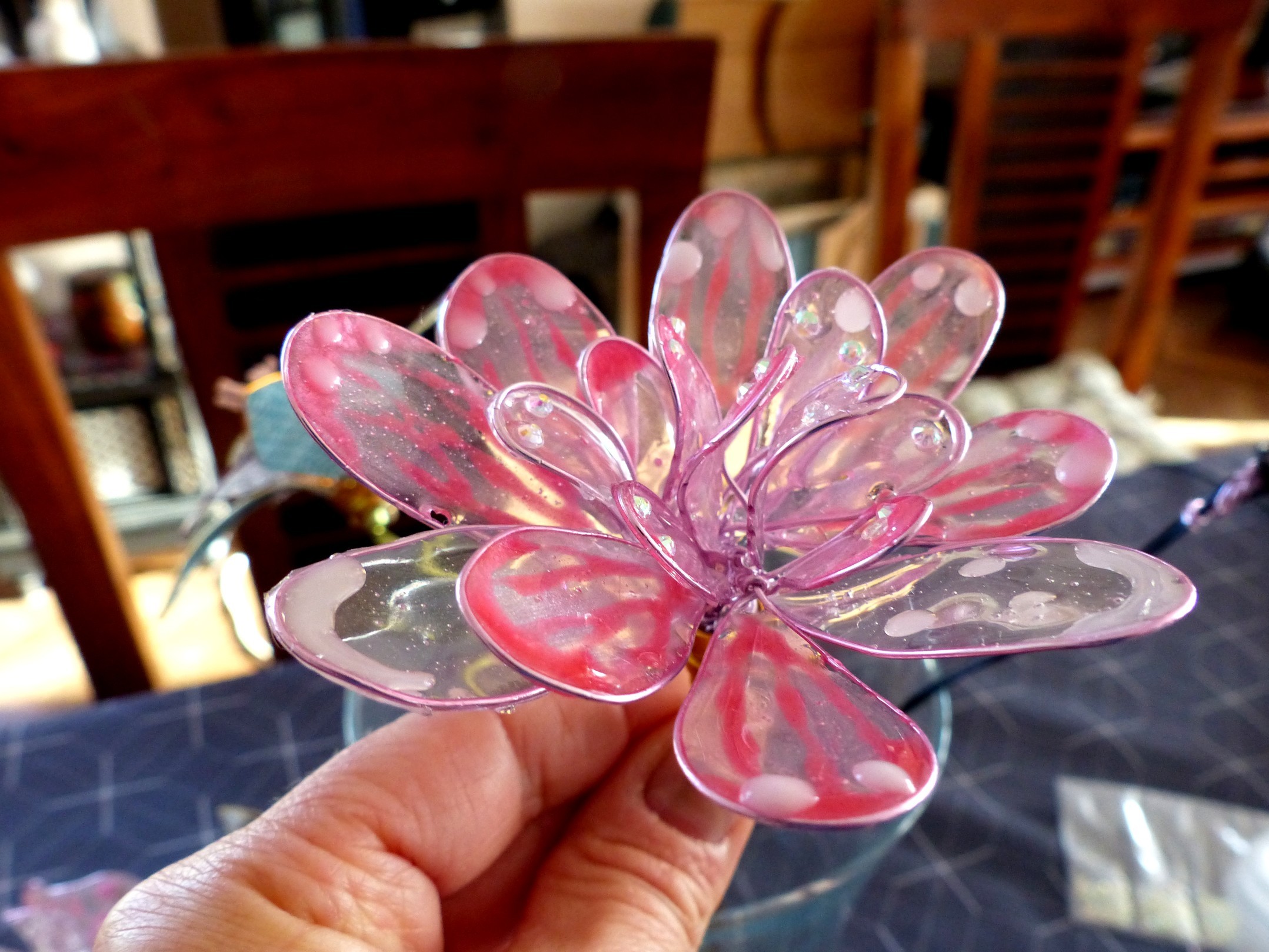 Belle fleur en résine rose poudré, petits rajouts de scintillants au coeur des nombreuses pétales, pour déco. aspect des pétales trillées avec un rose plus prononcé.