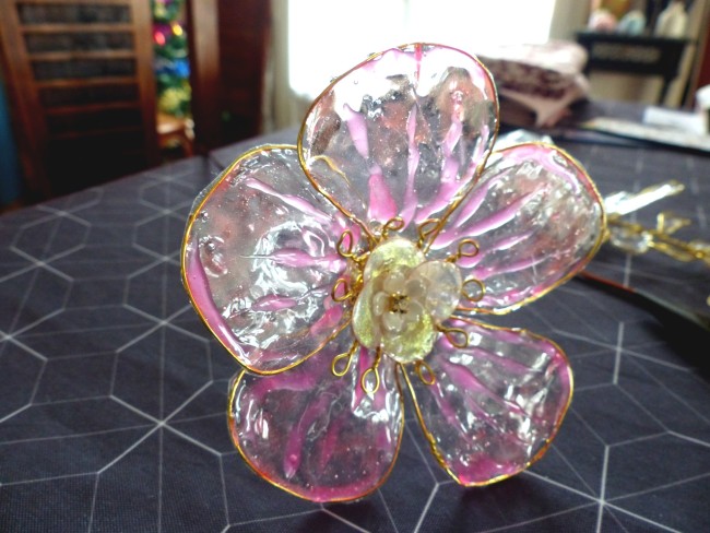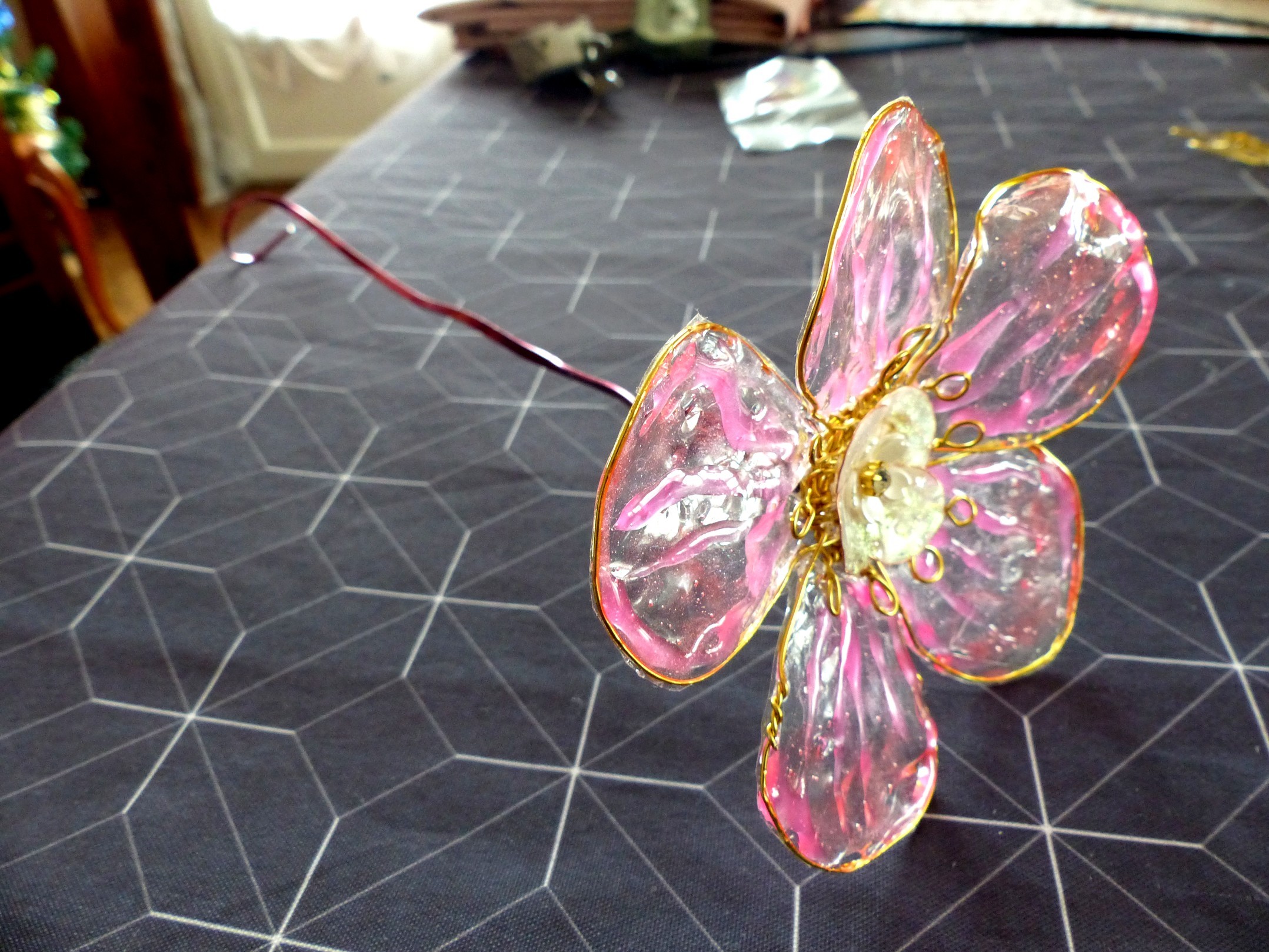 Taille de la fleur seule 11 cm de circonférence et 35 cm hauteur totale avec sa tige en alu plat. Peut être mise en soliflore ou bien en bouquet éternel.