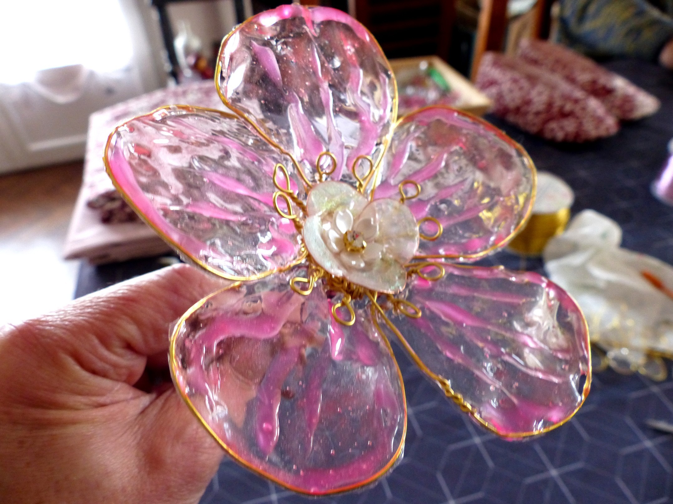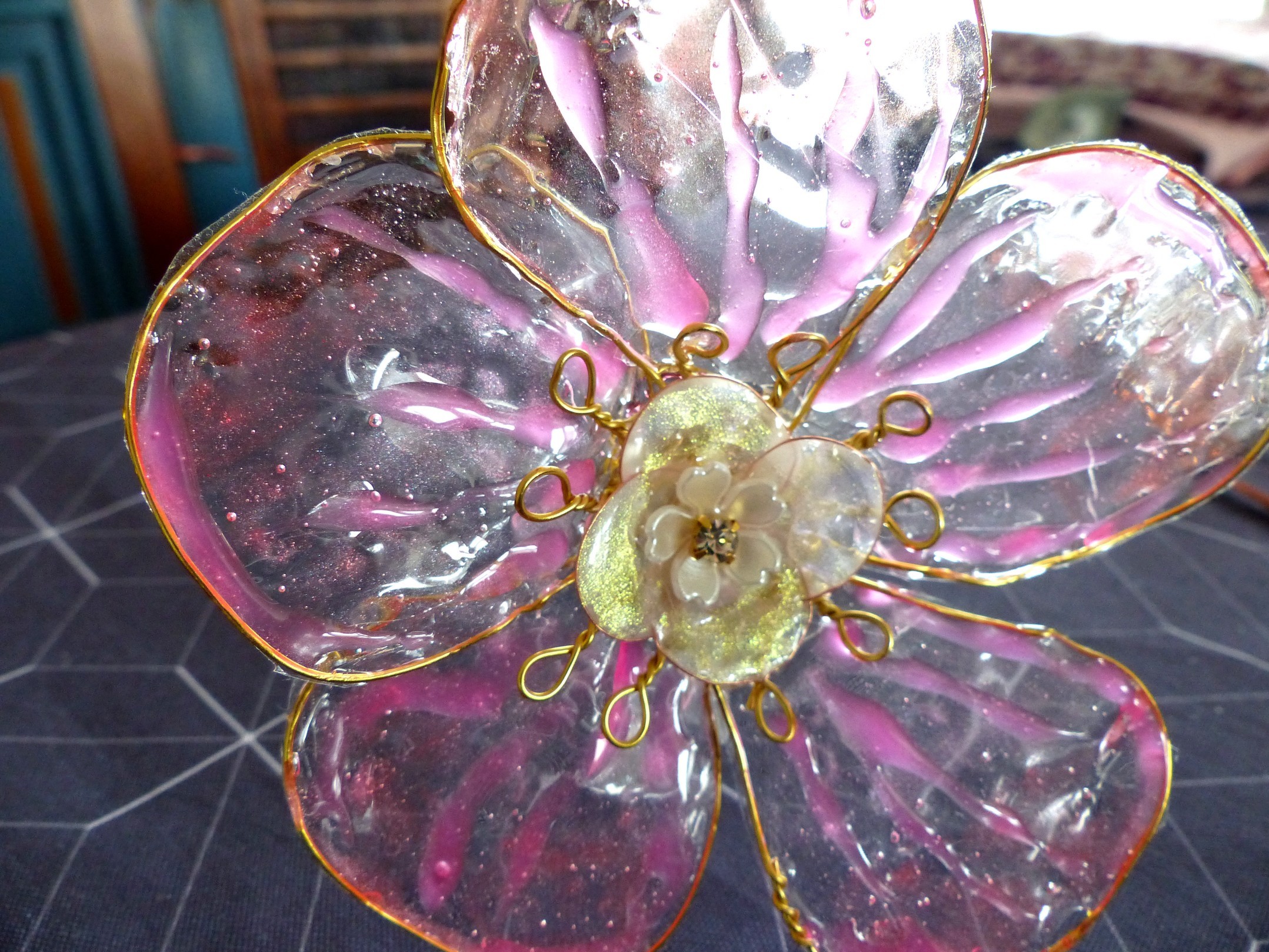 Grande fleur sakura en résine translucide et notes de rose pour fantaisie. Cœur avec une fleurette elle-même en résine fine et couleur nacrée.