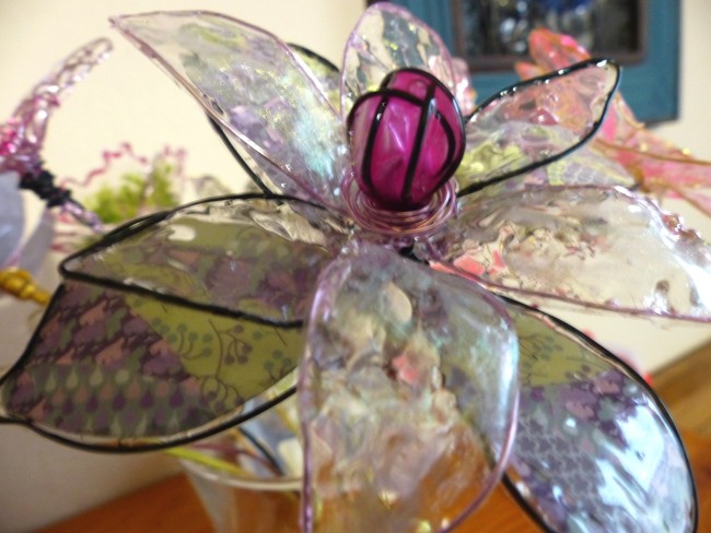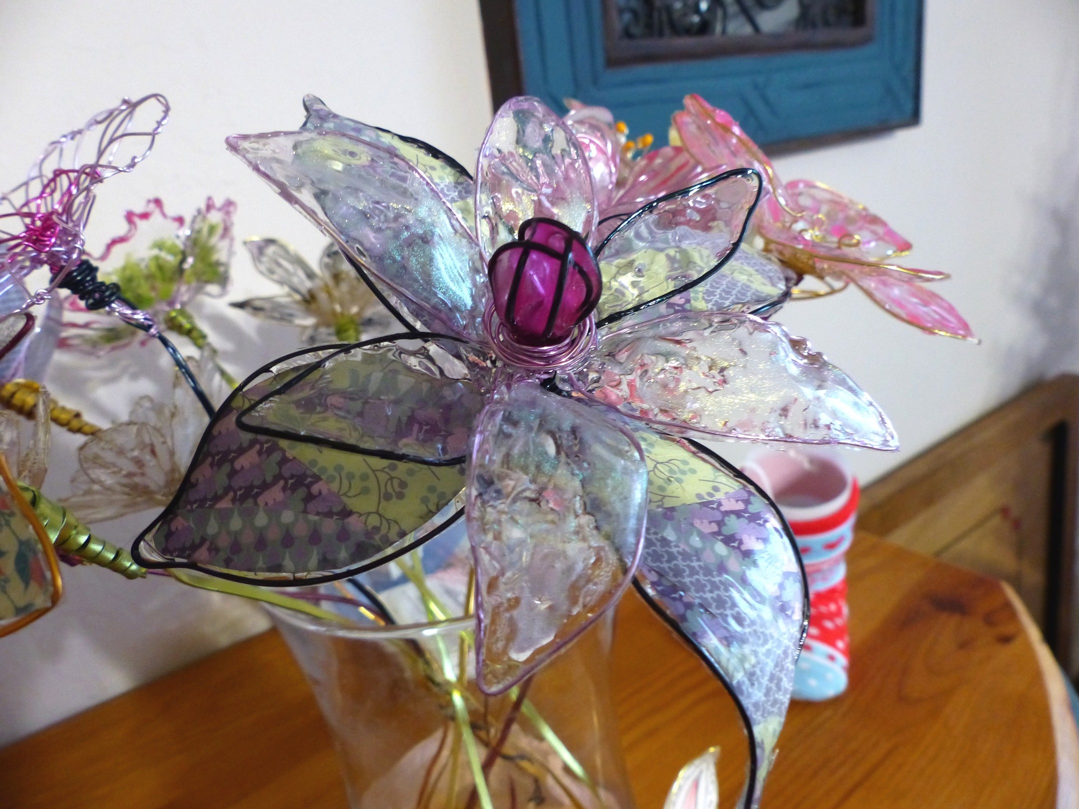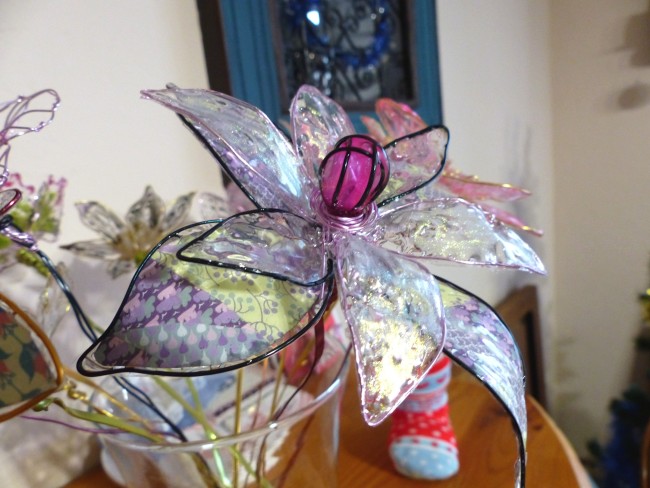 Grande fleur en résine au coeur rose, composée avec du fil alu noir souple . Quelques pétales réalisées en papier origami patchwork dans les tons de mauve et autres pétale en transparence...