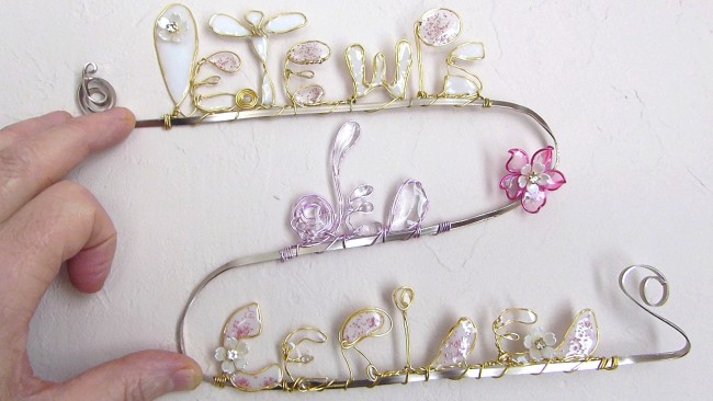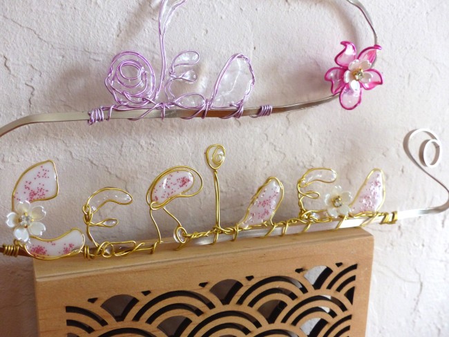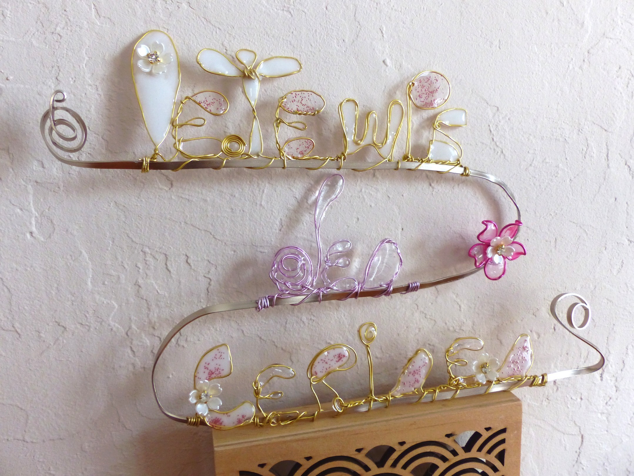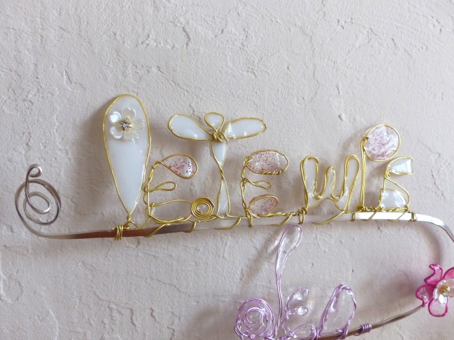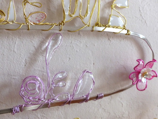 Ecriture "Le Temps des Cerises" résine et fil alu doré réalisé main et agrémenté de petites fleurettes sur un soutient de fil alu plat de couleur beige doré pour plus de tenue et permettre son accroche murale.