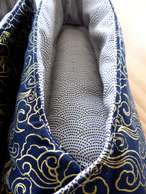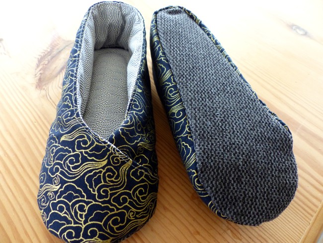 Semelle intérieure en feutrine épaisse recouverte de double ouate et du tissu intérieur discrets nippon. Semelle extérieure en tissu ameublement très chic et solide de couleur marron foncé.