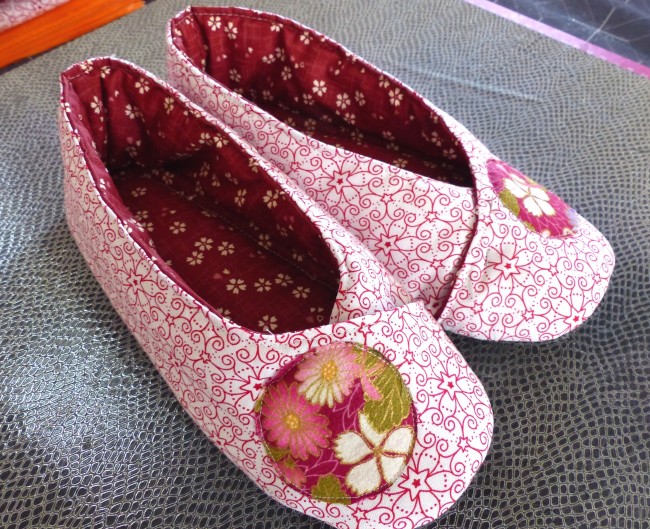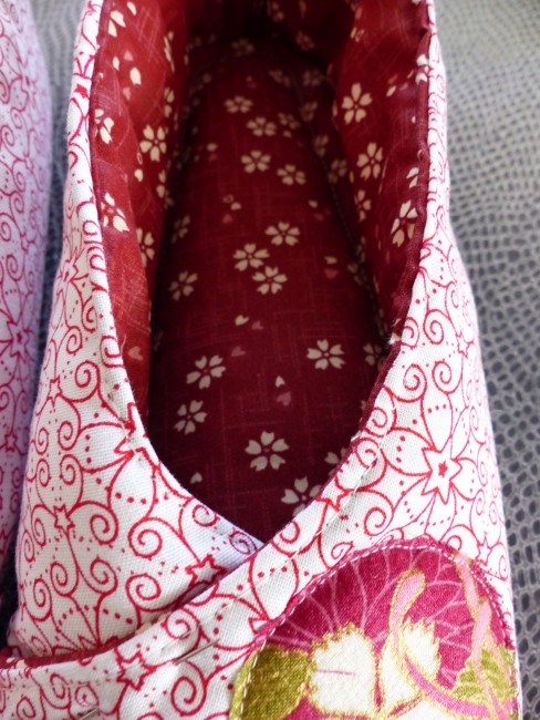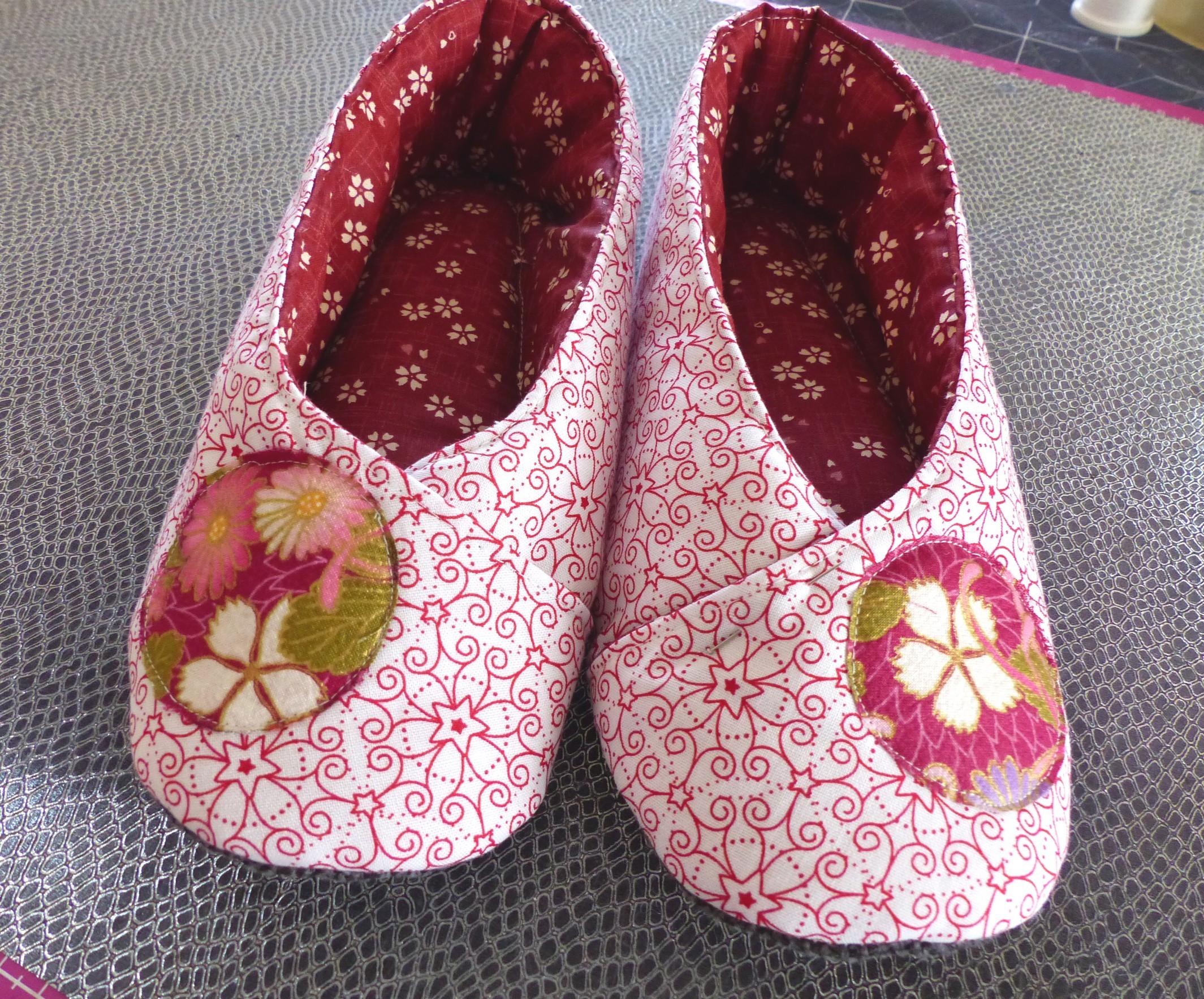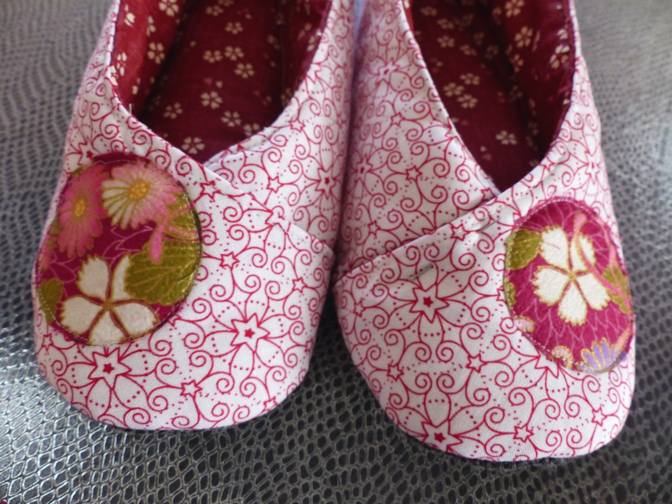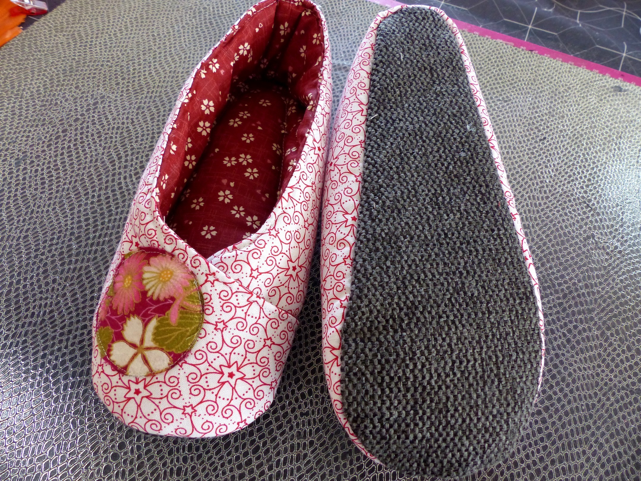 Semelle intérieure en feutrine épaisse recouverte de ouate et du tissu intérieur rouge fleuri, en accord avec le principal. Semelle extérieure en matière tissu ameublement solide et souple à la fois. Appliqué fleuri sur le dessus de pied.