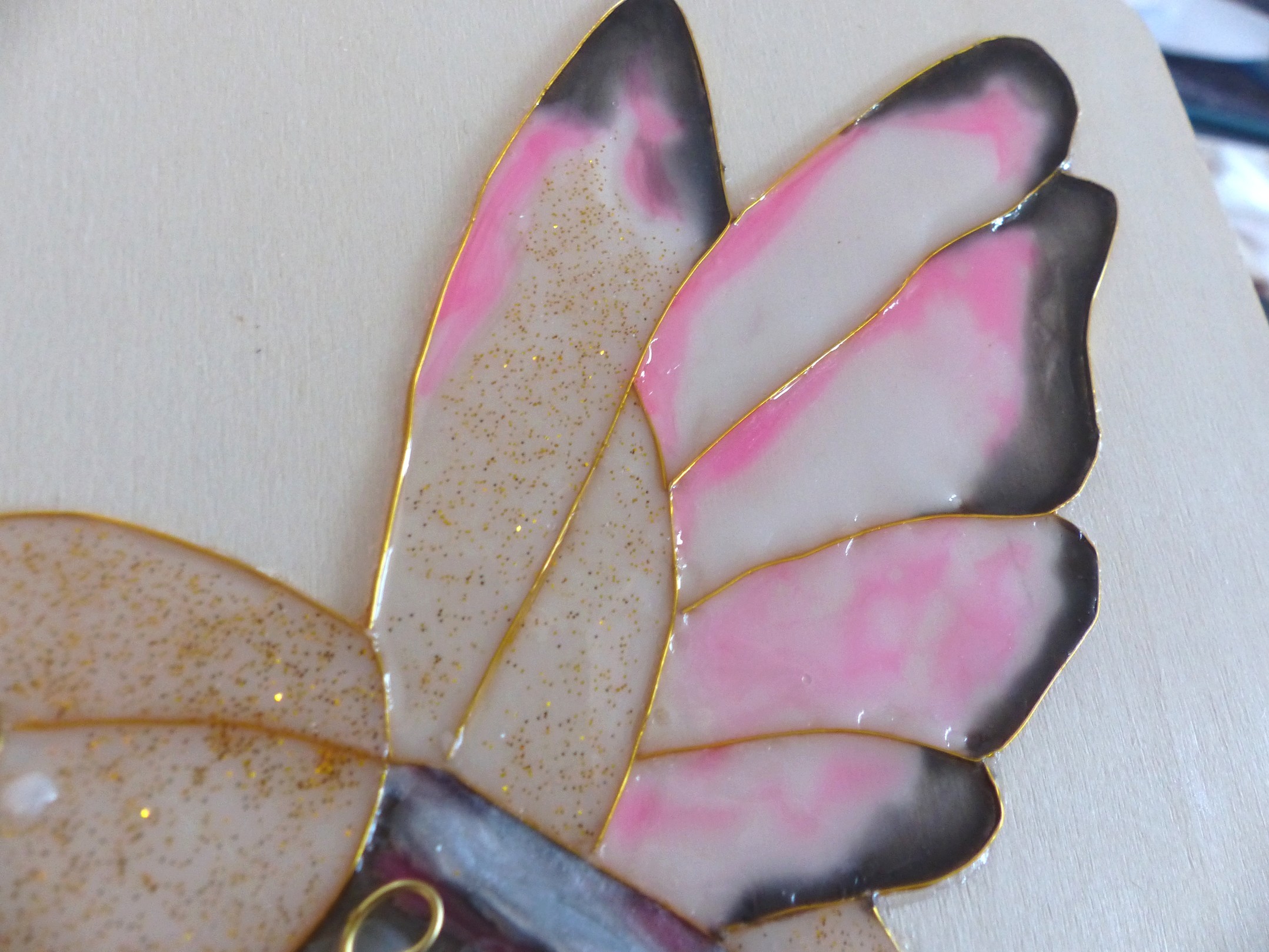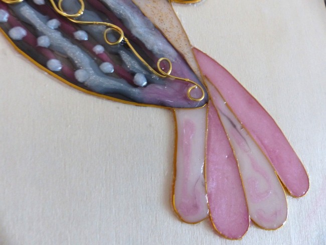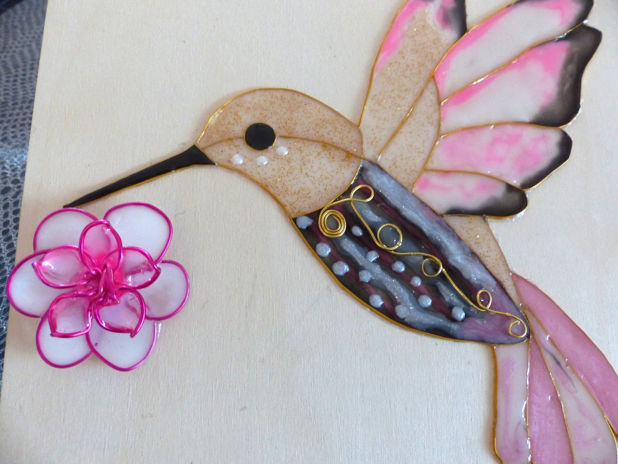 Bel oiseau Colibri réalisé avec la technique de cloisonnage et résine dans les tons de rose poudré, noir et pailleté doré. Ce motif repose sur un placage en tilleul fin d'une épaisseur de 3 mm au fond clair finition vernis incolore satiné.