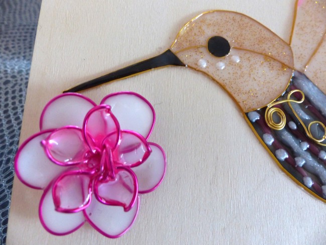 Colibri en cloisonnage et résine rose - noir et fil doré